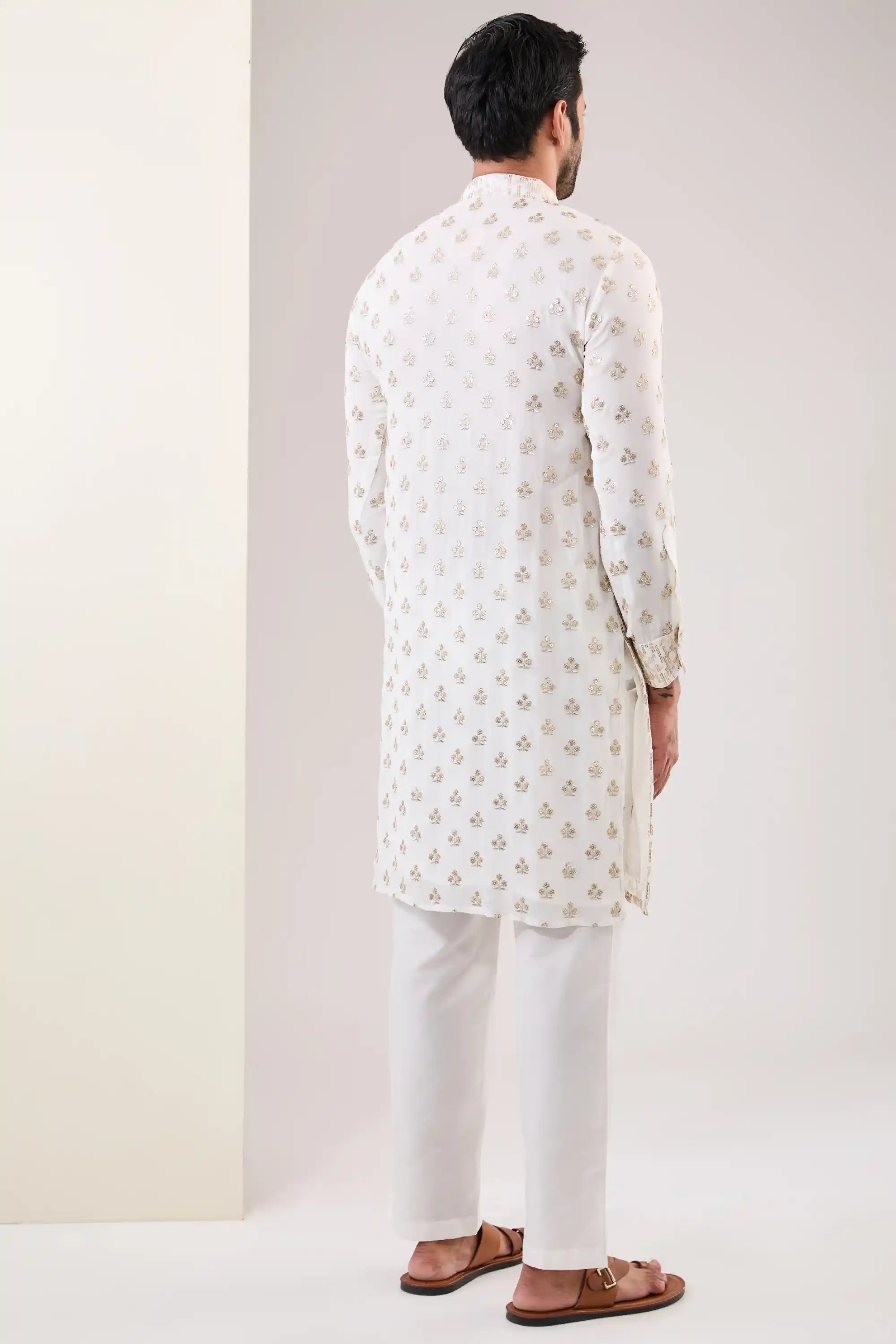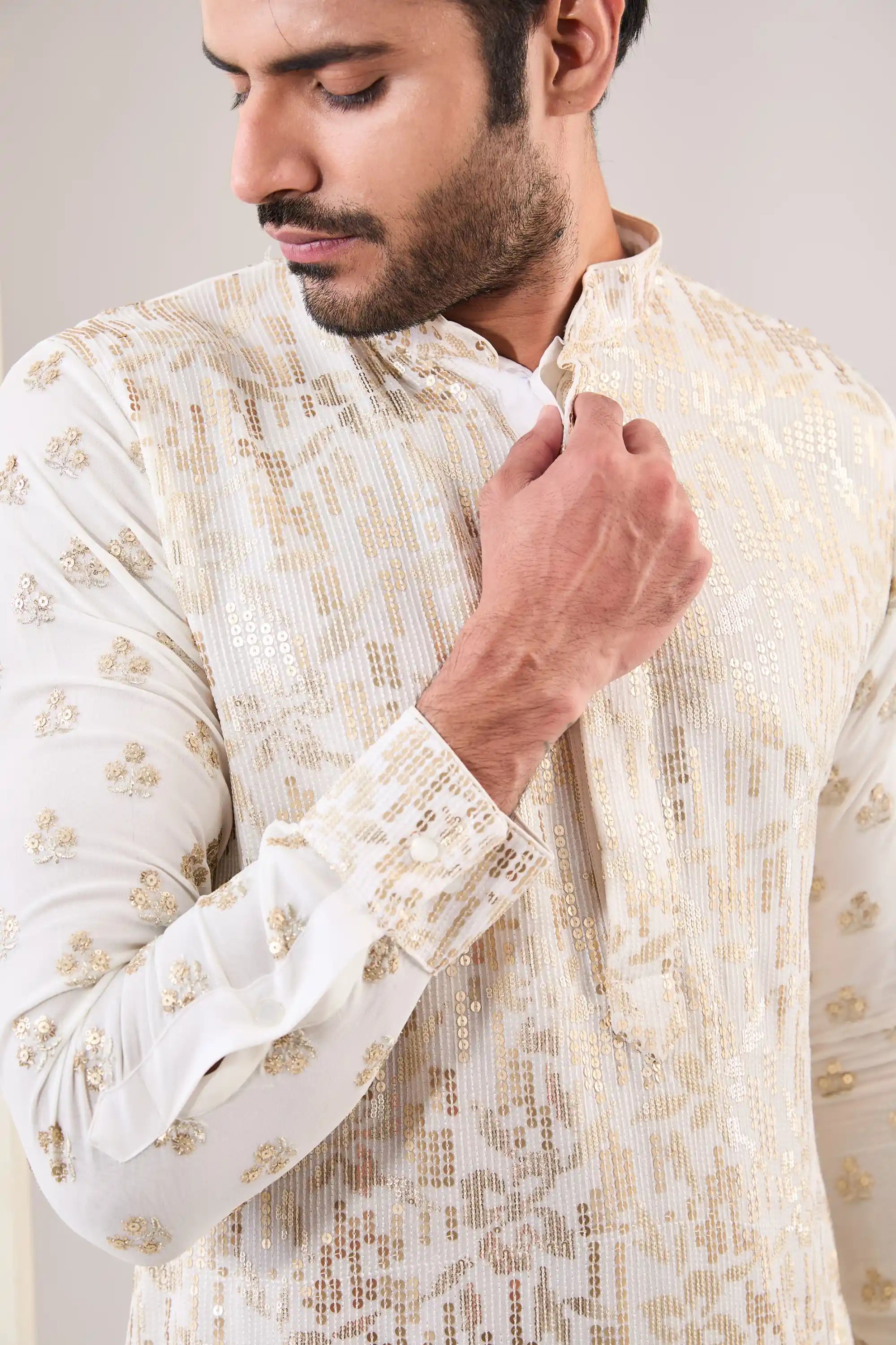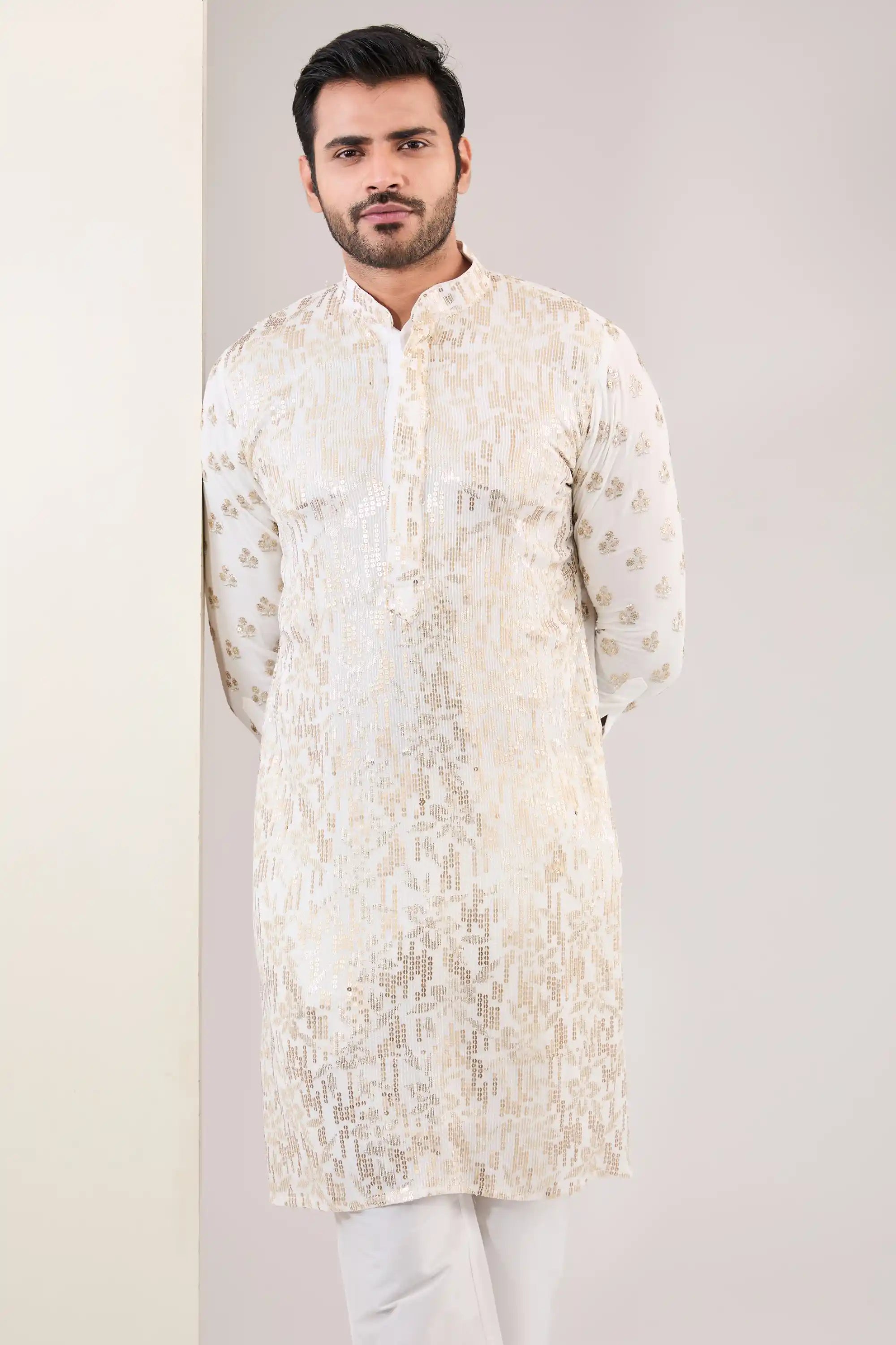 Illuminate your wardrobe with this exquisite off-white georgette kurta, fully embroidered and adorned with shimmering sequins for a touch of elegance. Paired with matching cotton silk pants, this stunning ensemble is perfect for festive occasions, seamlessly combining grace with modern flair.
