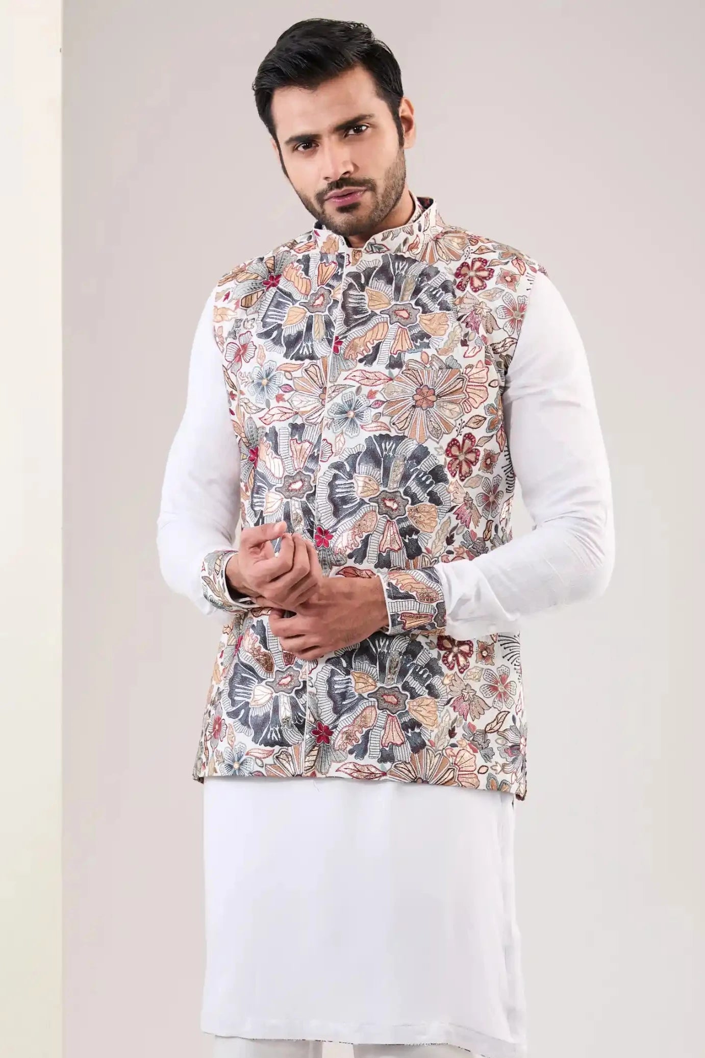 Elevate your look with this stunning off-white silk bundi, featuring exquisite multi-thread and metal embroidery. The intricate detailing adds a touch of elegance, making it perfect for formal events or festive occasions. This bundi is a stylish addition to any wardrobe, effortlessly blending traditional charm with contemporary flair.