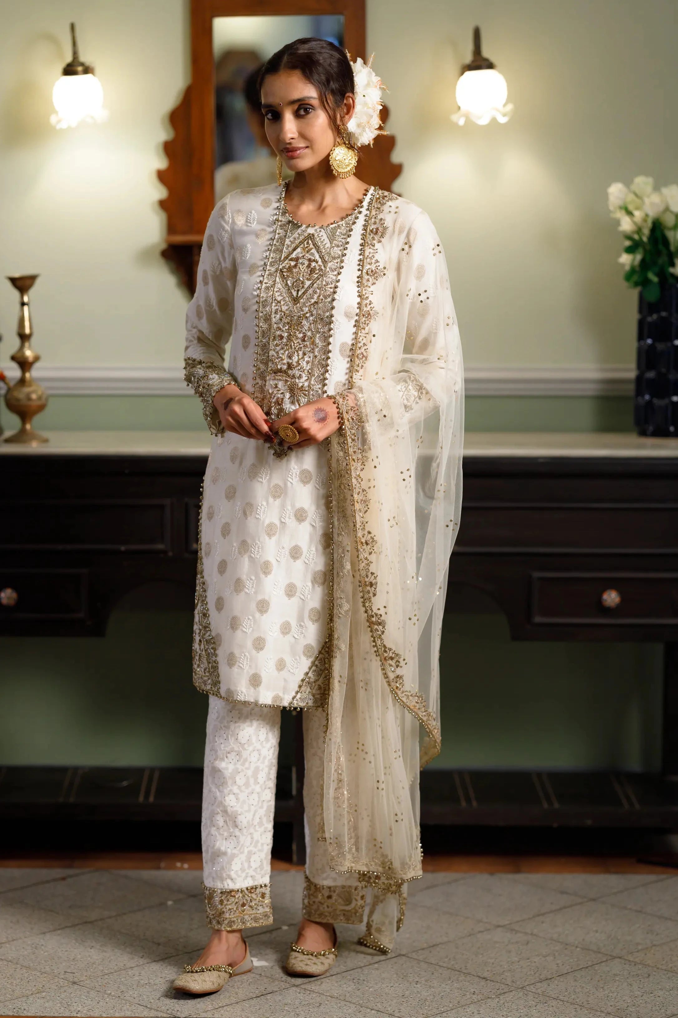 The Gauhar Off-White Straight Embroidered Yoke Kurta offers a sleek, modern look with intricate embroidery on the yoke. Paired with stylish straight pants and a beautifully embroidered dupatta, this elegant set is perfect for a variety of occasions, including weddings, festivals, or formal events. The minimalist design with detailed craftsmanship brings together comfort and sophistication in one stunning ensemble.