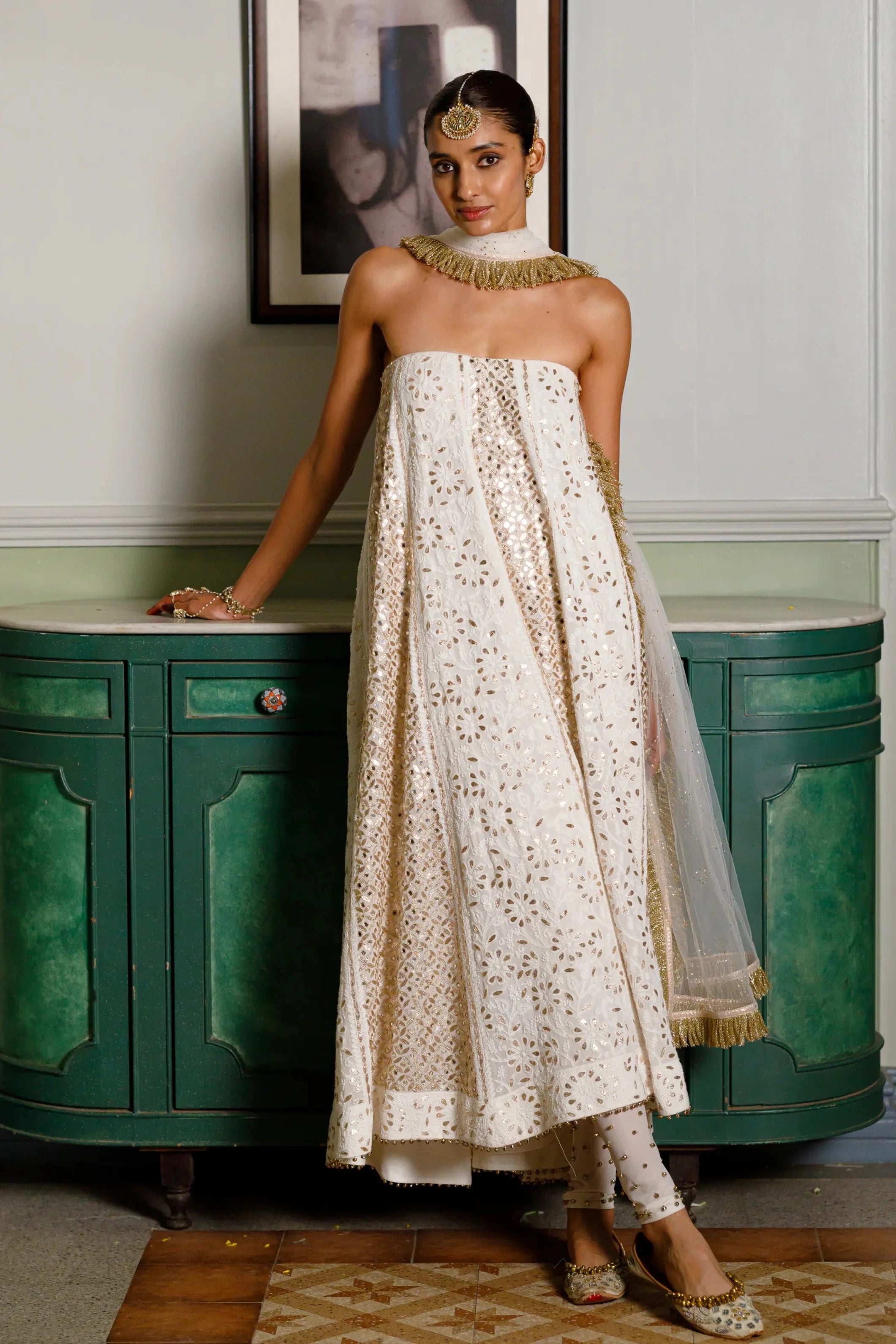 This elegant off-white tube Anarkali combines modern style with traditional charm. The form-flattering tube Anarkali is complemented by a beautifully embroidered churidar and a delicate dupatta, creating a sophisticated and graceful look. Perfect for weddings, festivals, or any special occasion, this ensemble offers the perfect balance of contemporary elegance and classic design.