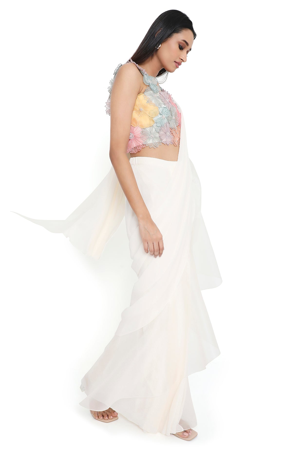 Offwhite 3d flower choli and pre-stitched saree