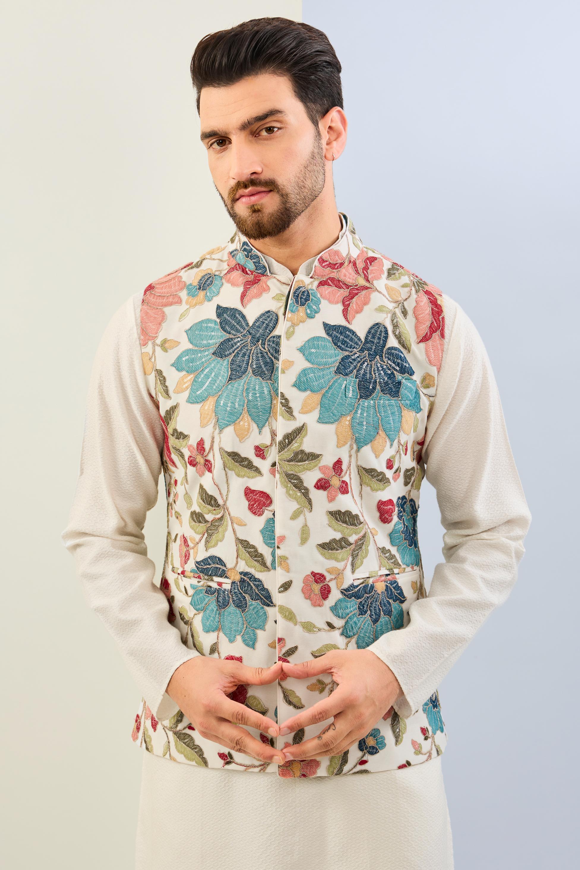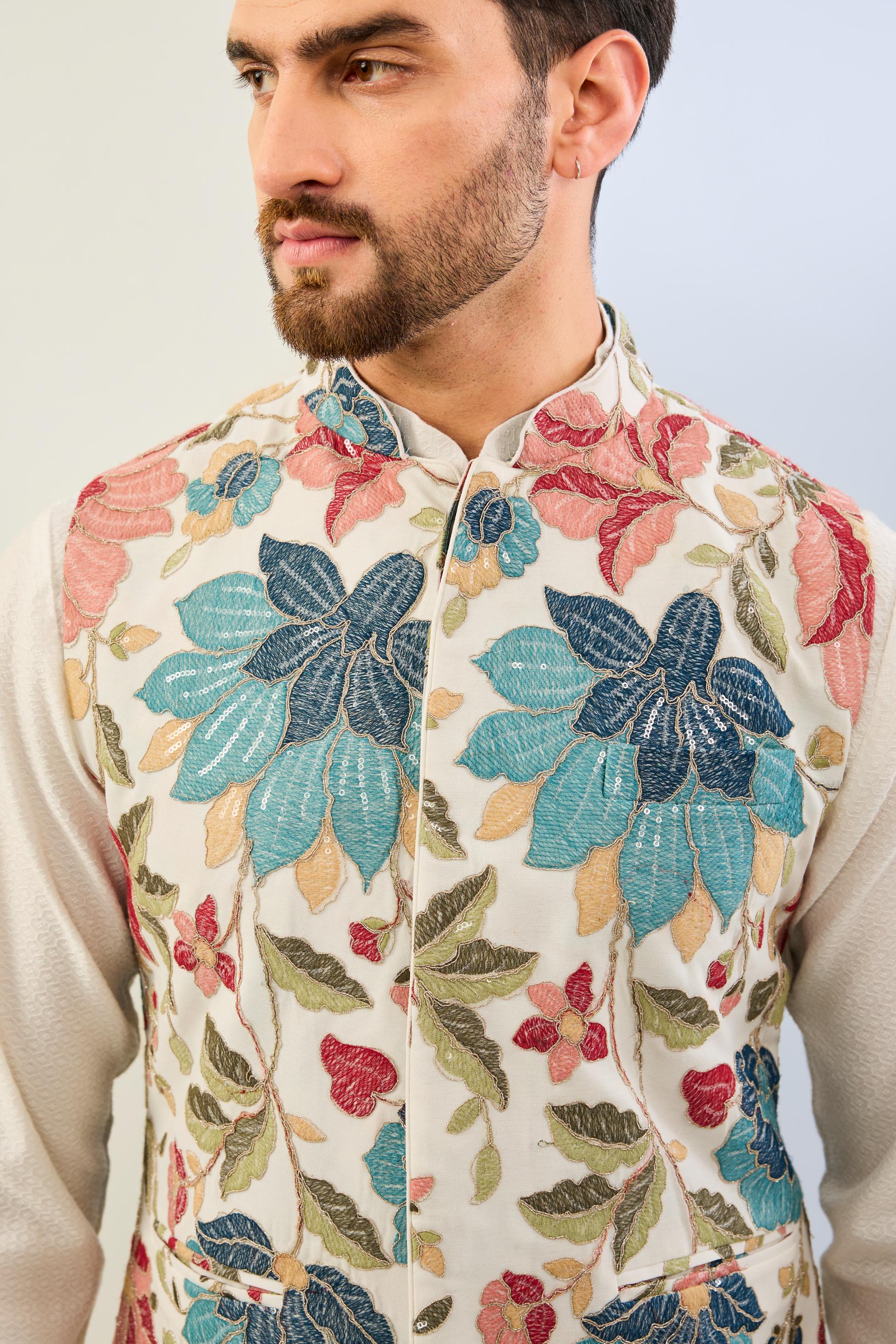 Offwhite georgette lined fully embroidered bundi with silk kurta and matching cotton silk pant