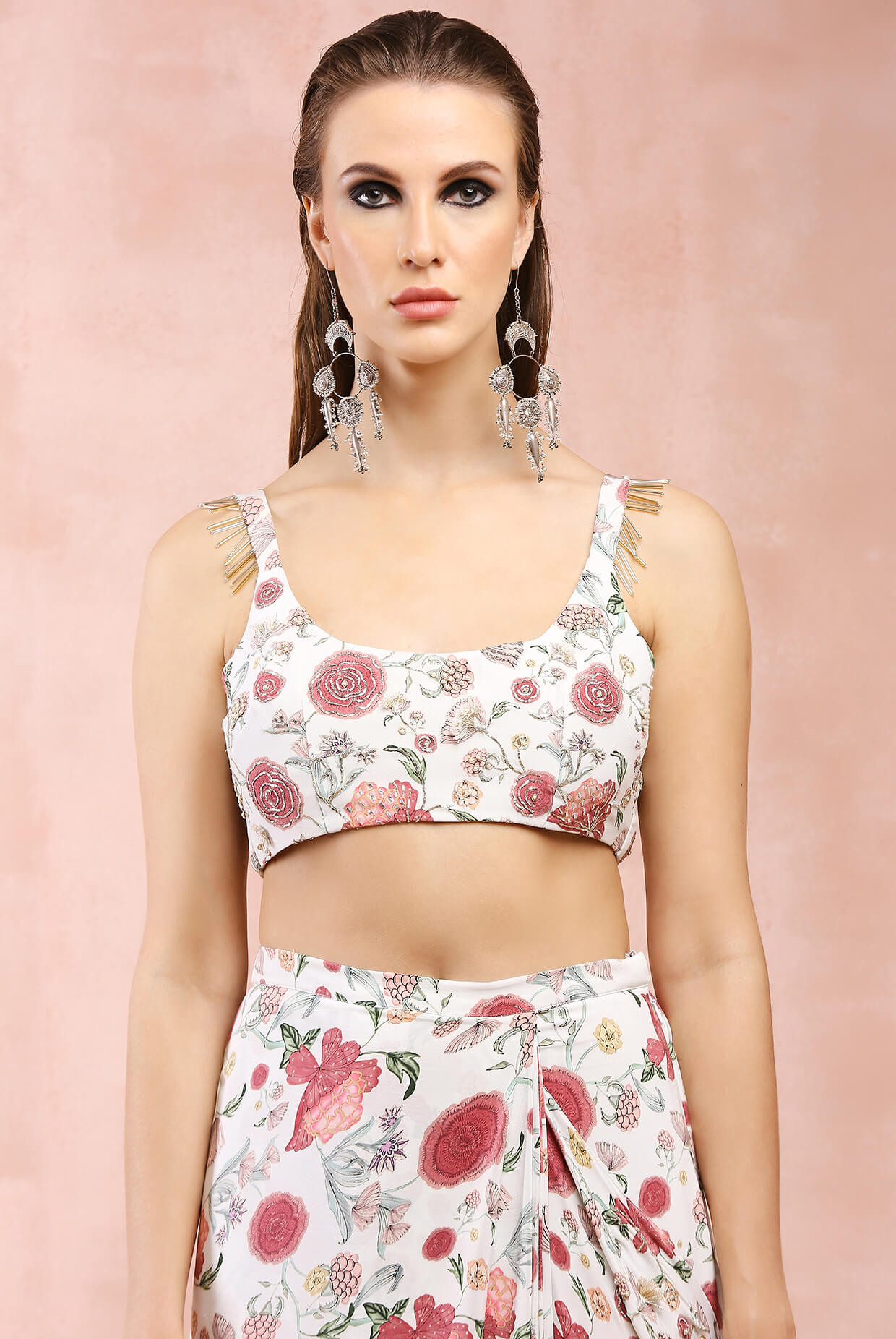 Elevate your elegance with our Off-White Gulbagh Print Crepe Choli and Pre-Stitched Frill Saree Set. The choli features a sophisticated gulbagh print with exquisite embroidery, adding a touch of timeless charm. Paired with a pre-stitched frill saree, this ensemble combines the classic grace of traditional sarees with modern convenience. Ideal for weddings and special events, it offers a seamless blend of style and sophistication.