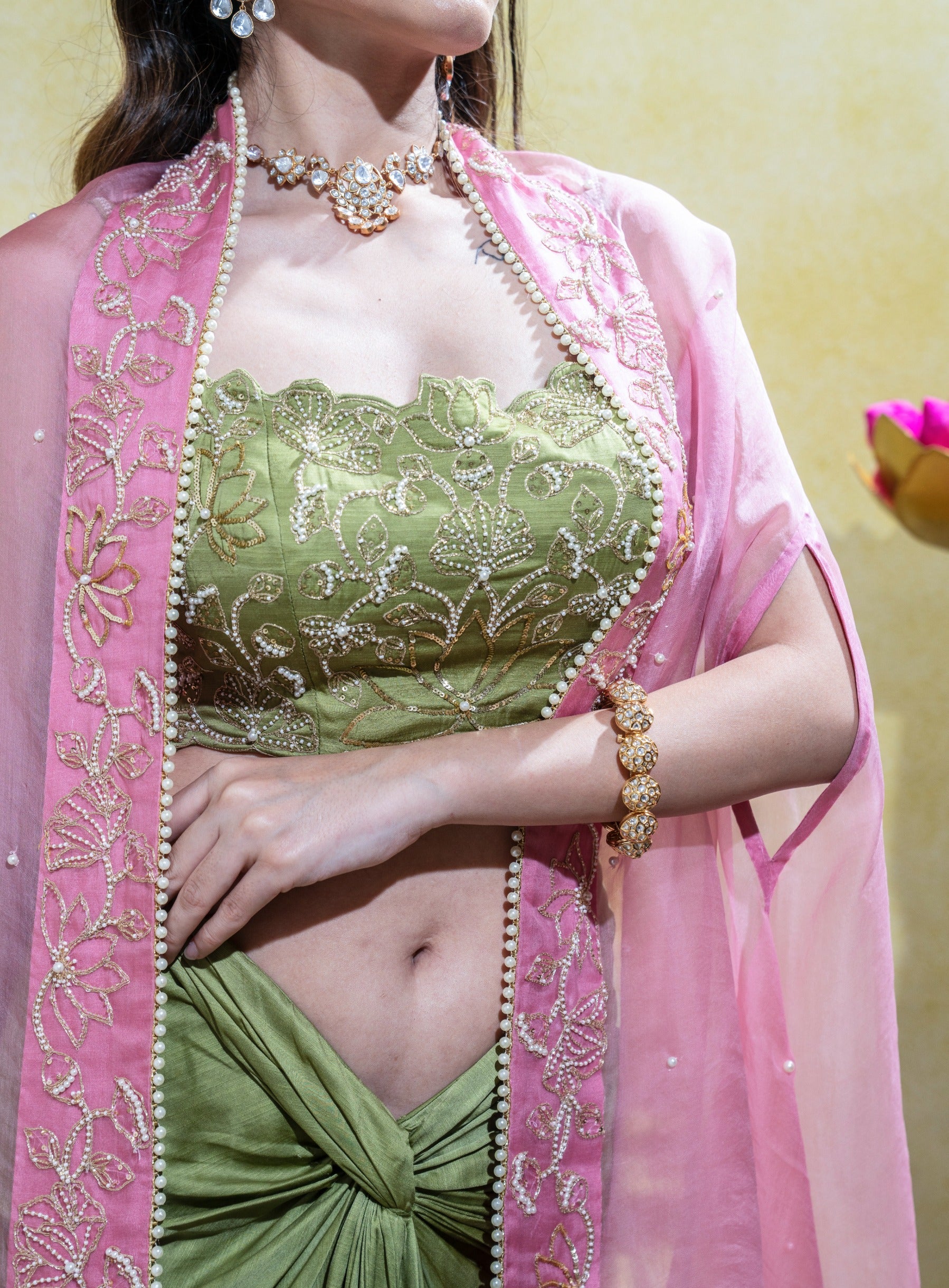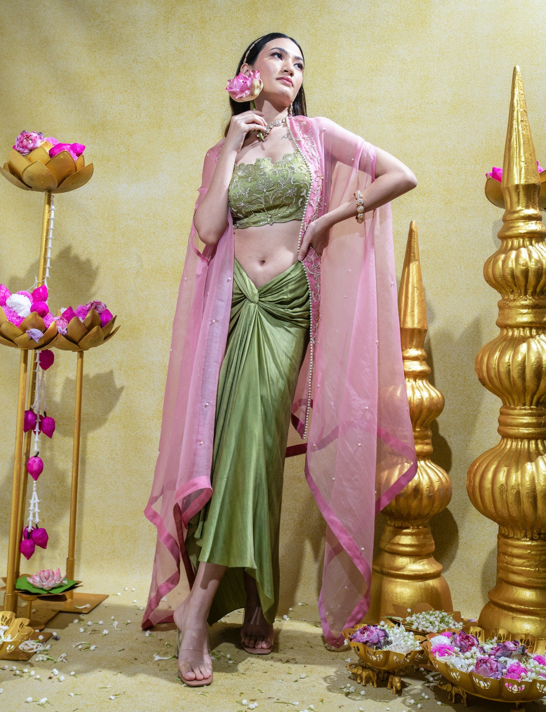 Unveil an enchanting blend of elegance and modern sophistication with our olive embroidered bralet, draped skirt, and soft pink embroidered silk organza cape ensemble. The olive bralet, adorned with intricate embroidery, provides a rich, earthy tone that enhances its luxurious appeal. Complemented by a gracefully draped skirt, this combination creates a seamless flow and refined silhouette. The outfit is elevated further by a soft pink silk organza cape, delicately embroidered to add a touch of ethereal charm. Perfect for any special occasion, this ensemble offers a striking balance of classic elegance and contemporary design.