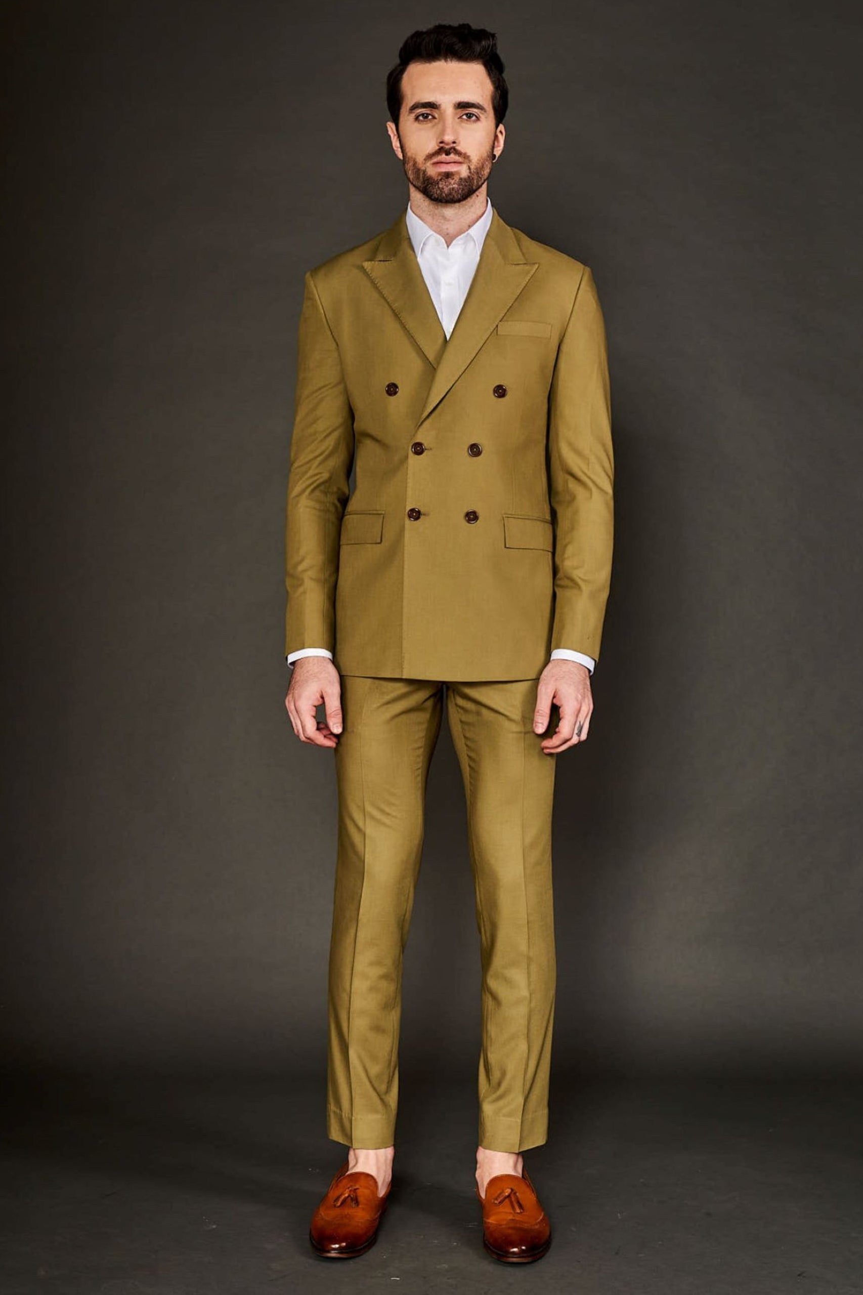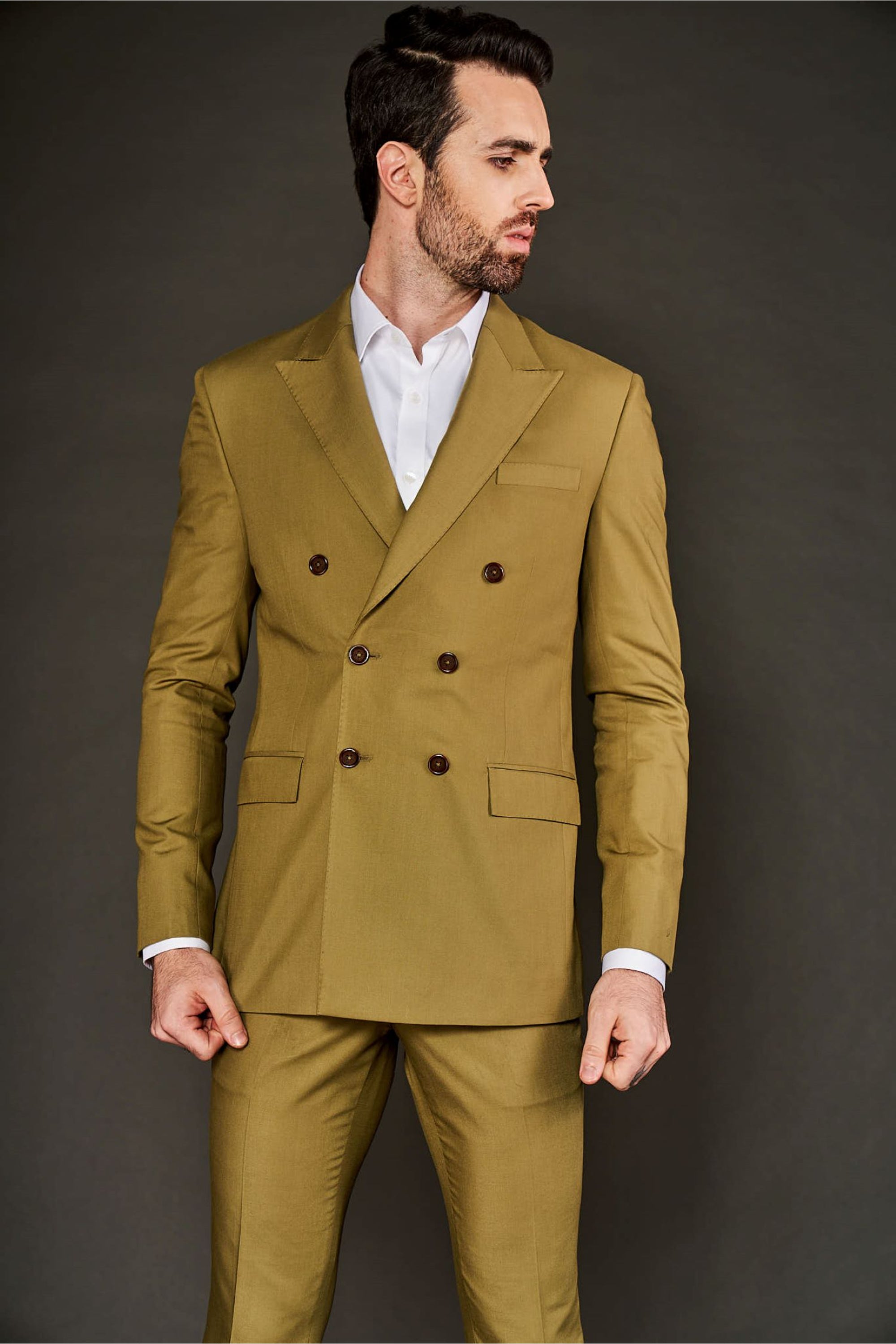 Exude elegance with this Olive Green Double-Breasted Suit. Crafted with precision, it offers a refined silhouette with a timeless double-breasted design and peak lapels. The rich olive green hue adds a touch of sophistication, making it ideal for both formal events and stylish business occasions. Pair it with a white shirt for a striking, polished look.