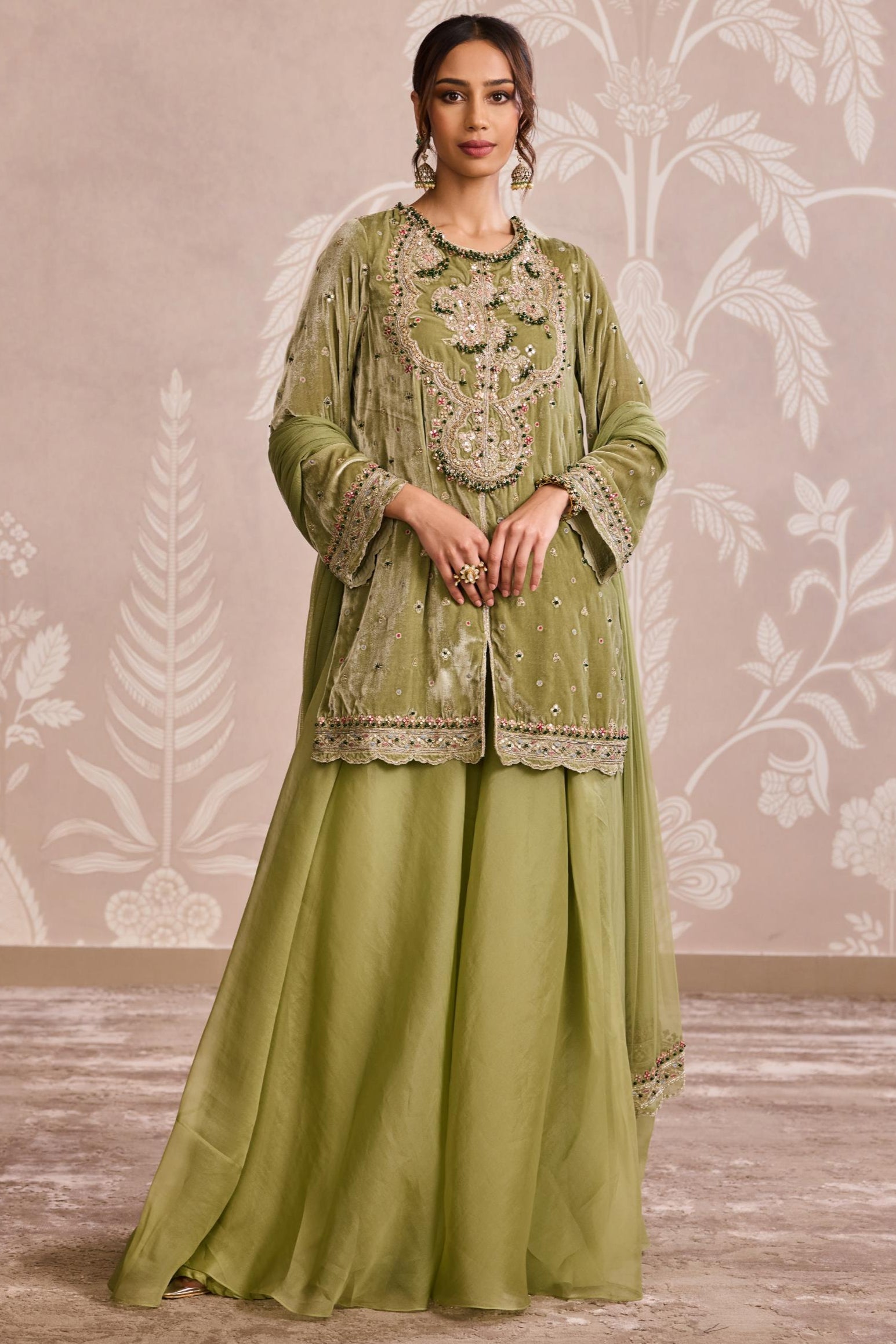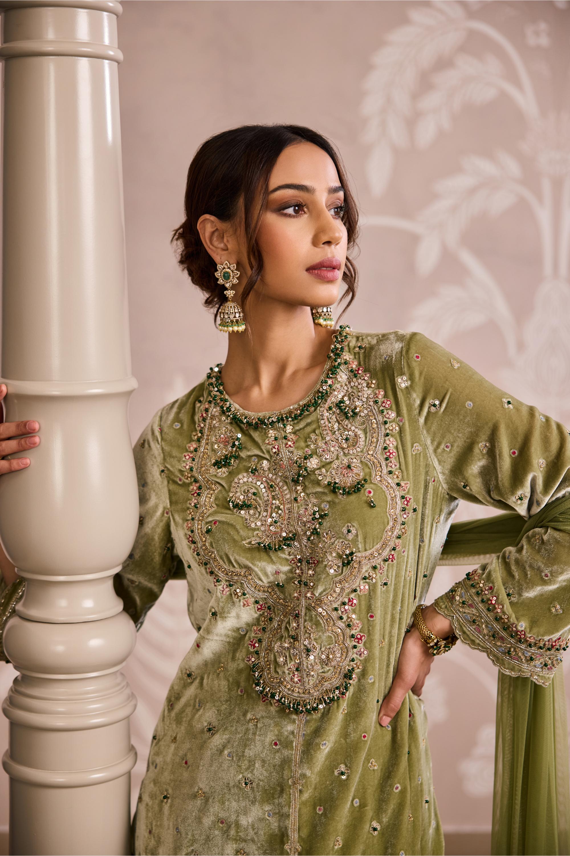 A perfect blend of textures, this Nooreh Ever After set pairs a lush olive-green sharara pants. The rich hue evokes elegance, while the kurta's delicate embroidery adds festive charm. Light, flowing sharara pants bring ease and movement, ideal for long celebrations. Paired with a sheer dupatta, the ensemble is both regal and romantic. This is a standout look for intimate weddings or festive evenings.