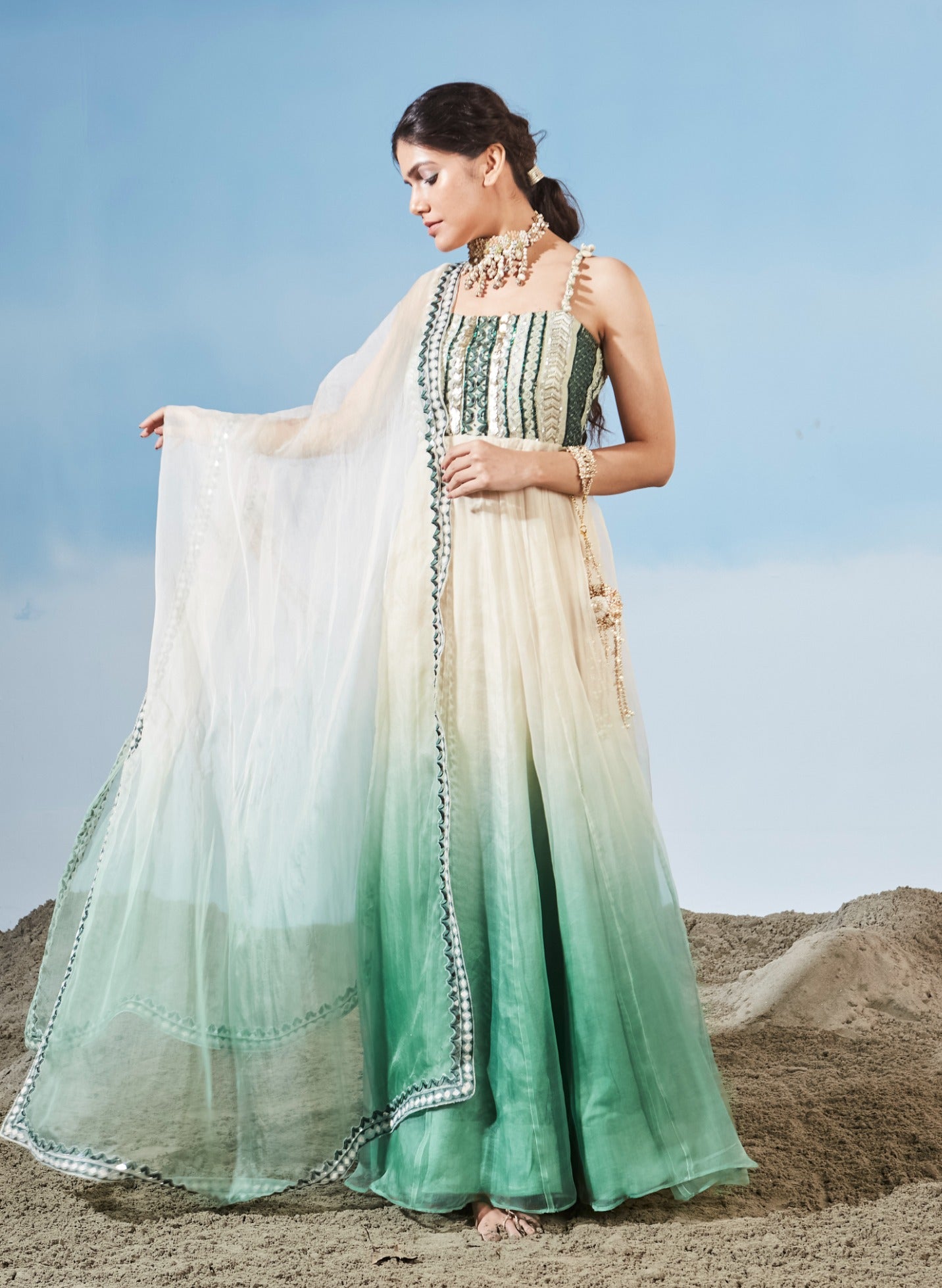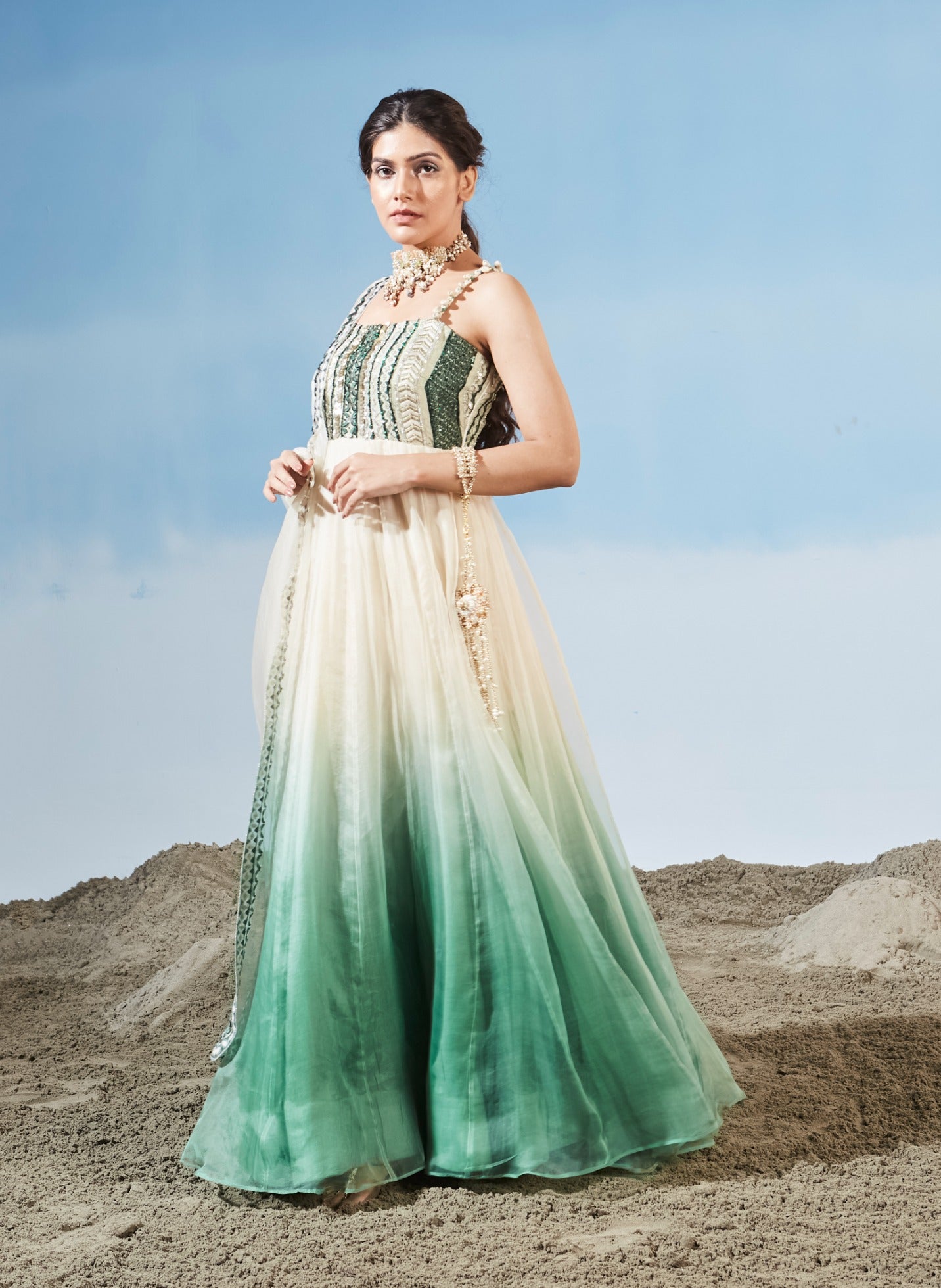 Step into elegance with our Ombré Anarkali, featuring a beautifully embroidered bust and paired with a delicate organza dupatta. This stunning anarkali showcases a mesmerizing ombré effect, blending hues seamlessly for a sophisticated gradient look. The intricately embroidered bust adds a touch of luxury and refinement, while the ethereal organza dupatta completes the ensemble with its airy, graceful drape. Perfect for festive occasions and special events, this outfit combines classic charm with modern flair, ensuring you captivate with every step.