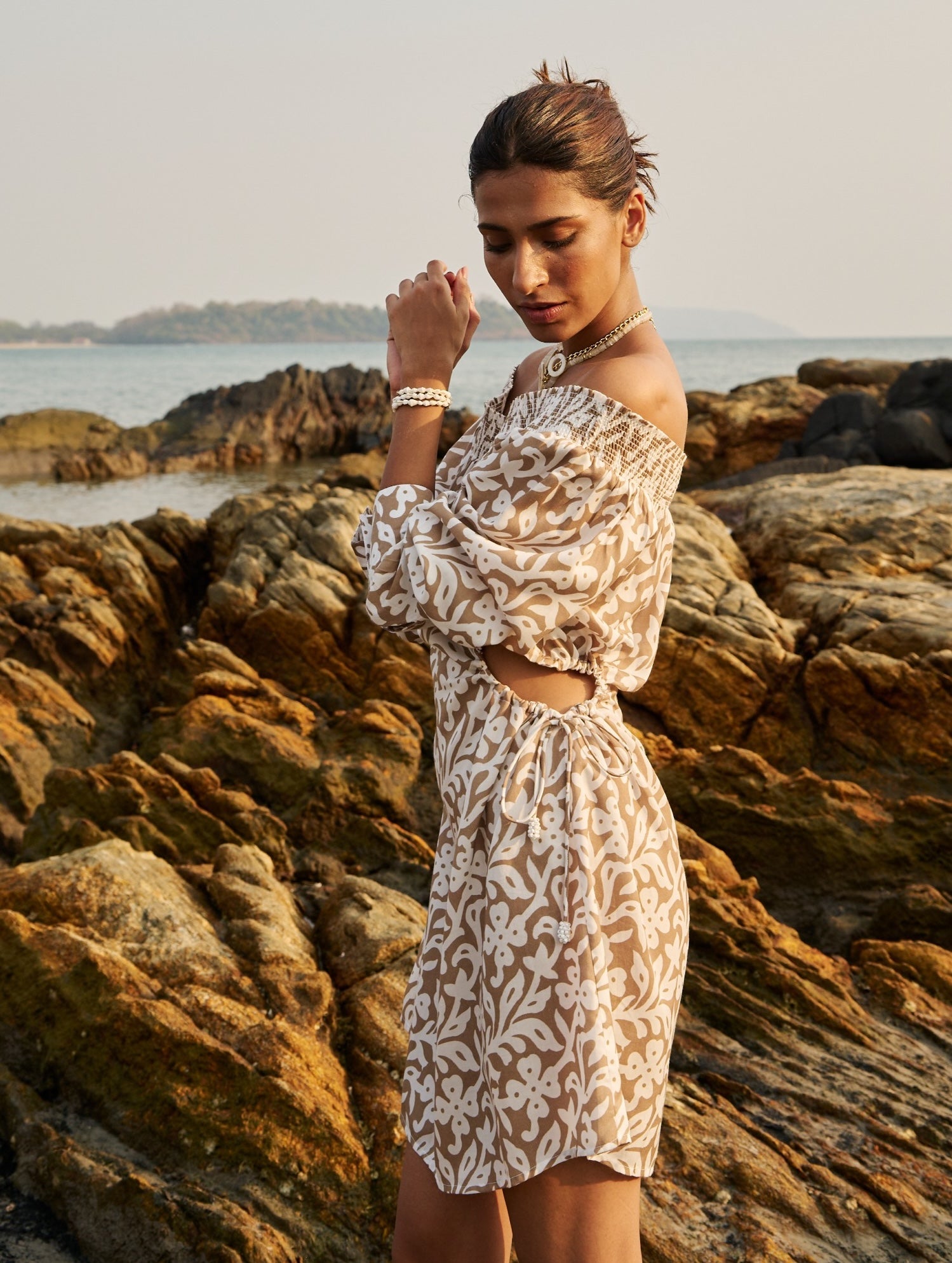 Meet Onya, the dress that combines elegance with versatility. Featuring a beautifully smocked bodice and a neutral floral print, Onya is designed to flatter your figure effortlessly. Adjustable waist cutouts allow you to customize the fit, enhancing your silhouette whether you wear her off the shoulder or on. Unique beaded tassels add a touch of charm and distinction. True to size and perfect for any occasion, the Onya dress ensures you radiate grace and style.