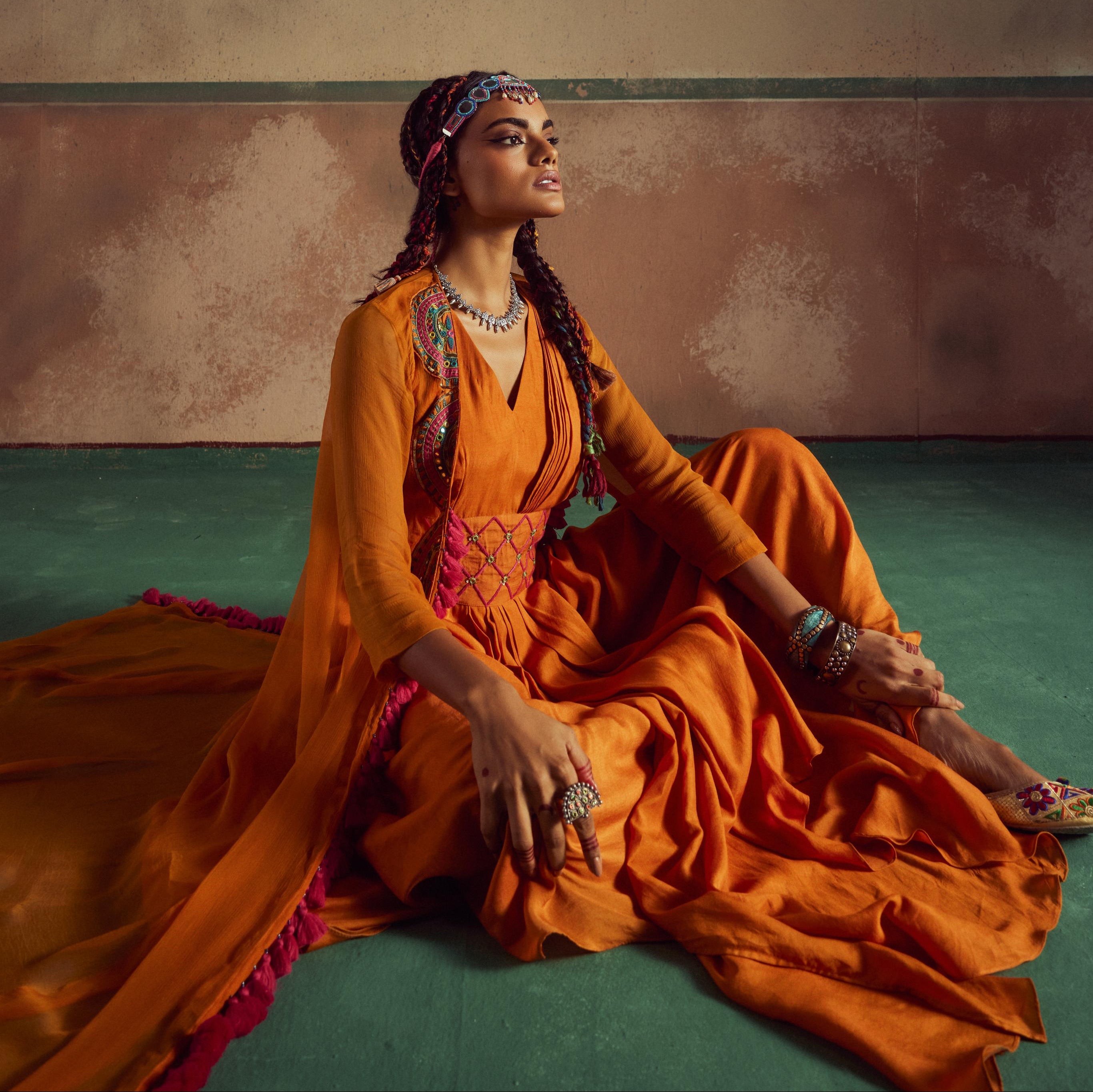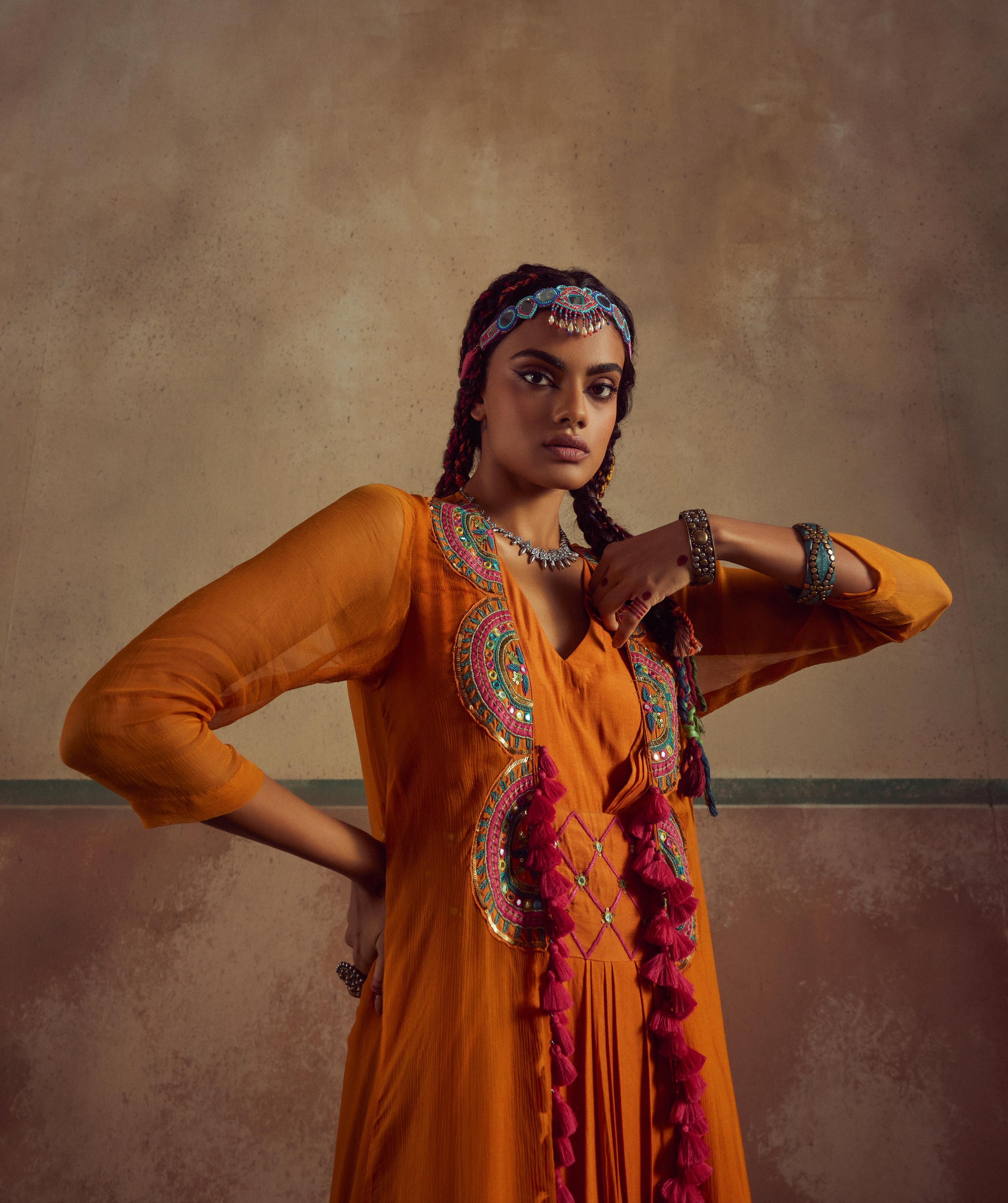 This vibrant orange draped dress is beautifully tucked with an embroidered belt, creating a flattering silhouette. The dress is paired with a chic A-line cape featuring quarter sleeves, embroidered on the front for an elegant touch. The cape is further adorned with playful tassels, adding movement and charm to the ensemble, making it a perfect blend of style and sophistication.