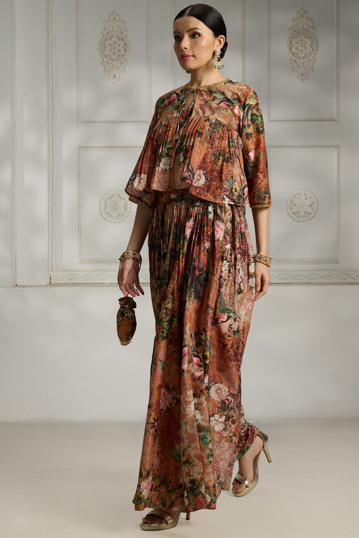The Orange Floral Printed Cape Set bursts with vibrance and feminine charm. Adorned with delicate floral motifs, the flowing cape adds a graceful layer to this festive-ready ensemble. Perfect for daytime celebrations, mehendi functions, or garden parties, this set blends comfort with statement-making style.