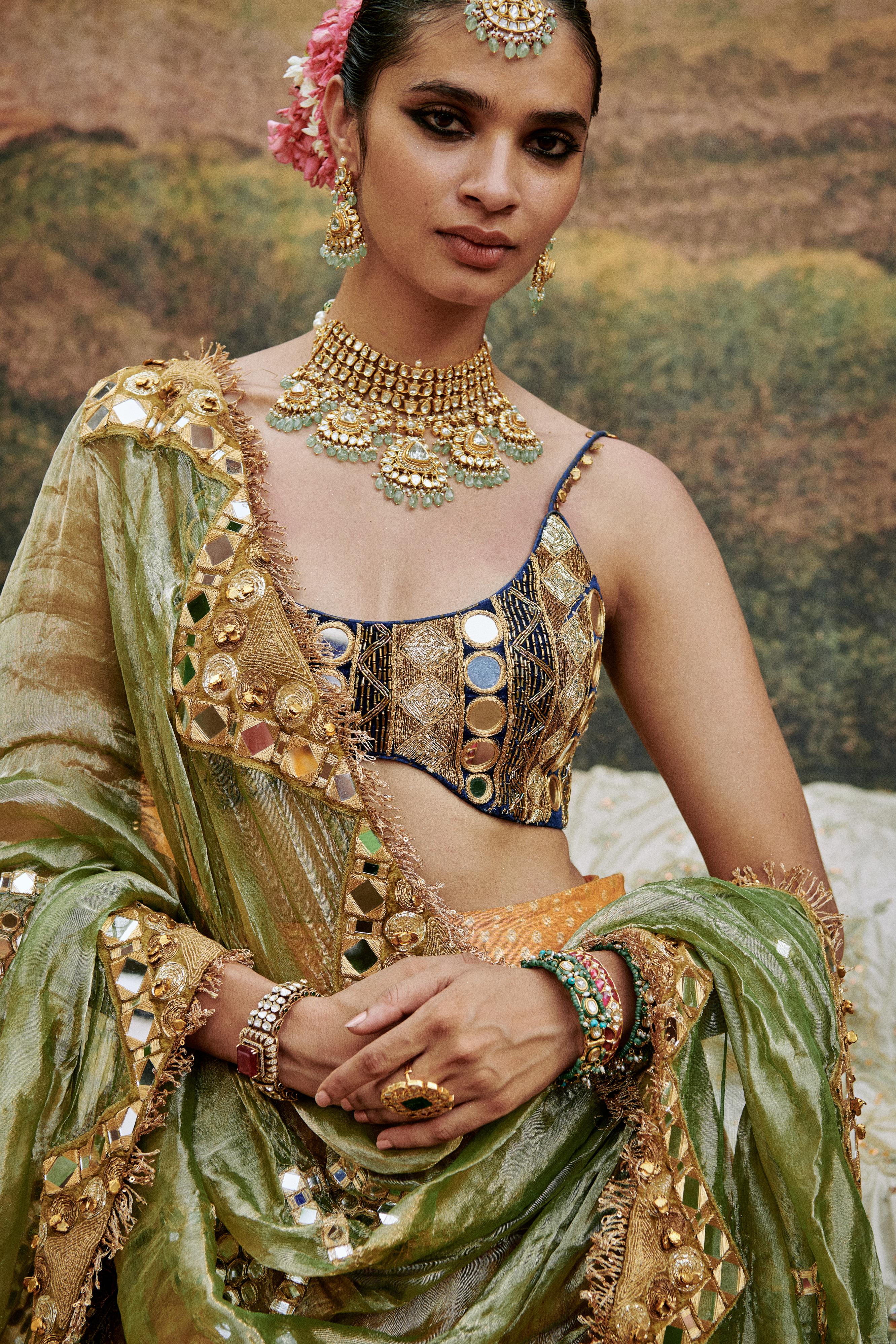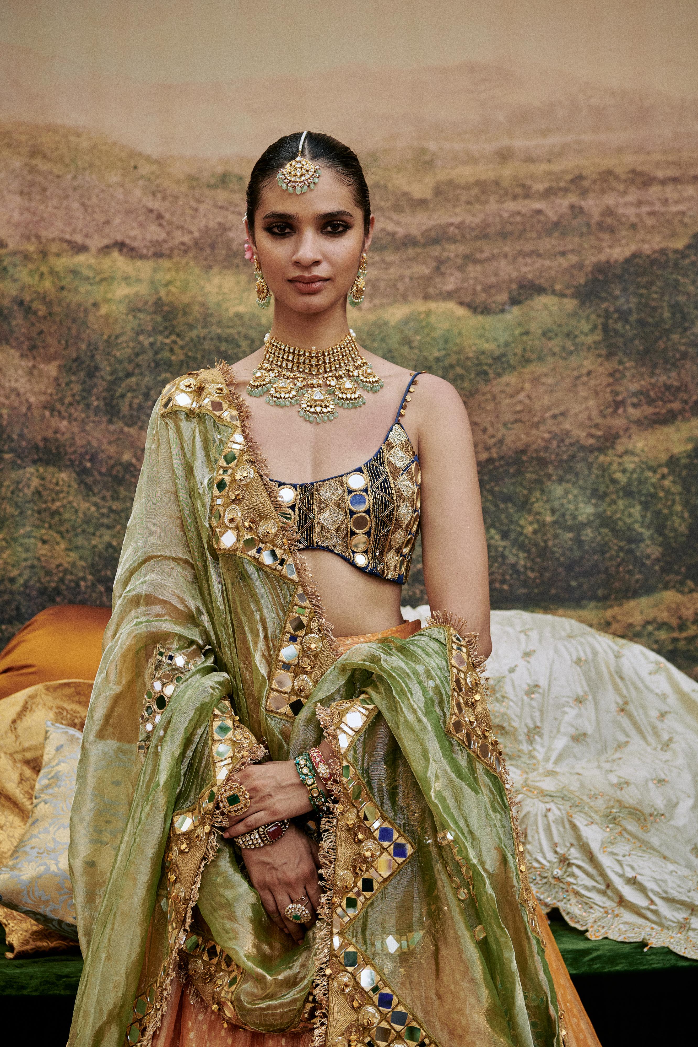 This orange tissue lehenga is paired with an intricately crafted mirror work blouse in rich velvet, exuding elegance and sophistication. Styled with a green tissue dupatta adorned with delicate kiran detailing, this ensemble is a perfect blend of vibrant hues and traditional craftsmanship, ideal for weddings and festive occasions.