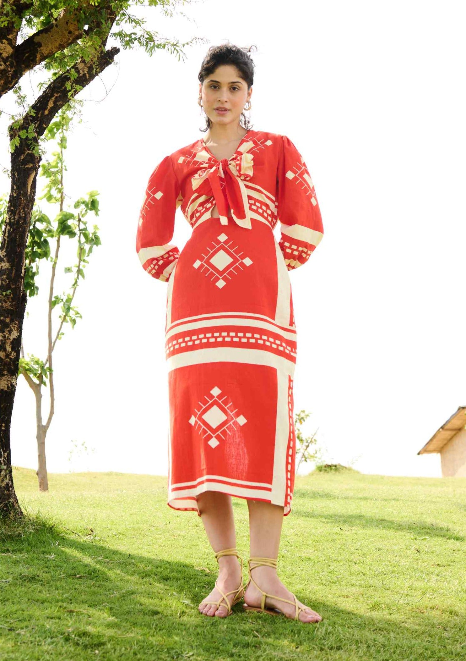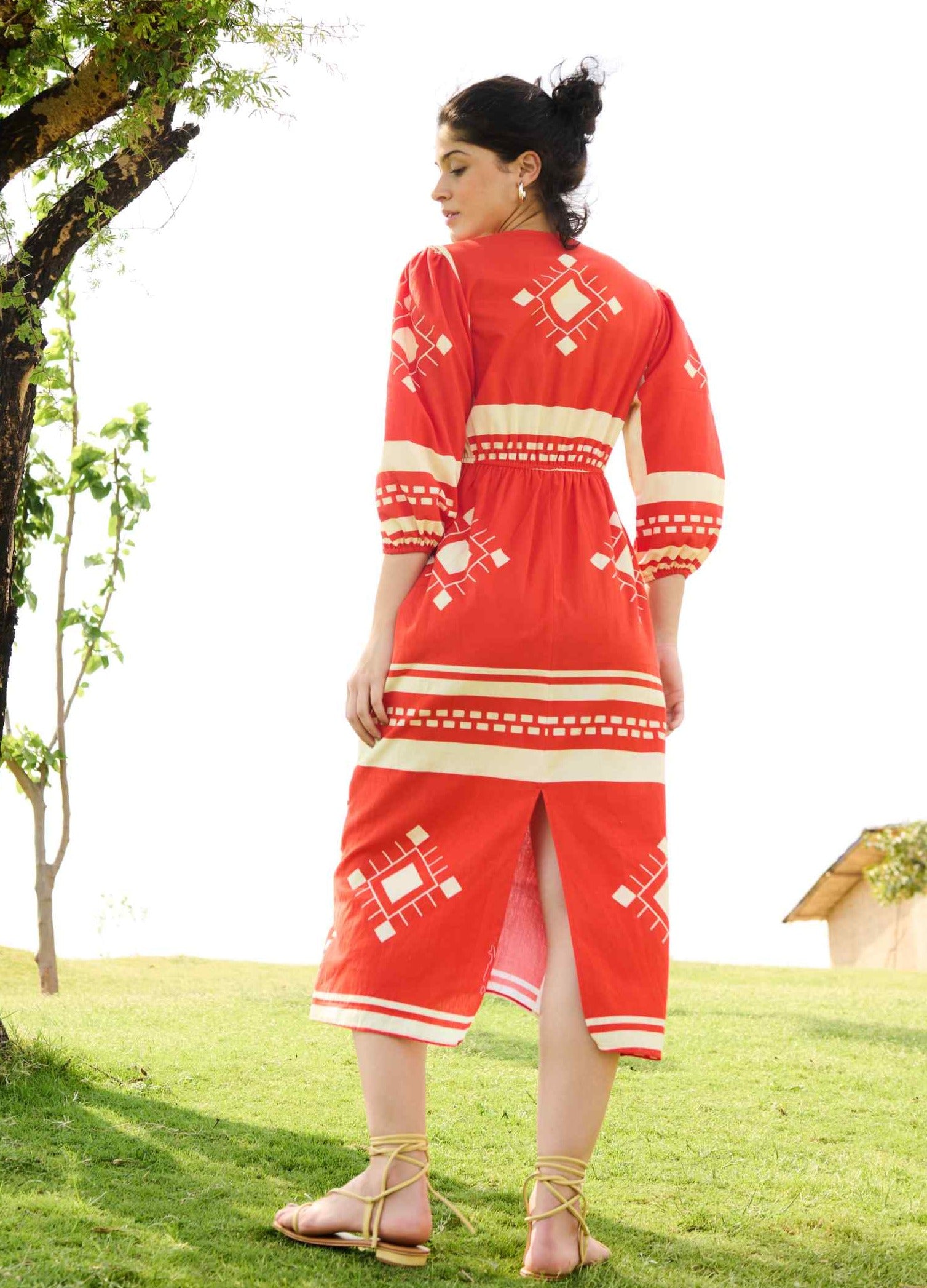 Elevate your style with the Dahlia Dress, expertly crafted from our luxurious linen-cotton blend. This bodycon dress features a sophisticated knot detail at the high waist and a chic back slit, all showcased in our vibrant orange matches print. Perfect for both elegant events and stylish outings, the Dahlia Dress combines contemporary design with the breathable comfort of linen-cotton, offering a bold and graceful look.