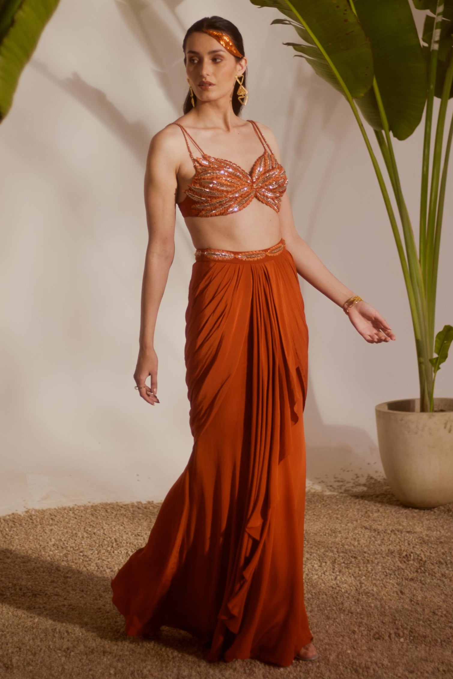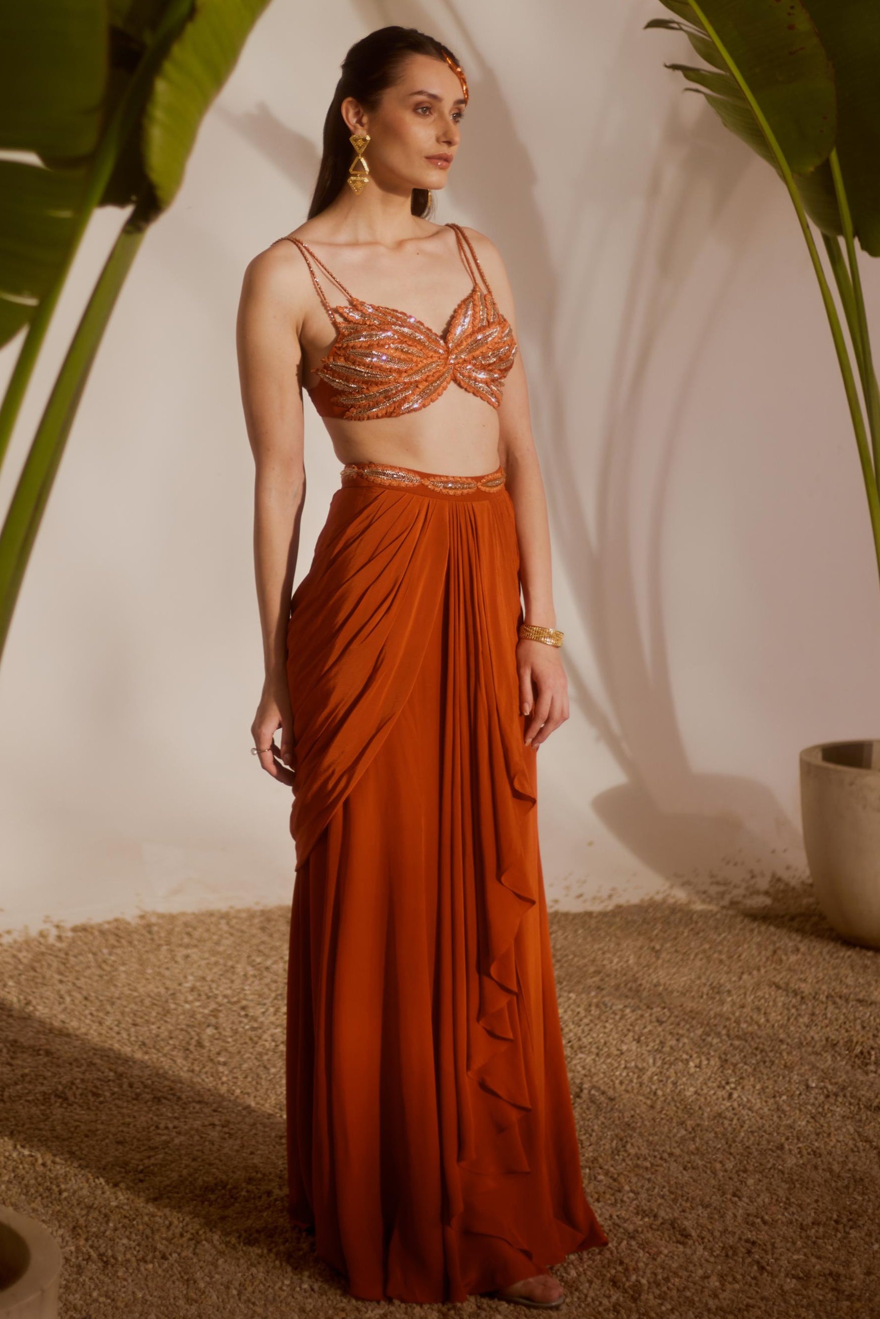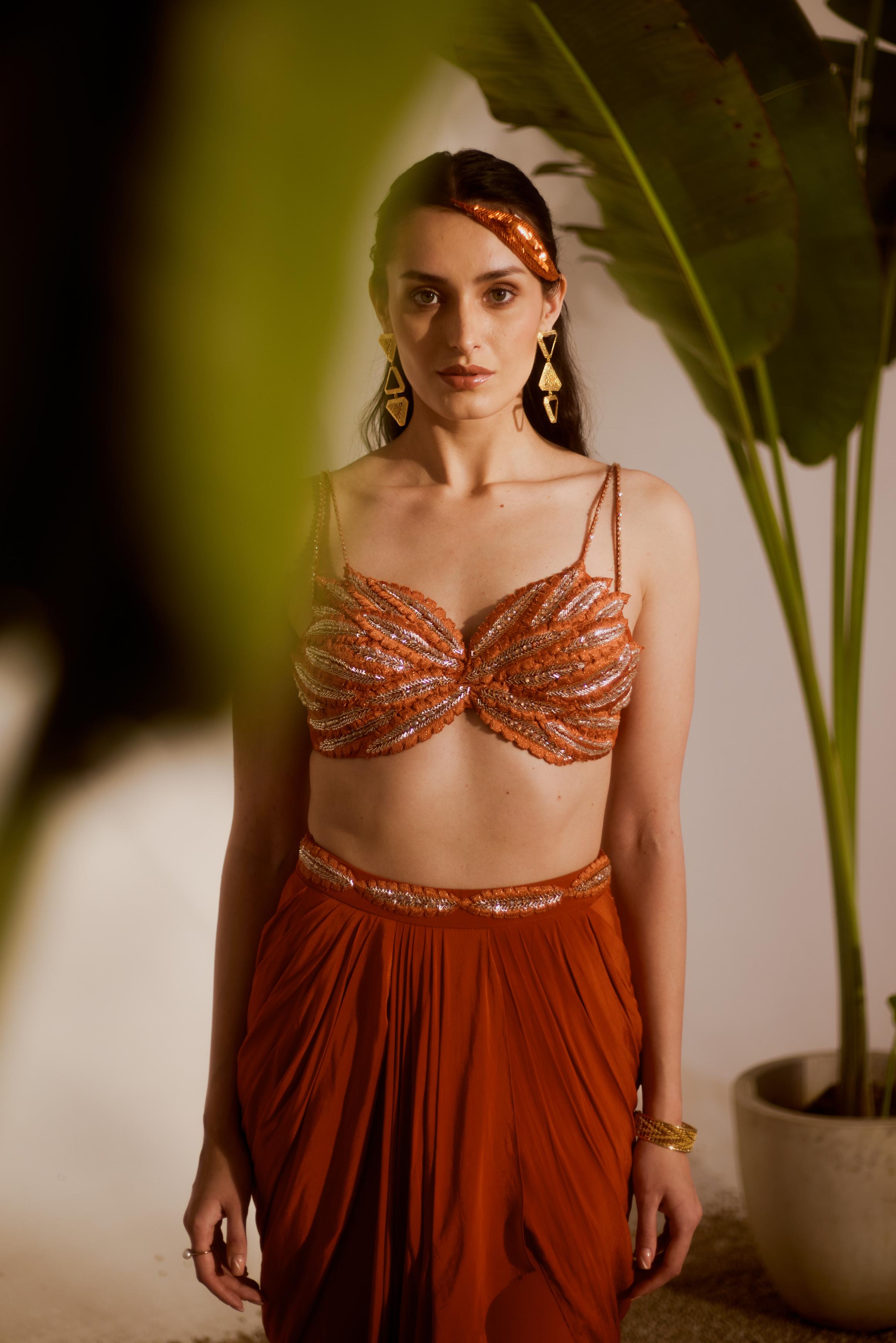 The Orange Nyra Koa Draped Skirt Set is an embodiment of modern elegance with a chic twist. The rich orange color enhances its luxurious draped skirt, creating a fluid, graceful silhouette. The set blends contemporary design with traditional draping techniques, making it perfect for a stylish day out or an evening affair. With intricate detailing and a flattering fit, it promises to make a statement while exuding understated sophistication.