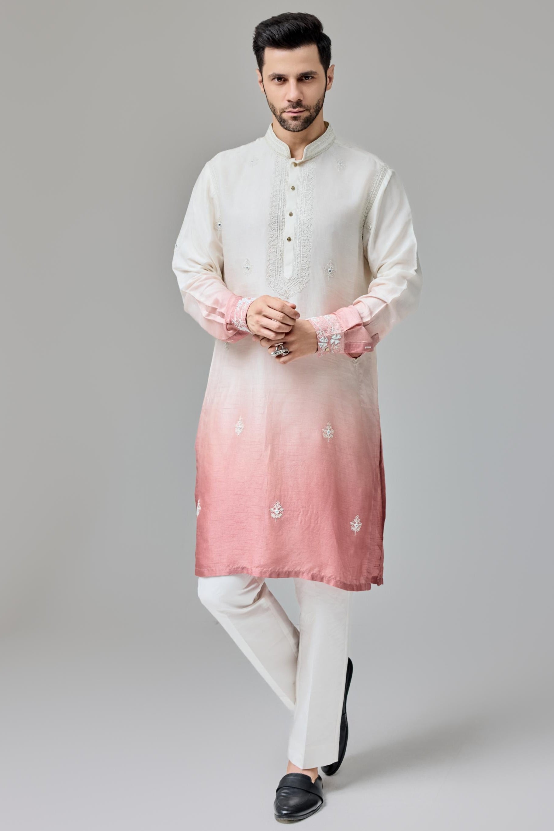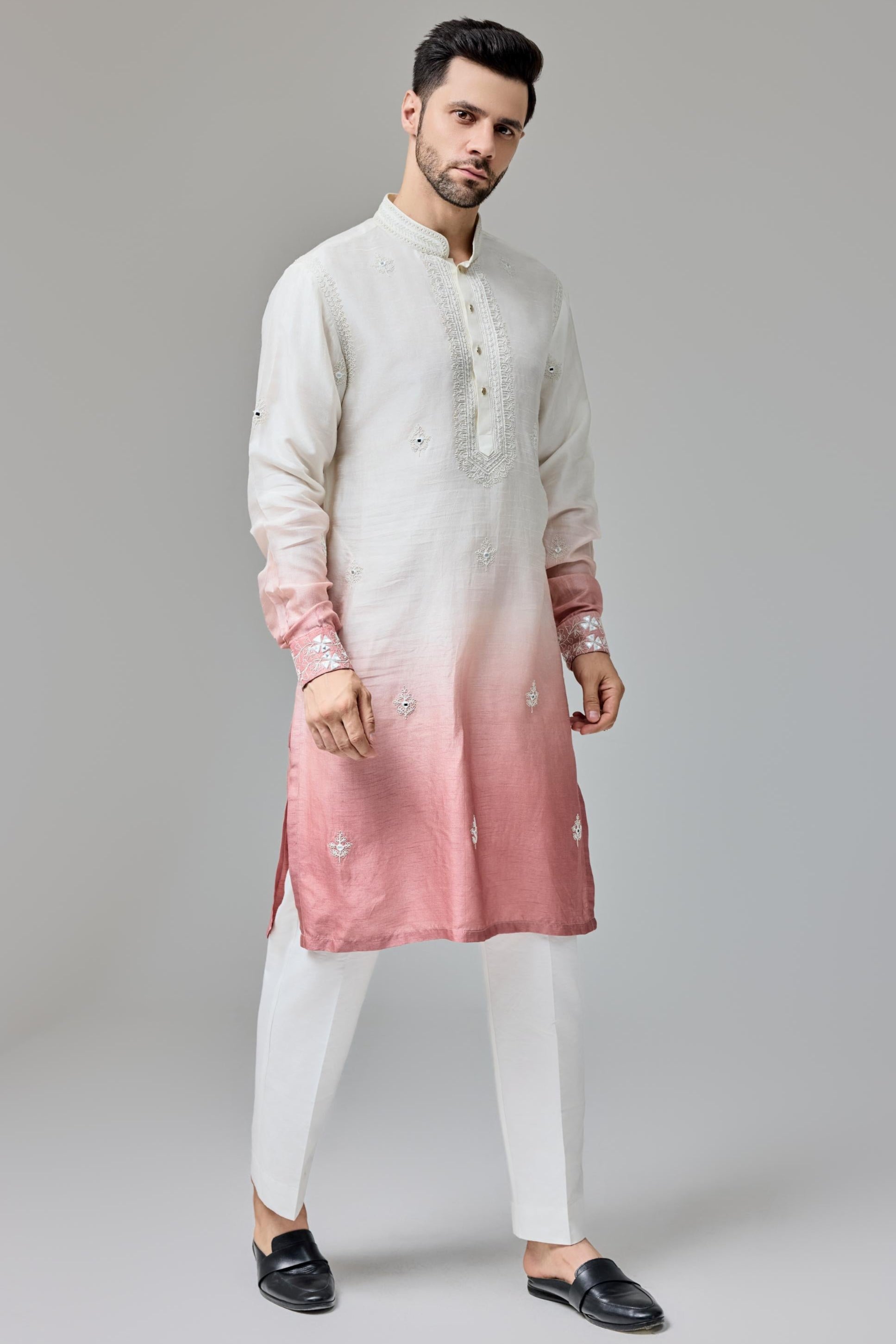 Radiating warmth and festive energy, the Orange Ombre Dori with Mirror Work Kurta Set is a bold statement in contemporary ethnicwear. The soft ombre gradient shifts from subtle peach to deep saffron, while intricate mirror work and dori embroidery bring artisanal finesse. Perfect for haldi functions, festive gatherings, or destination celebrations, this set is designed for the modern man who embraces vibrant color and handcrafted elegance with confidence.