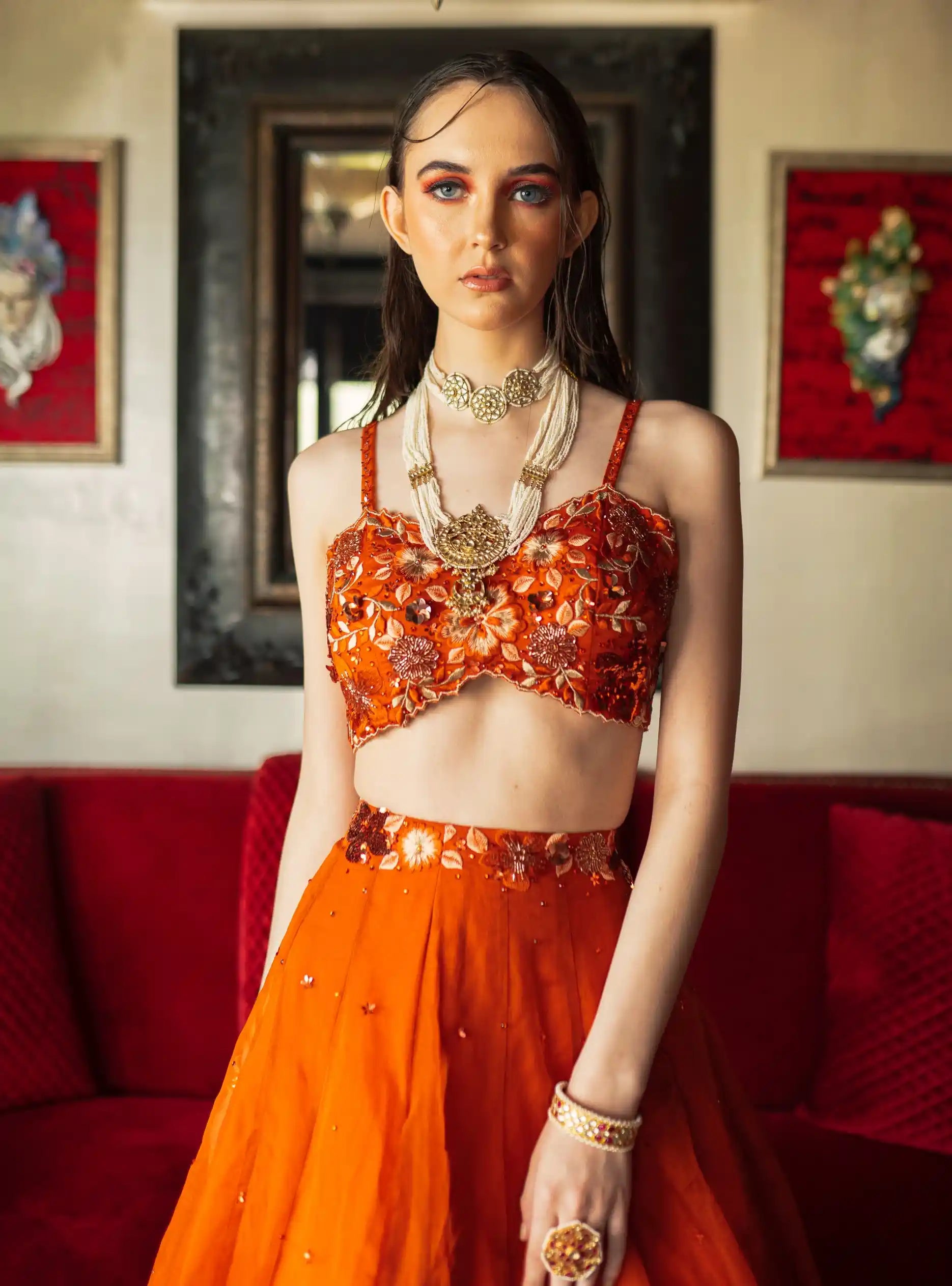 Embrace elegance with this organza floral belt lehenga featuring a cutwork v-hem blouse. The organza embroidered dupatta adds an extra layer of sophistication to the ensemble, making it perfect for festive celebrations. This outfit beautifully marries modern aesthetics with traditional craftsmanship, ensuring you look radiant.