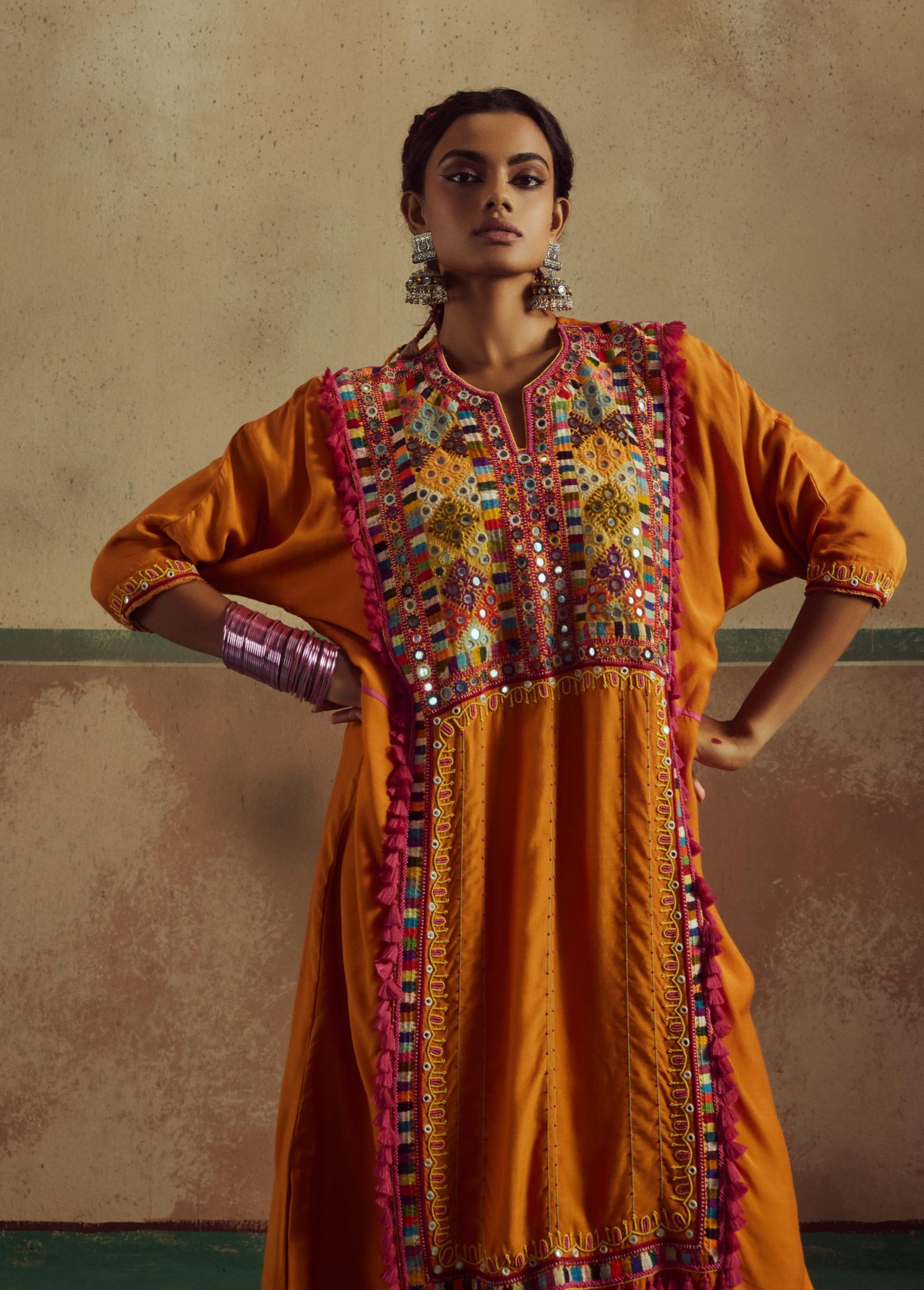 This vibrant orange patchwork Banjaran jhola kurta is a perfect blend of traditional charm and contemporary style. Adorned with intricate tassels, beads, and mirrors, it exudes a lively and festive vibe. The kurta is paired with matching pants, completing the look with a modern yet bohemian flair, making it a standout ensemble for any occasion.