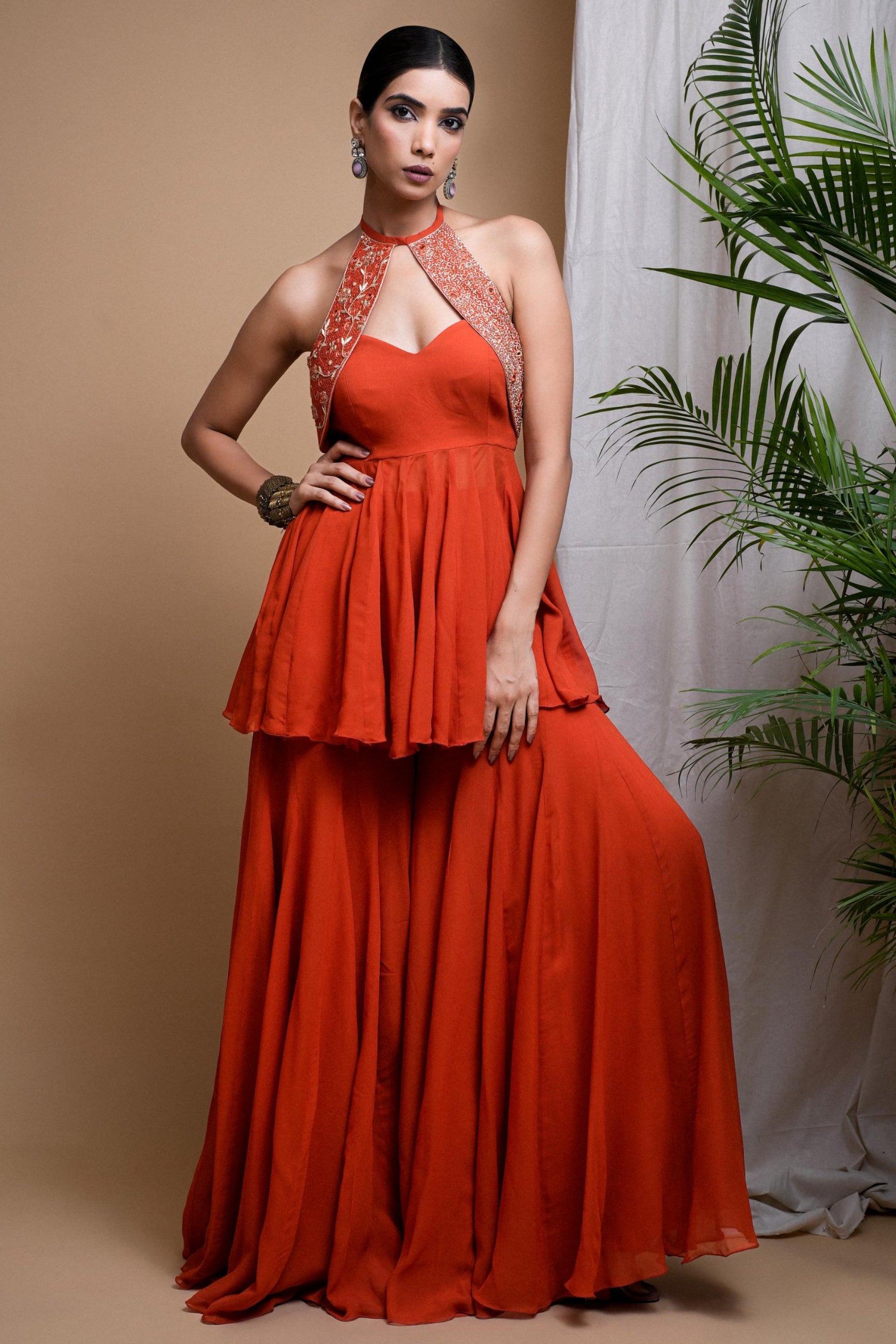 The Orange Sitara Indo Palazzo Set radiates festive joy with its sun-kissed hue and fluid, flattering silhouette. Reimagining the classic Anarkali with modern tailoring and digital print finesse, this set captures the vibrant spirit of Indian celebrations. The flowy kurta, paired with complementing bottoms and dupatta, offers ease of movement without compromising on elegance. Perfect for haldi, poojas, or festive luncheons—style it with statement earrings and a sleek bun for effortless grace that shines through.