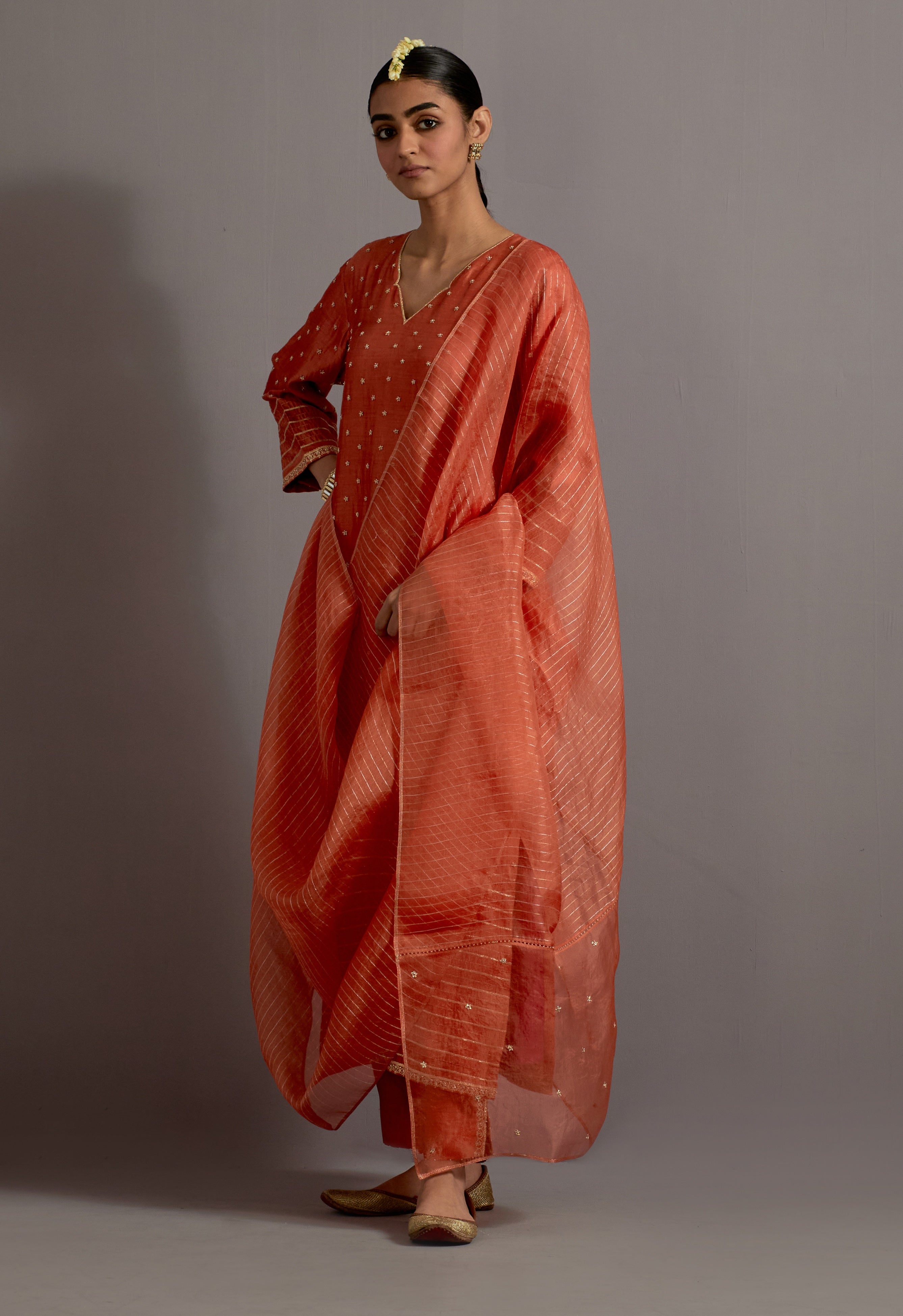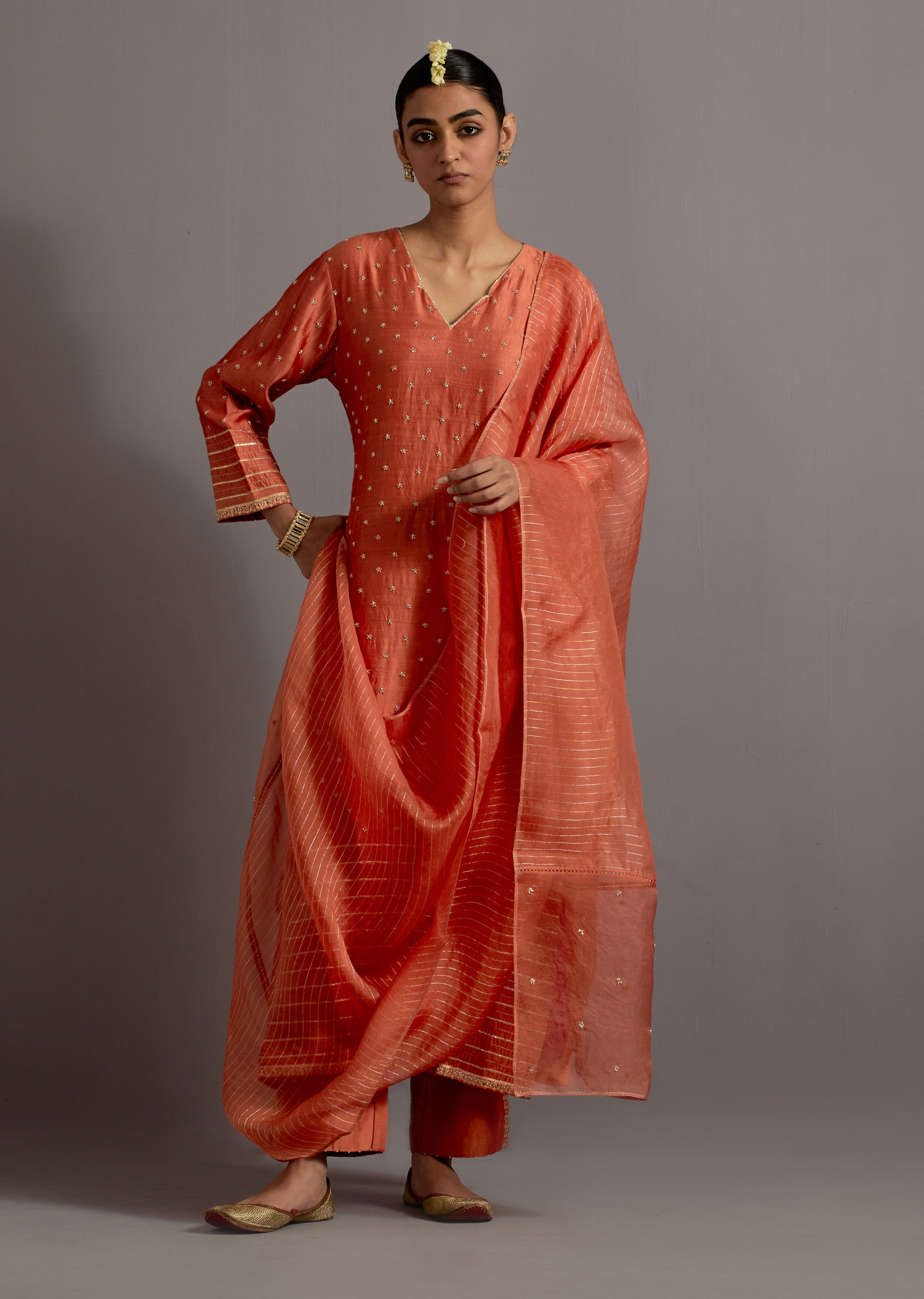 Discover vibrant sophistication with our orange straight kurta, adorned with intricate zardosi booti and stripe embroidery. This striking kurta is paired with matching pants featuring an embroidered slit and an organza dupatta embellished with zari weaving and zardosi booti. Perfect for special occasions, this ensemble combines rich textures and exquisite detailing for a truly elegant and refined look.