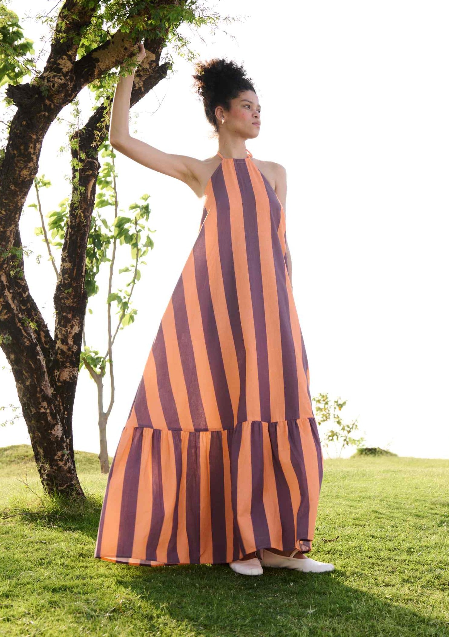 Elevate your wardrobe with the Birds of Paradise Halter Neck Dress, crafted from our premium linen-cotton fabric in a bold orange stripe print. This dress features a chic halter neck design that enhances its vibrant, eye-catching stripes. Perfect for summer outings and stylish events, the Birds of Paradise Dress combines the breathable comfort of linen-cotton with a fresh, modern look.