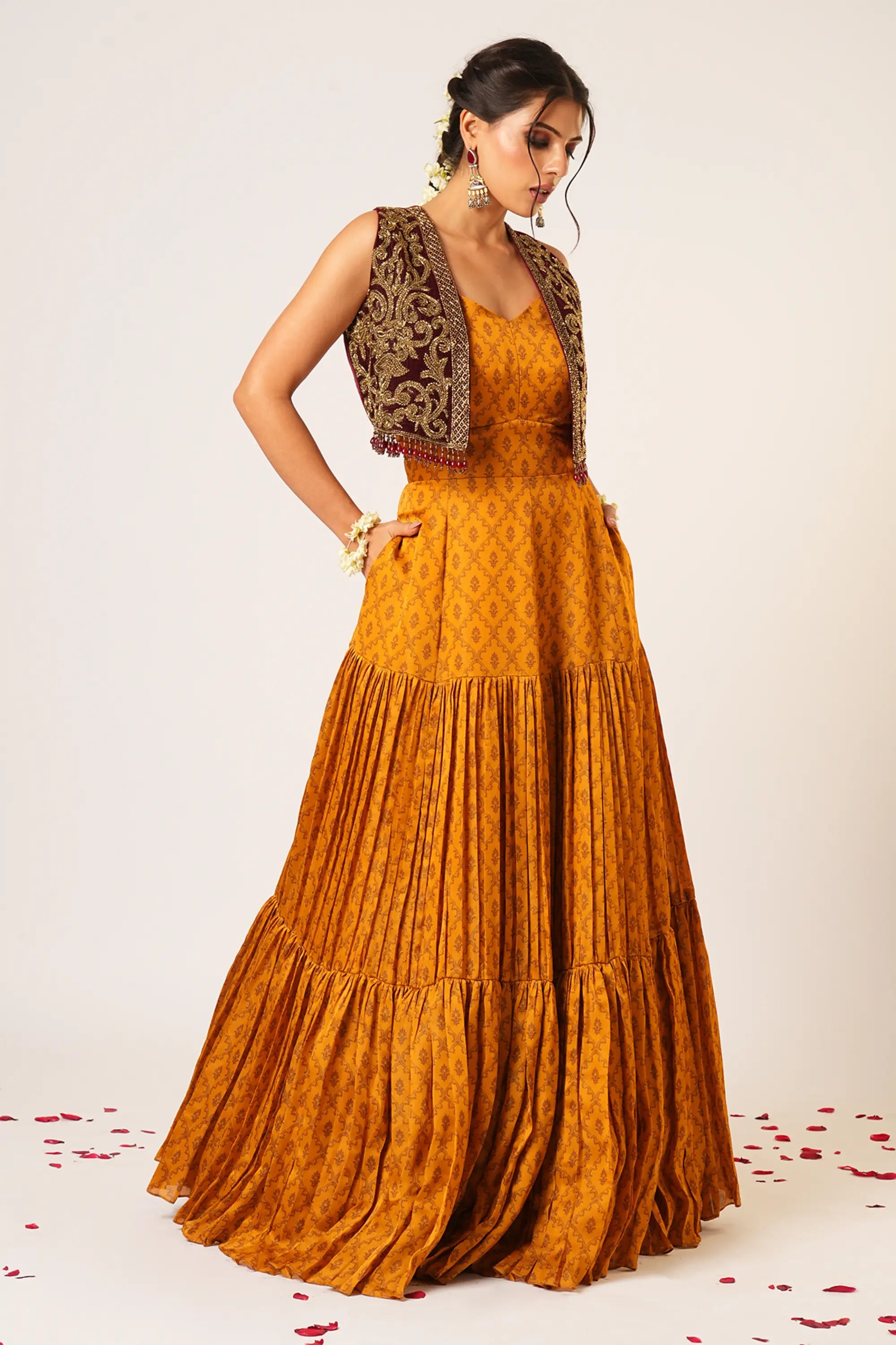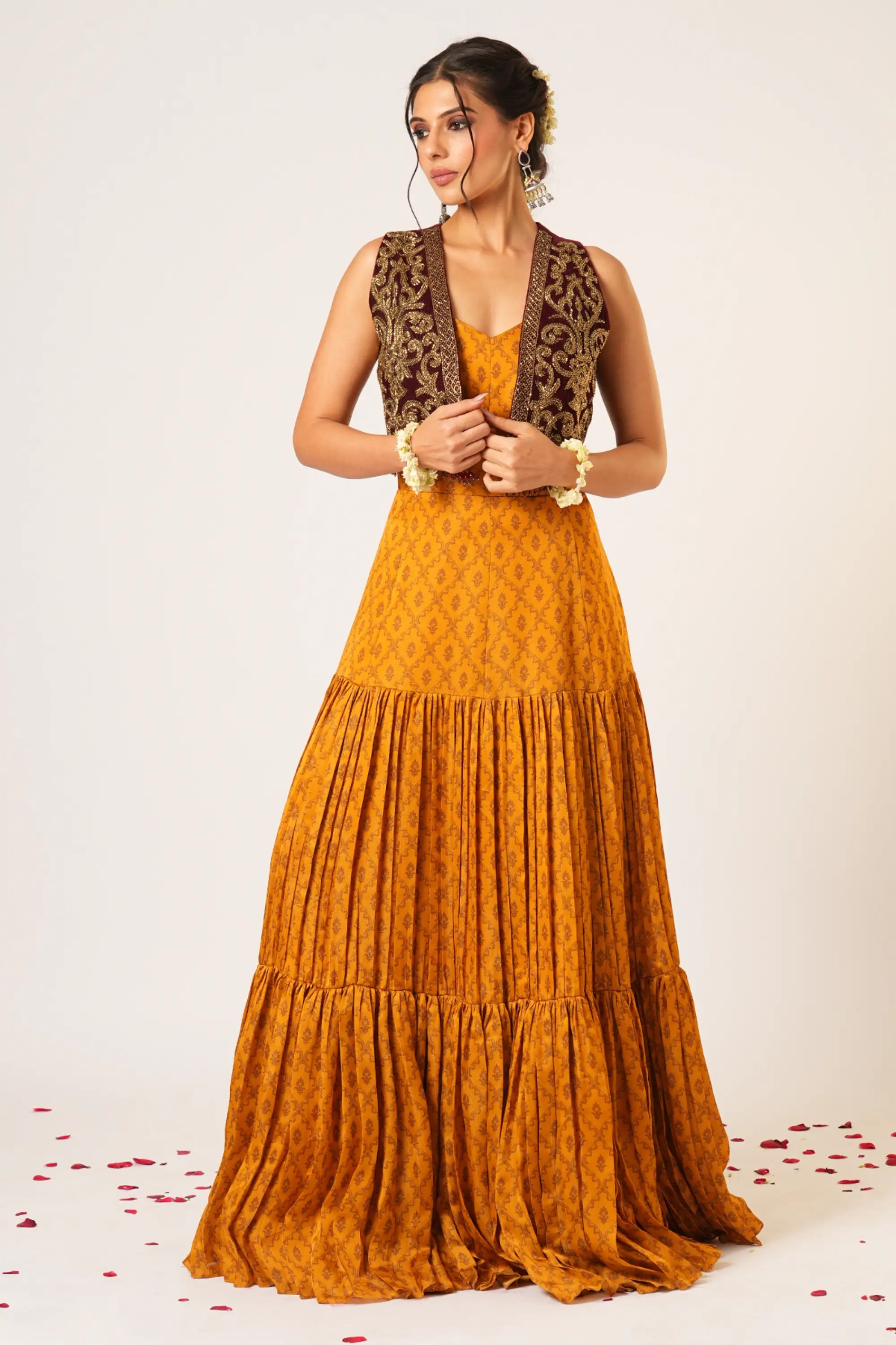 The Orange Tarini Anarkali Jacket is a stunning fusion of traditional style and contemporary design. Crafted in a rich orange hue, this jacket features an intricate Anarkali silhouette that offers a graceful and flattering fit. Perfect for weddings, festivals, or special events, the Tarini Anarkali Jacket combines luxurious fabric with exquisite detailing, making it a standout piece for your ethnic wardrobe.