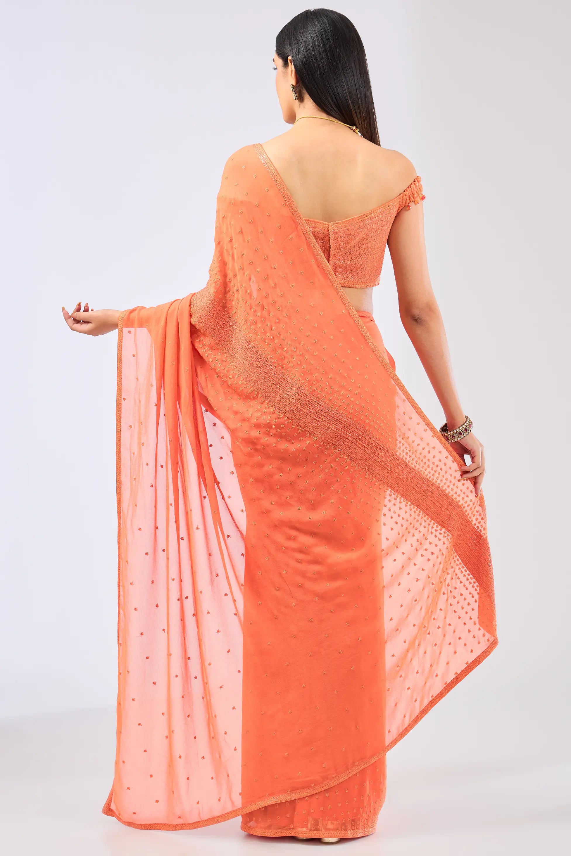 Illuminate your elegance with our vibrant orange thread work and sequin saree set. This stunning ensemble showcases intricate thread embroidery paired with shimmering sequins, creating a captivating effect that is perfect for any festive occasion. The rich orange hue adds warmth and vibrancy, making it ideal for weddings and celebrations. Drape yourself in this exquisite saree set and embrace a beautiful blend of tradition and contemporary style.