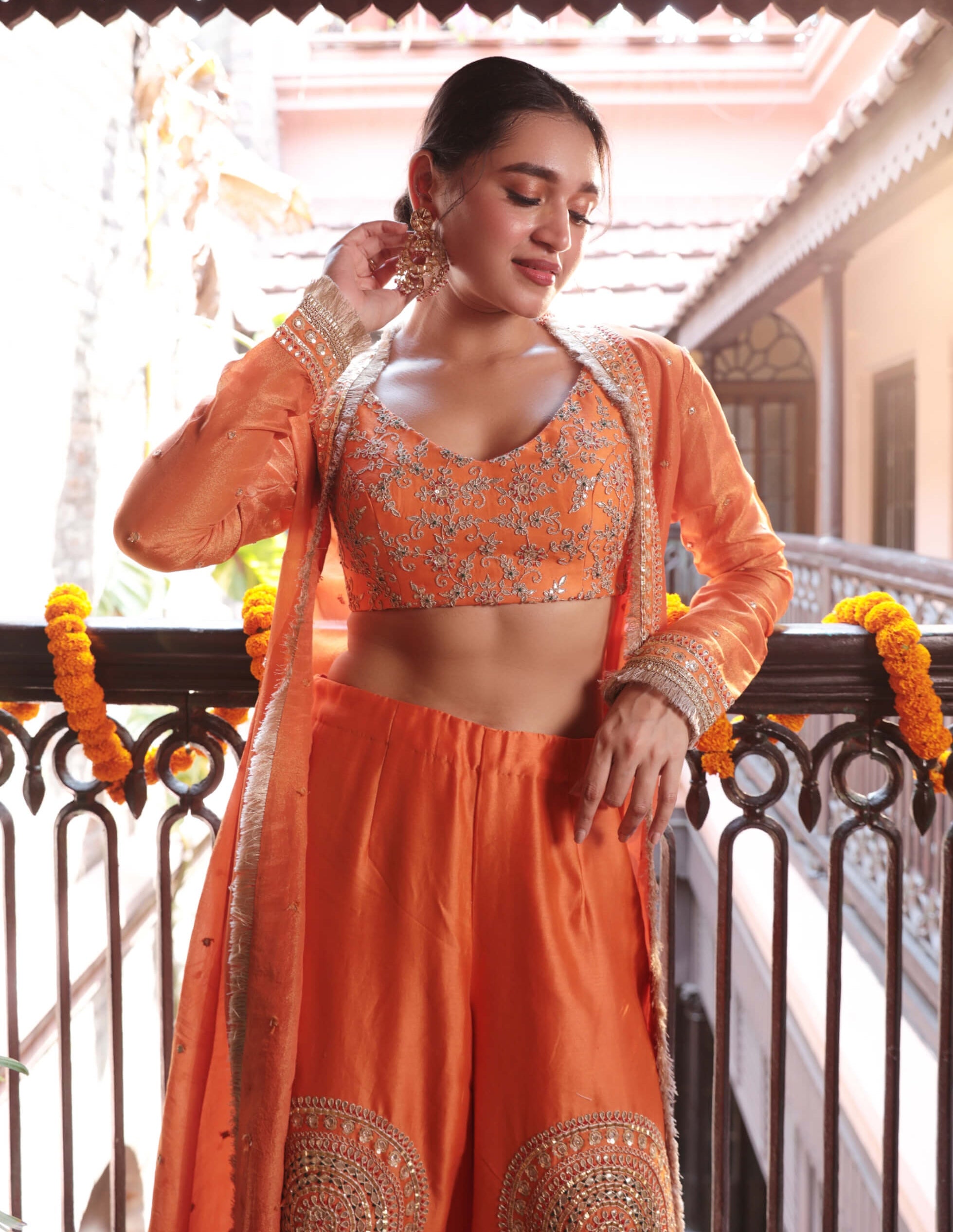 The orange embroidered jacket sharara is a stunning ensemble featuring an orange tissue chanderi jacket, sharara, and dupatta, all adorned with pure hand work. The jacket boasts intricate embroidery, adding a touch of elegance and sophistication. The sharara and dupatta, crafted from the same luxurious tissue chanderi fabric, complement the jacket perfectly, creating a cohesive and graceful look. This ensemble is ideal for making a vibrant and memorable statement at any special occasion.