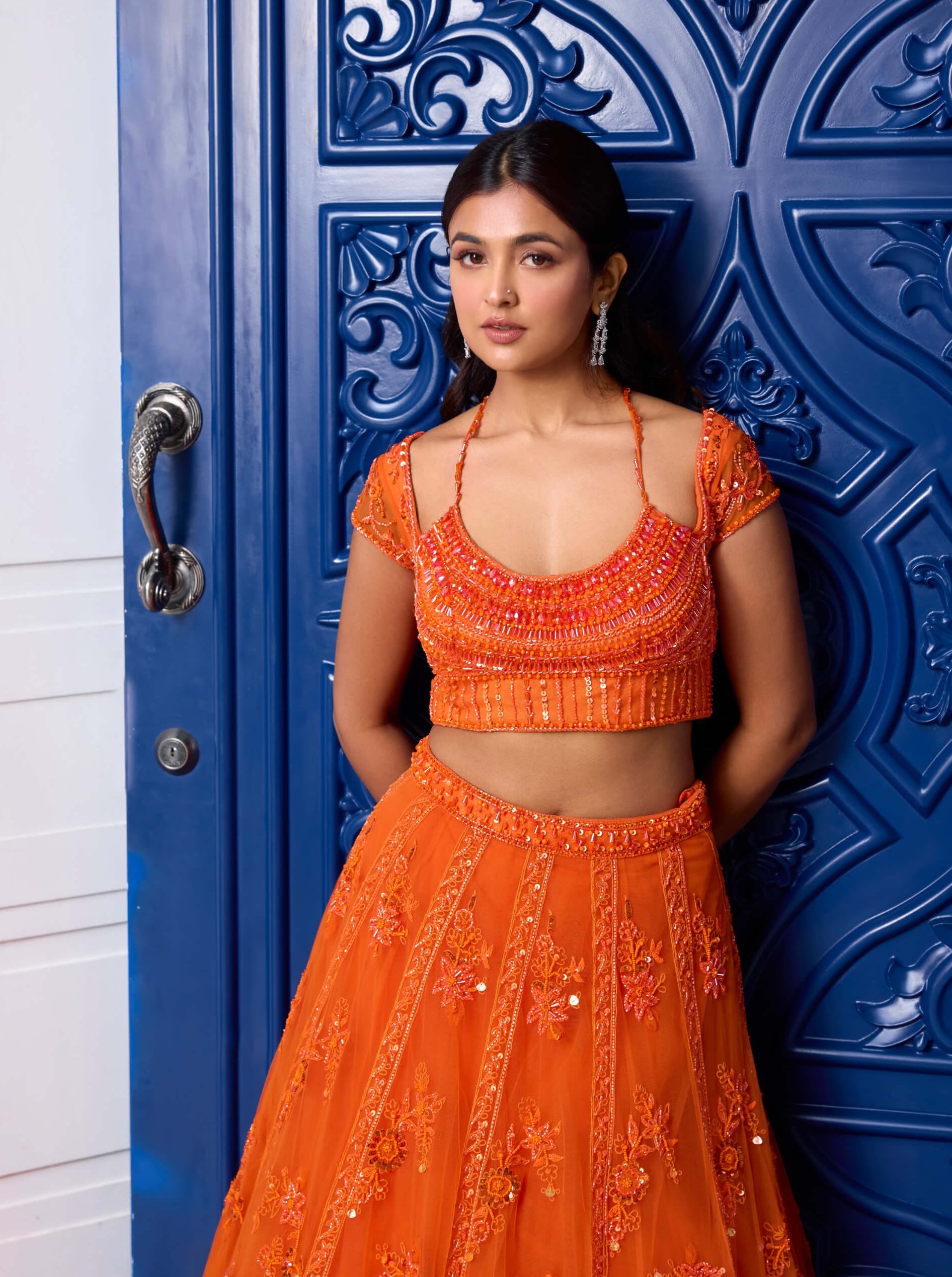 Introducing our exquisite orange net lehenga, crafted with meticulous attention to detail. Adorned with intricate dori and hand embroidery in tonal shades, this lehenga features a graceful can-can underskirt that adds volume and fluidity. It is paired with a breathtaking blouse, encrusted with bejeweled glass stones, sequins, and cut-daana, and designed with a stylish tie-up detail for a personalized fit. Completing the ensemble is a matching net dupatta, providing an elegant finishing touch. This opulent and timeless outfit is perfect for making a grand entrance at weddings or special celebrations, ensuring you shine with unparalleled beauty and grace.
