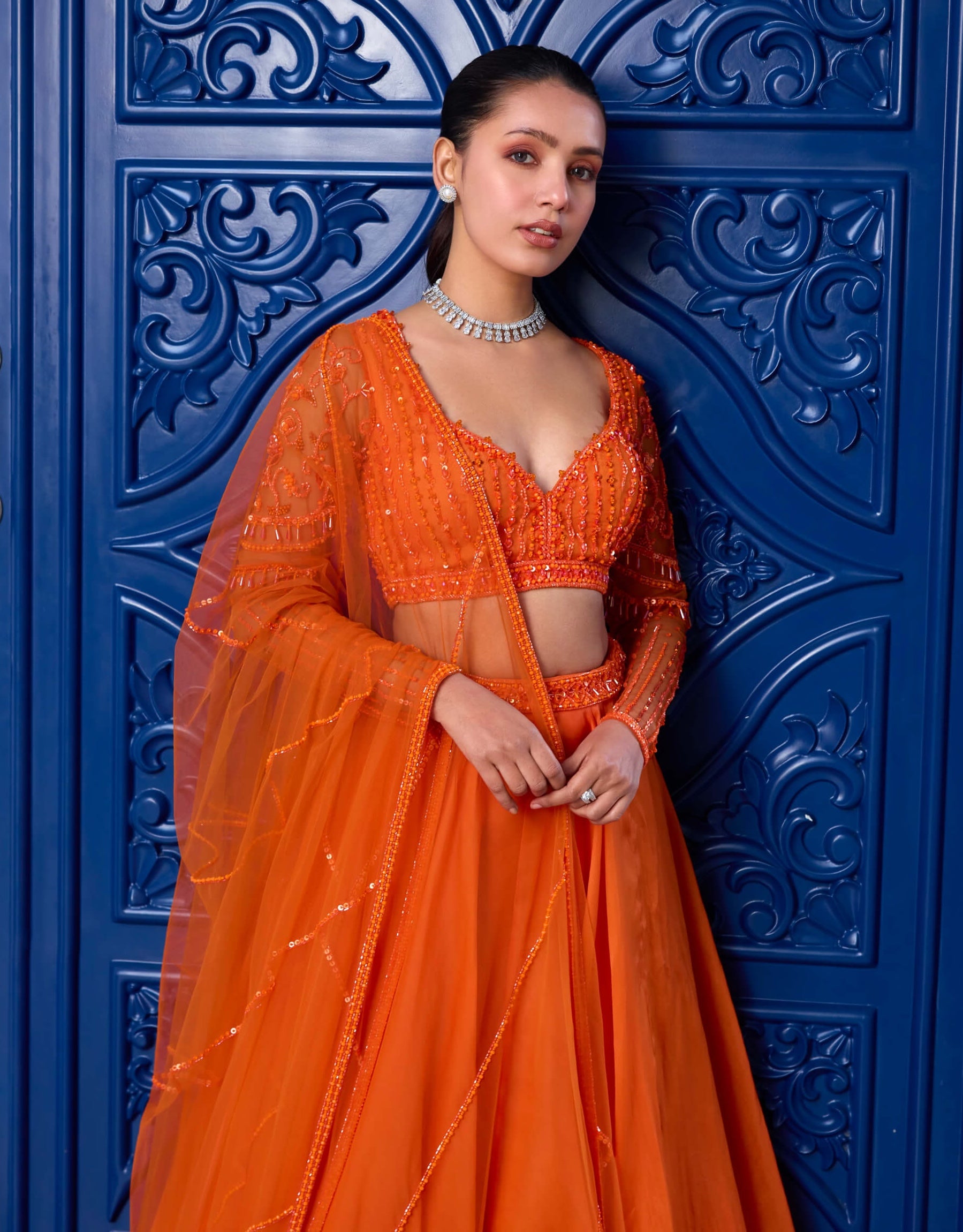 Introducing our stunning orange hand-embroidered blouse, exquisitely detailed with sequins, glass beads, and stones to create a dazzling effect. This vibrant blouse is perfectly paired with a flowy silk organza skirt, featuring a soft can-can underskirt for graceful movement. Complementing the ensemble is a net dupatta, intricately hand-embroidered with elegant diagonal lines. Together, this outfit epitomizes elegance and sophistication, making it ideal for those who wish to radiate charm and grace at any special occasion.