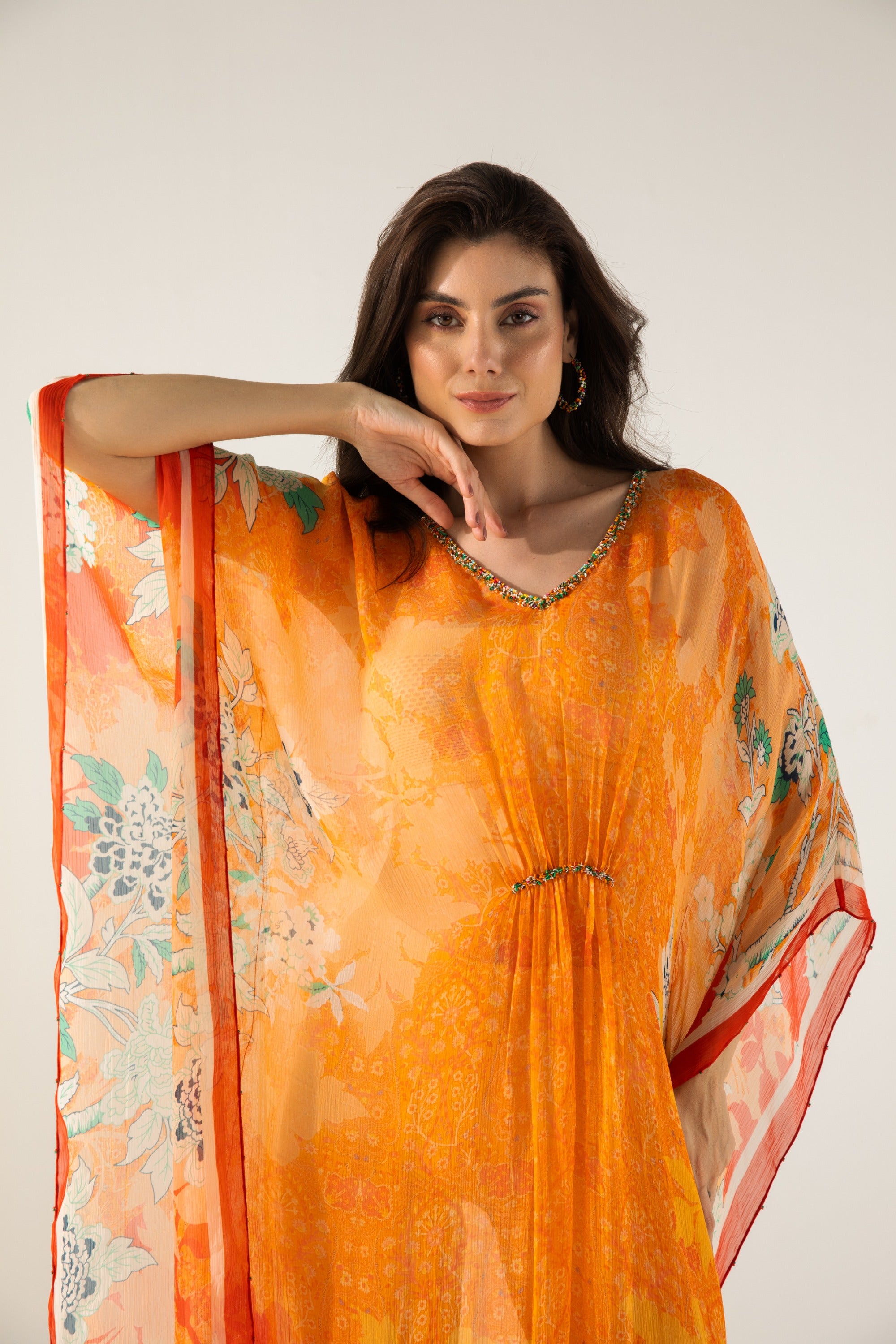 Bold, breezy, and beautifully effortless the Orange Vaani Kaftan is your go-to for relaxed glamour. Drenched in a vibrant orange hue that captures the spirit of celebration and sunshine, this flowy silhouette offers both comfort and style in equal measure. Whether you're heading to a festive brunch, a beachside gathering, or simply lounging in style, this kaftan brings a free-spirited charm to any occasion. For the woman who loves statement color with ease, this piece is pure laid-back luxe.