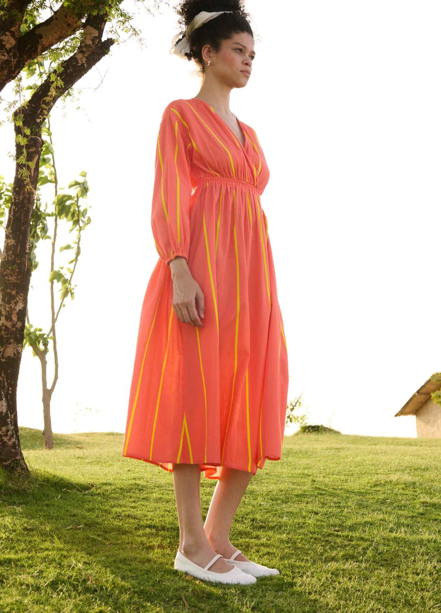 Elevate your wardrobe with the Como Dress, crafted from our premium linen-cotton fabric featuring a vibrant orange and yellow stripe pattern. This dress is designed with elasticated detailing under the bust to enhance fit and comfort. Ideal for both casual and stylish events, the Como Dress combines bold stripes with the breathable, soft texture of linen-cotton, creating a chic and comfortable look.