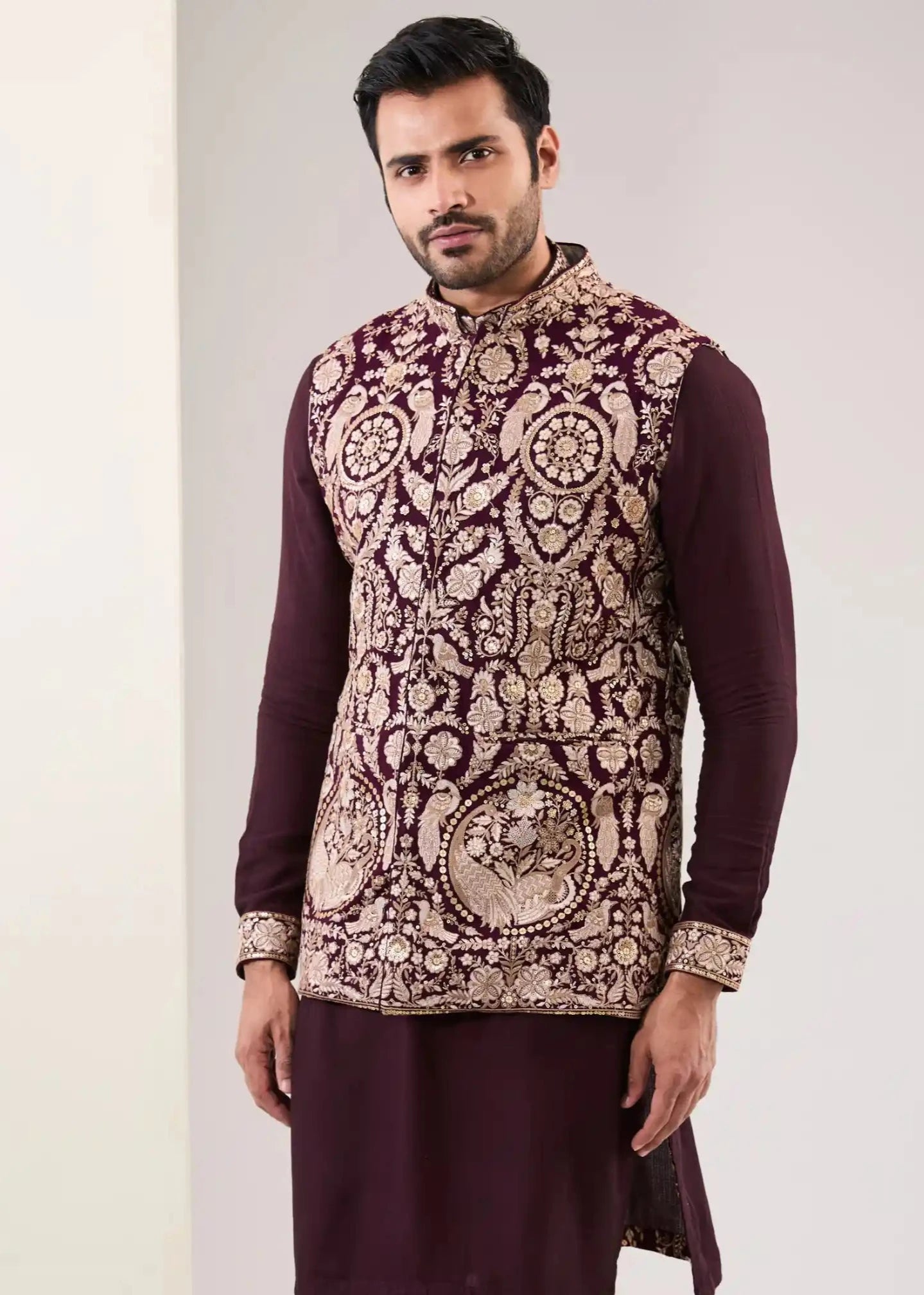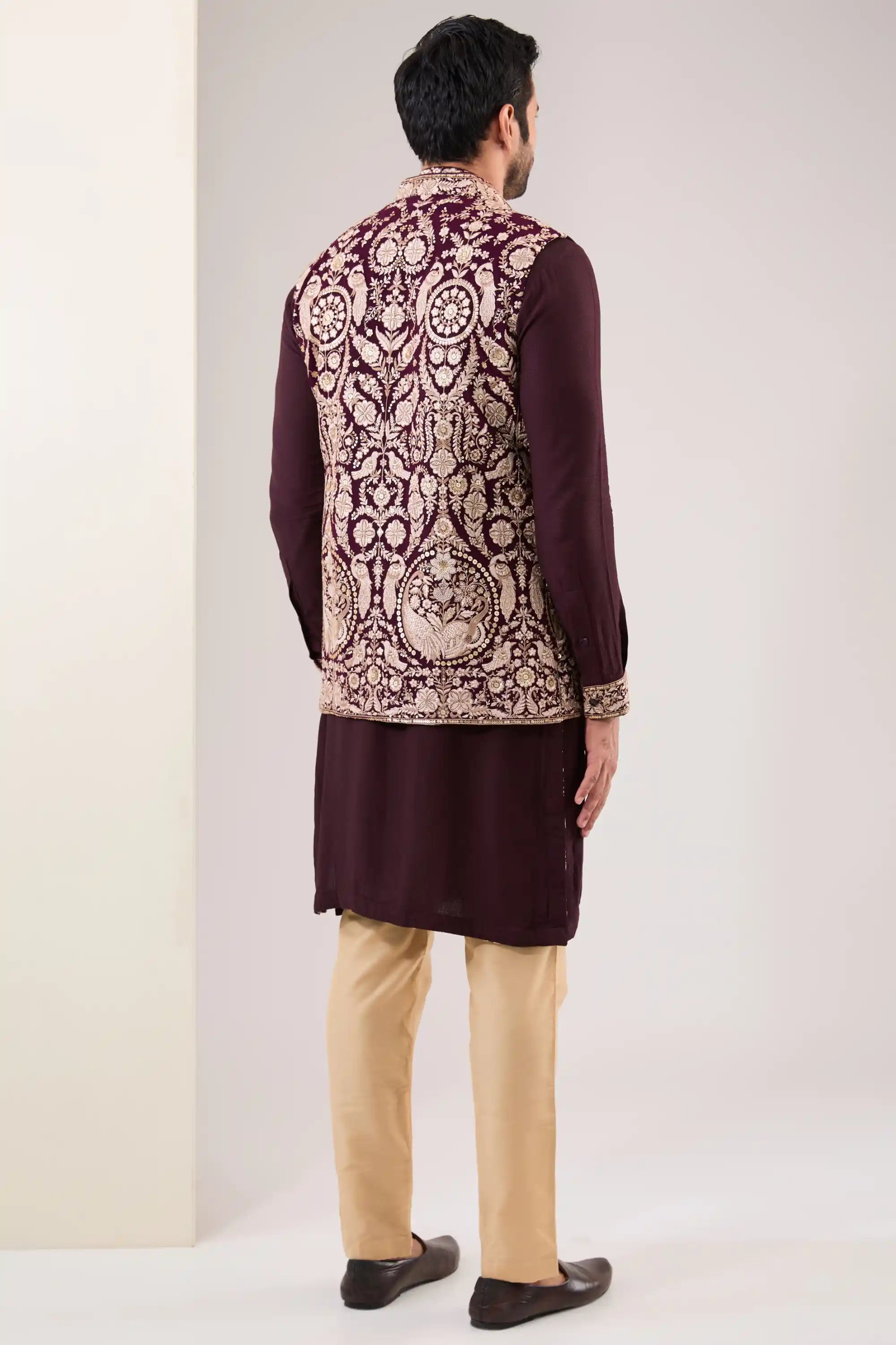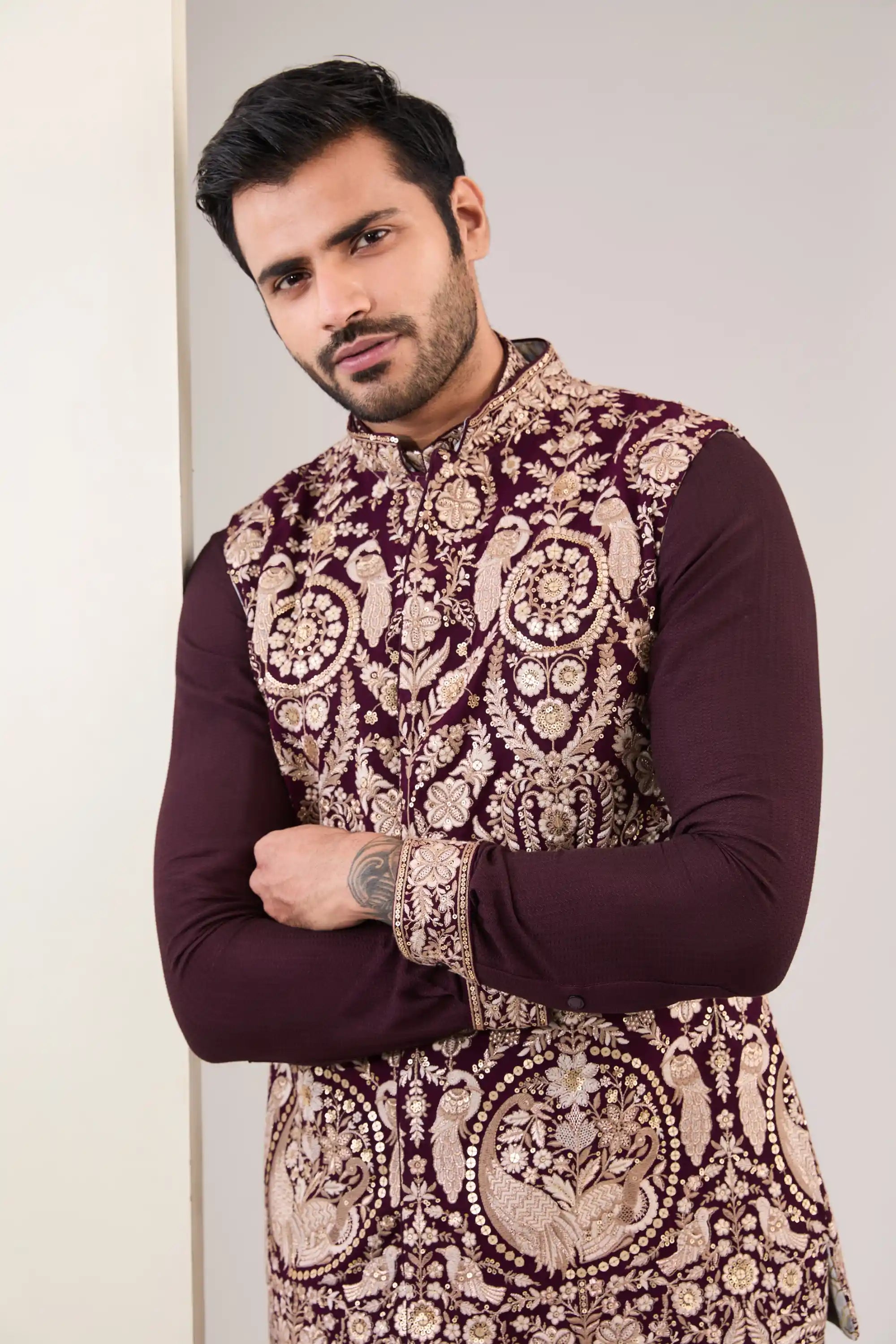 Elevate your look with this exquisite oxblood georgette bundi, featuring intricate full embroidery with metal thread and kasab work. This stunning piece adds a touch of sophistication and richness, making it perfect for formal events and special occasions. Embrace the blend of traditional craftsmanship and modern elegance with this statement bundi.