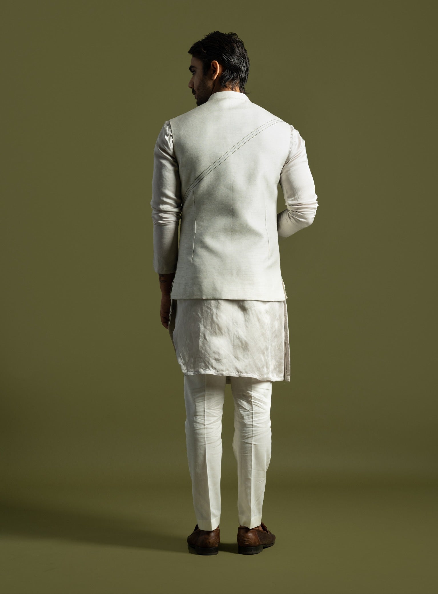 Elevate your formal ensemble with our oyster gray Nehru jacket, featuring exquisite Egyptian-inspired motifs and intricate threadwork detailing. This distinguished jacket pairs seamlessly with a coordinating linen satin kurta, designed with elegant triple-layer detailing and minimal embroidery along the length and sleeves. Complete with classic cream pants, this outfit offers a harmonious blend of cultural artistry and modern refinement, perfect for upscale events and special occasions.