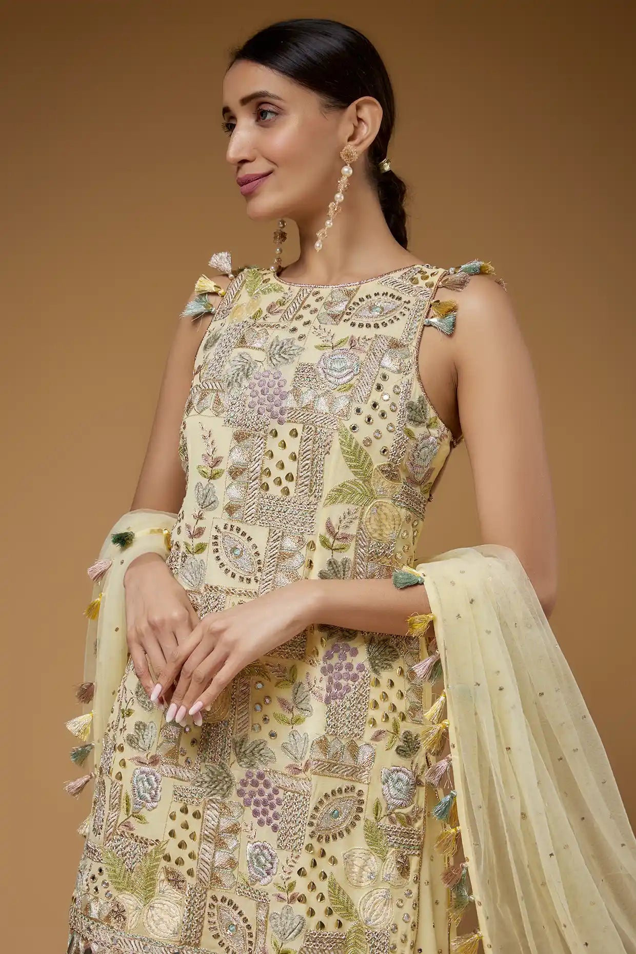 Brighten your wardrobe with this pale yellow georgette embroidered back tie-up kurta, beautifully complemented by a mukaish georgette one-frill sharara and a delicate mukaish net dupatta. The intricate embroidery on the kurta adds a touch of elegance, while the frill detail on the sharara enhances its playful charm. The mukaish net dupatta drapes gracefully, adding an ethereal quality to the ensemble. Perfect for festive occasions and special celebrations, this outfit seamlessly blends contemporary style with traditional allure, ensuring you make a stunning impression.