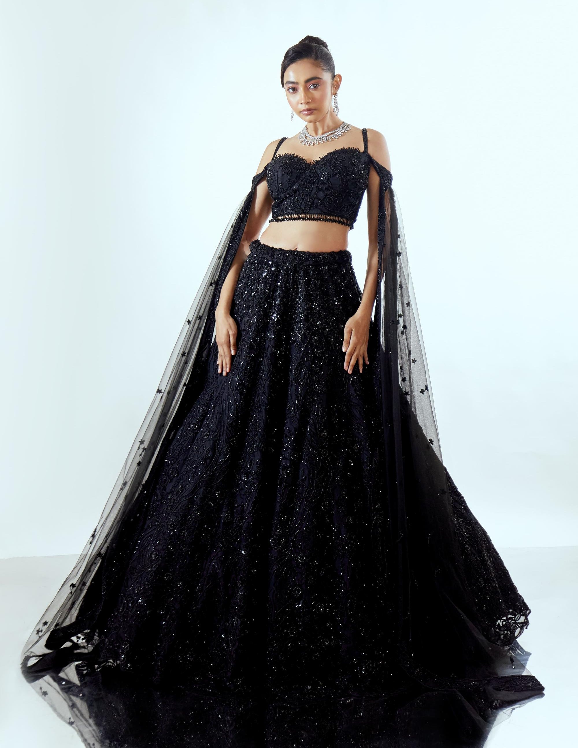The Black Mahira lehenga set is curated for evening wedding celebrations, cocktail nights, and glamorous receptions. Designed for women who appreciate bold elegance, this ensemble pairs a dramatic black organza base with refined embellishment. The silhouette allows movement while maintaining a structured, couture-like presence. Ideal for nighttime festivities, this lehenga set works beautifully under soft lighting, creating a striking yet graceful impact. Style it with minimal jewellery to let the craftsmanship and colour take centre stage.