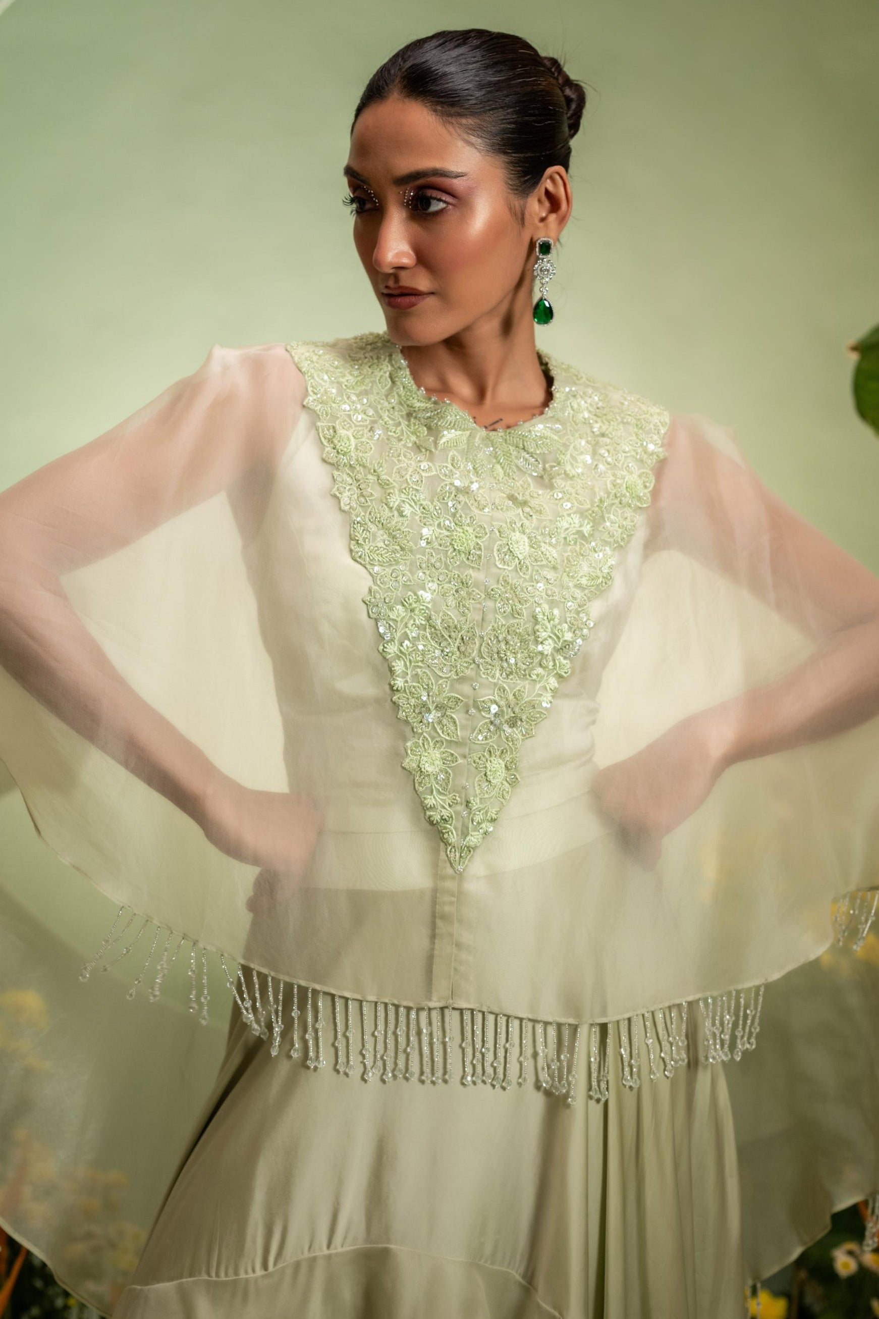 The Green Eden Ruffle Skirt Set is lively, feminine, and perfect for sangeet celebrations. The soft ruffles add joyful movement and make dancing effortless. Lightweight and flattering, it suits guests who love playful silhouettes with festive flair.
