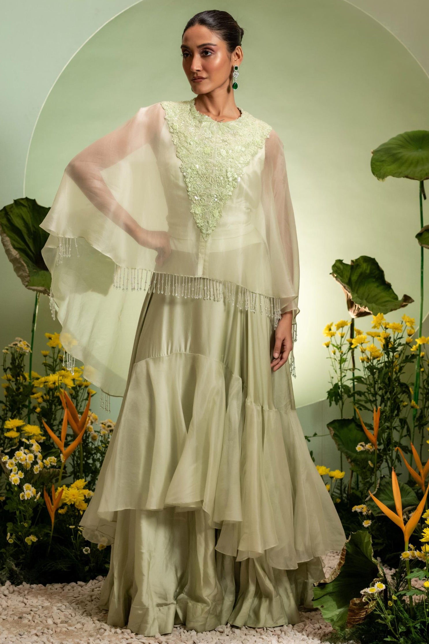 The Green Eden Ruffle Skirt Set brings joyful movement through its layered ruffle skirt set design. Ideal for sangeet or mehendi events, this ruffle skirt set offers playful elegance. The lively green hue enhances the charm of the ruffle skirt set, making it photogenic and festive. Lightweight material ensures the ruffle skirt set allows ease of movement. Whether styled minimally or boldly, this ruffle skirt set adapts beautifully. A captivating choice for guests, this ruffle skirt set brings fun and vibrancy.