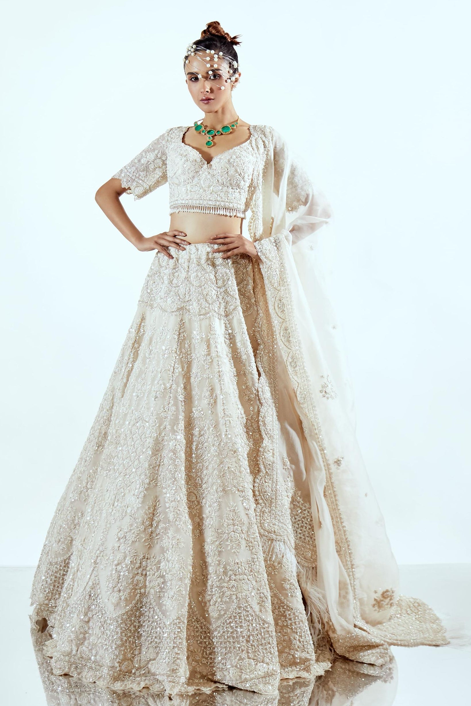 The Ivory henna lehenga set is curated for intimate weddings and traditional ceremonies where understated luxury matters. Featuring delicate resham and moti detailing, this lehenga set is ideal for pheras, family functions, and heritage venues. Its elegance lies in craftsmanship, making it a timeless addition to a festive wardrobe.