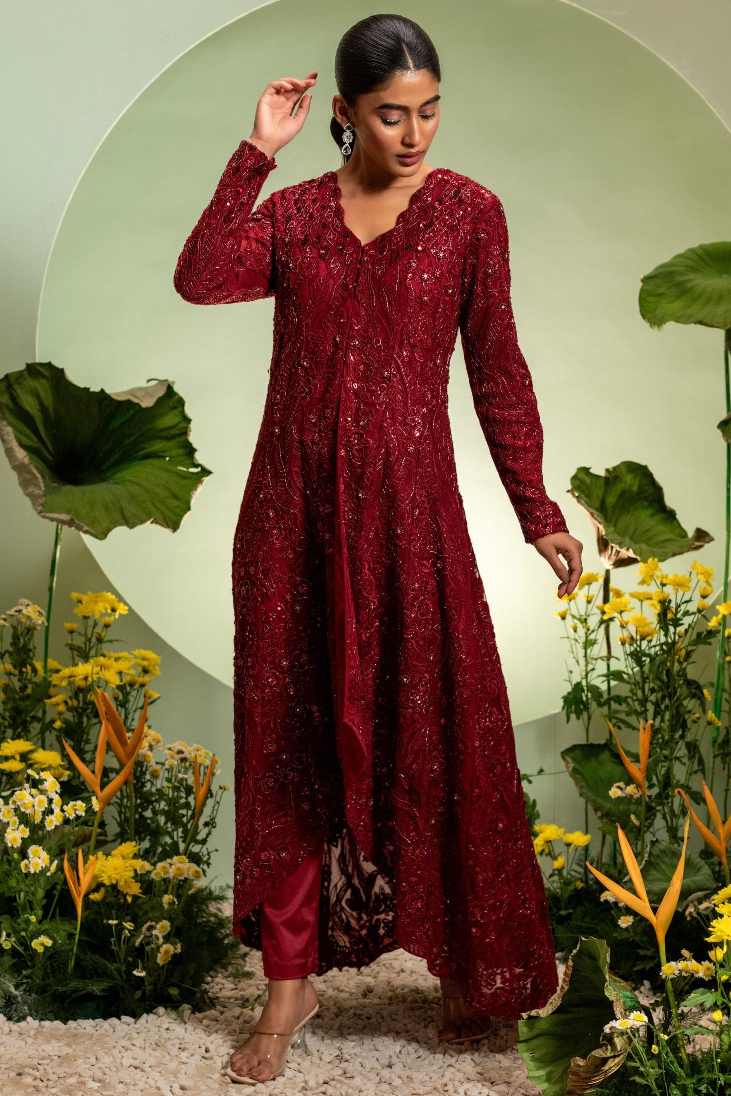 The Red Eden Long Jacket Set is bold, festive, and perfect for celebrations that call for color and confidence. The long jacket creates length and structure, while the rich red palette brings vibrancy ideal for receptions, cocktail nights, or wedding dinners. This ensemble is perfect for women who appreciate dramatic silhouettes without heavy embellishment. Comfortable yet elevated, it allows movement and long-wear ease. Whether styled with gold jewelry for a regal aesthetic or kept sleek with minimal accessories, the look remains impactful and memorable.