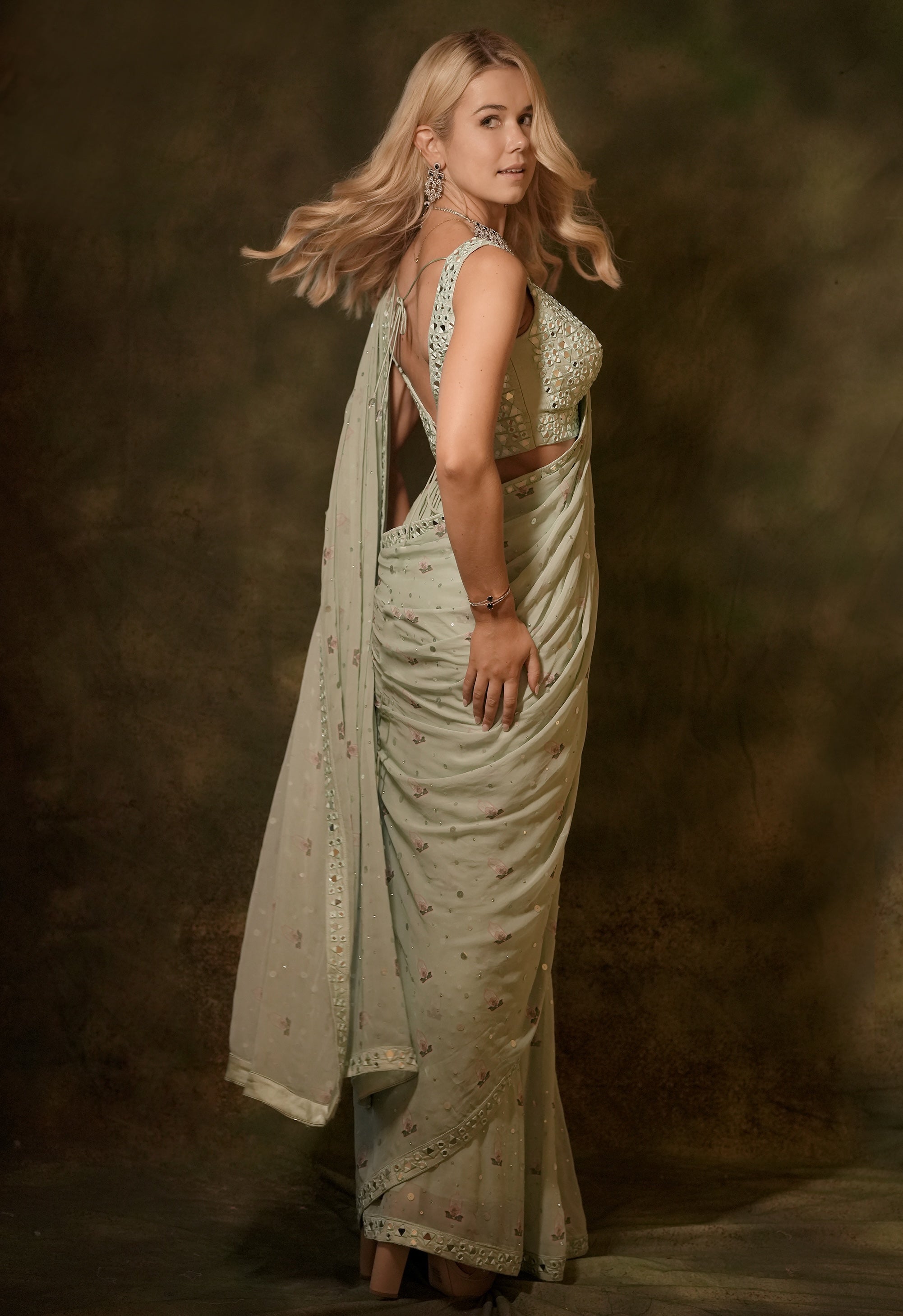 Embrace the enchanting charm of this saree, where pastel green hues are beautifully complemented by dazzling mirror work. The pre-stitched saree features a mirror border and scattered sequins, adding a touch of sparkle. It is paired with a coordinated mirror work blouse for a cohesive look. The ensemble is elevated by a jacket embroidered with intricate mirror work, creating a stunning indo-western fusion. Perfect for making a memorable impression, this outfit blends traditional elegance with contemporary flair.