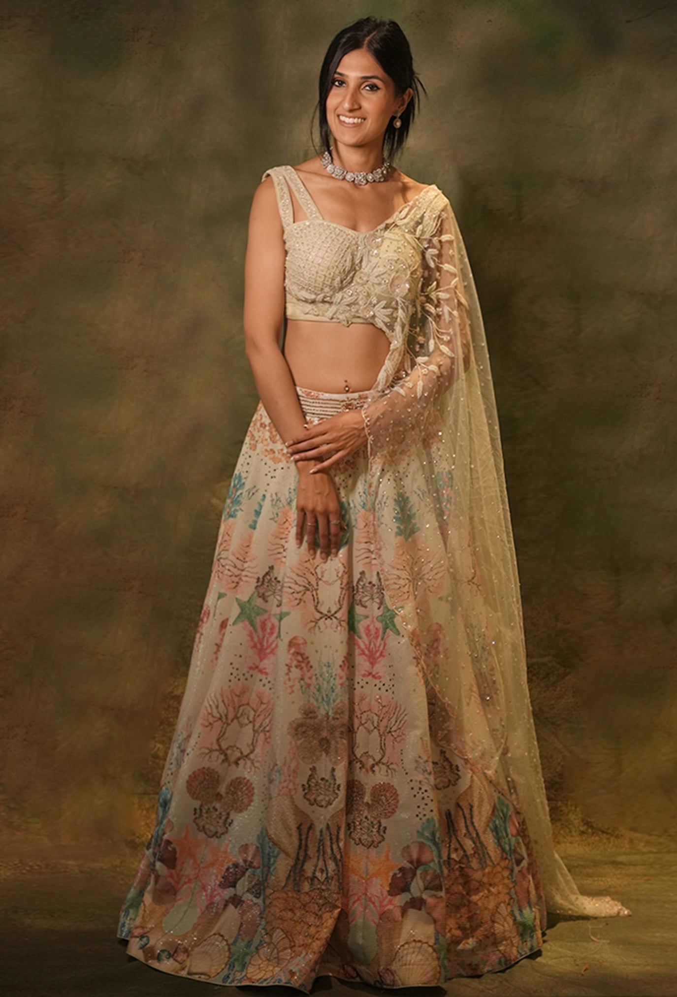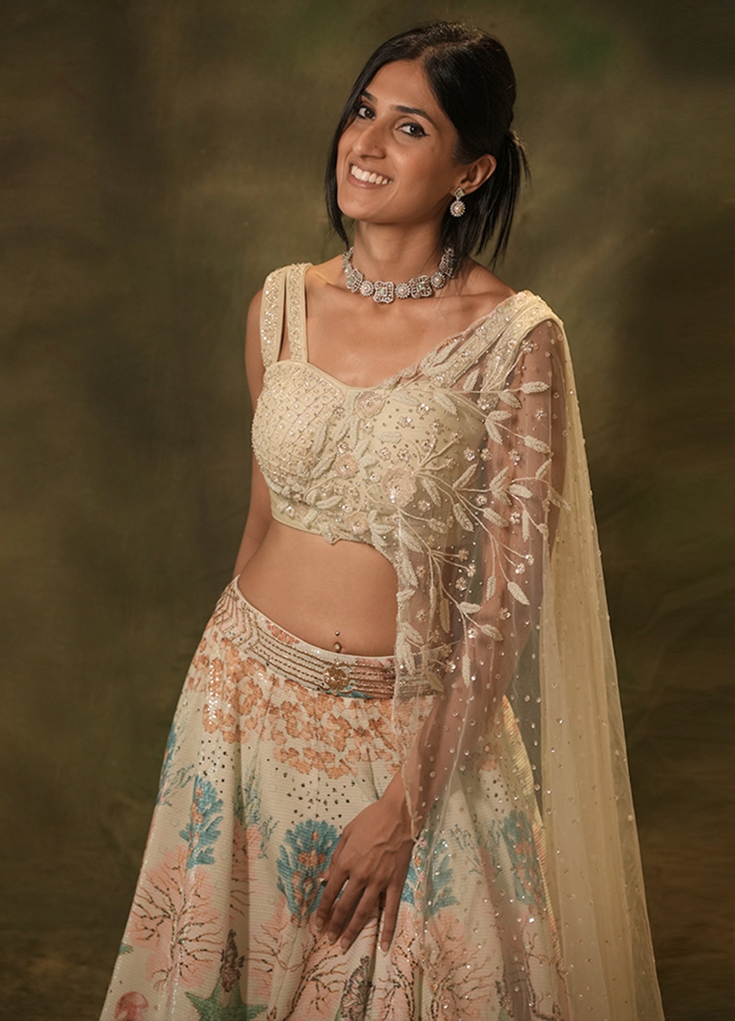 Embroidery: Sequins lehenga highlighted with kasab thread and beads. Blouse hand embroidered with beads, sequins and stones.