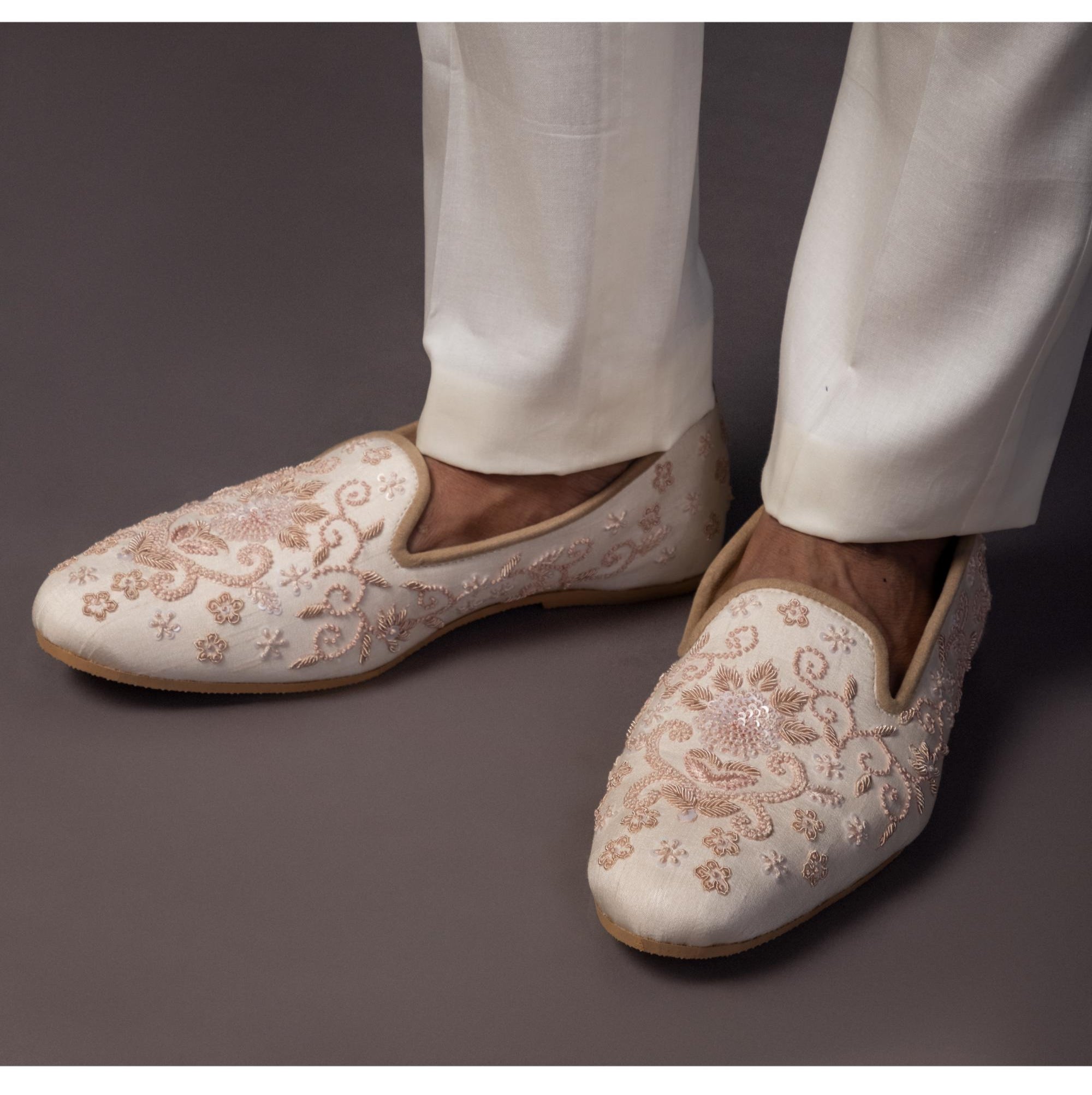 Exude timeless elegance with our Pastel Pink Noble Crest Silk Jutti, exquisitely handcrafted with intricate French knot embroidery and delicate Dabka work. Designed for luxury and comfort, this statement footwear blends heritage craftsmanship with contemporary sophistication, making it perfect for weddings, festive occasions, and regal celebrations. Elevate your ensemble with this opulent fusion of tradition and artistry.