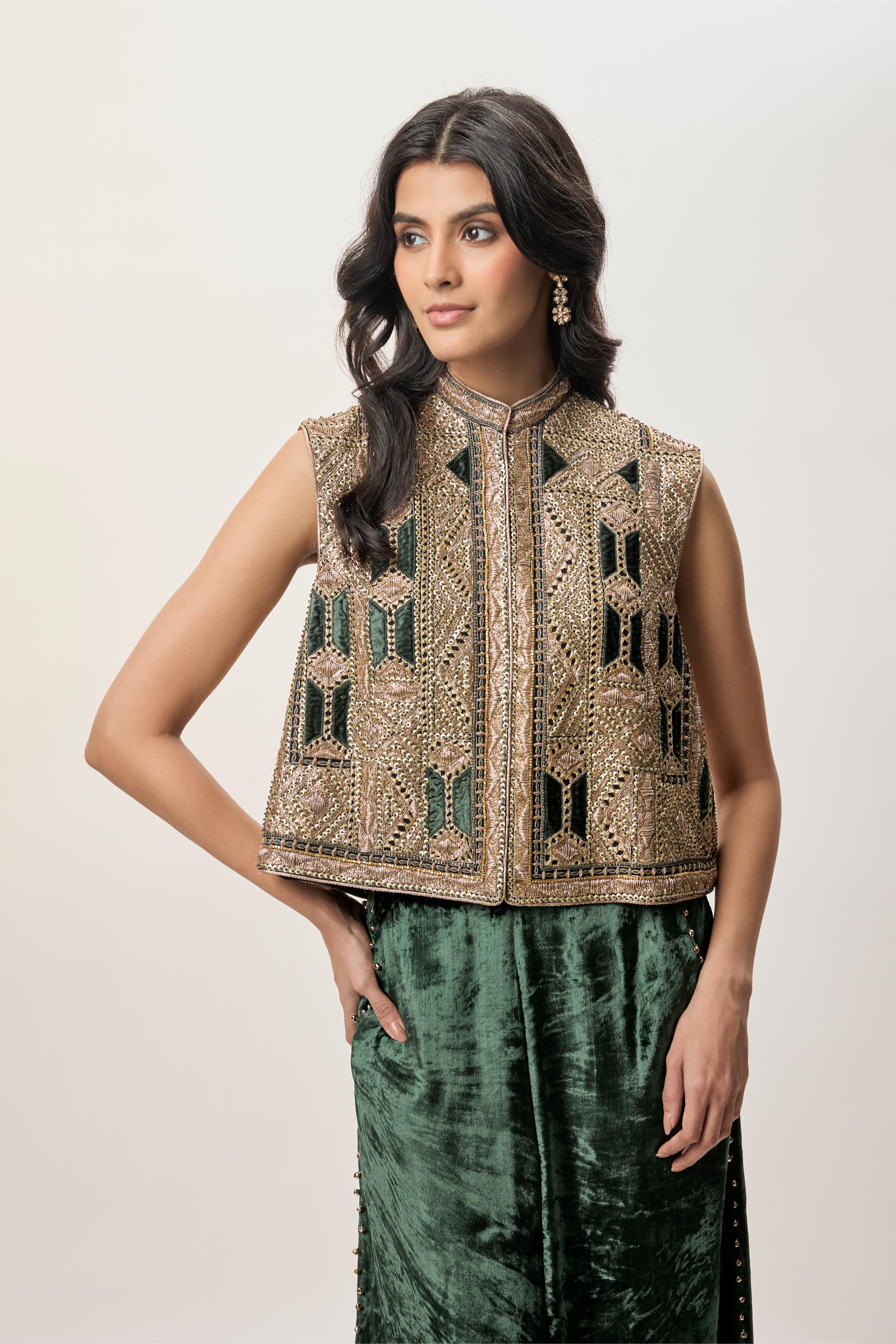 This emerald green jacket set features a georgette embroidered sleeveless jacket with a structured high neckline. Designed to elevate festive dressing, the jacket set is paired with velvet balloon pants finished with bead edging. The contrast of textures enhances the richness of this jacket set. Comfortable yet striking, this jacket set is ideal for evening celebrations and modern festive occasions. With refined detailing and strong silhouettes, this jacket set offers standout elegance.
