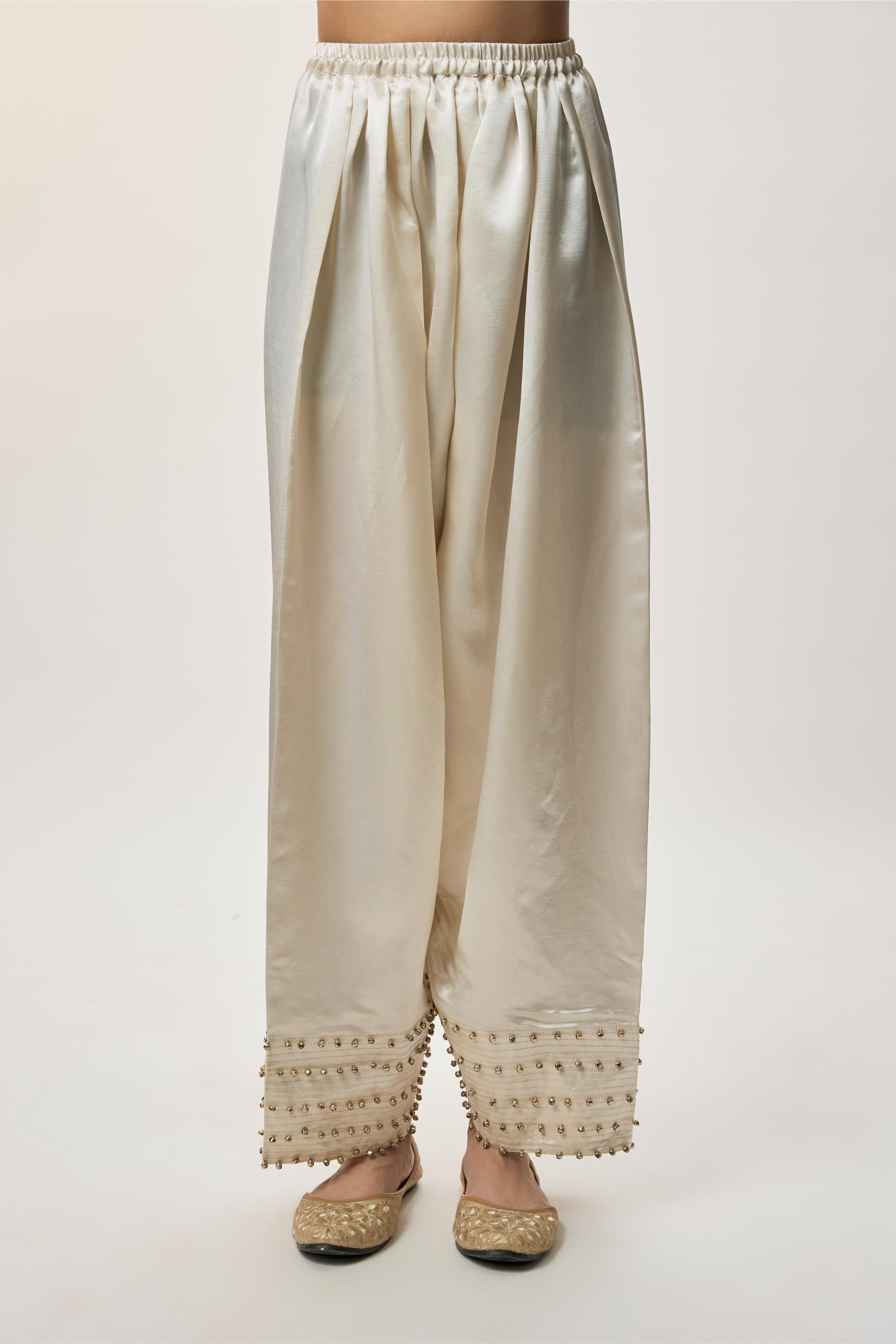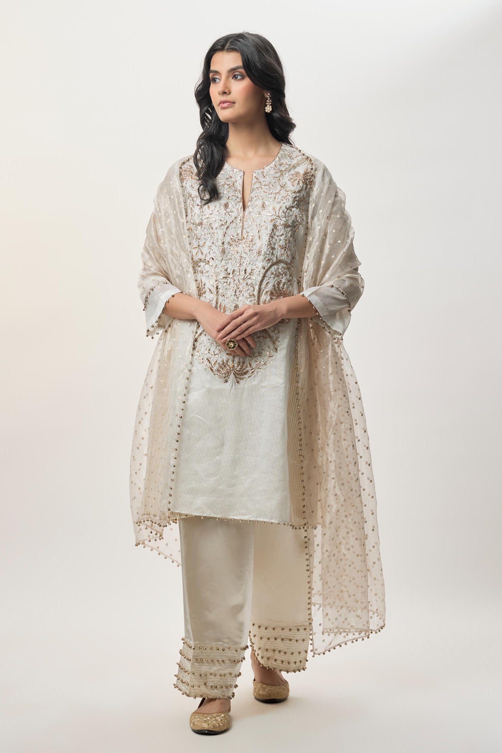 This beige kurta set is crafted for elegant festive occasions and formal gatherings. The silver-gold stripe tissue kurta features an embroidered yoke that adds refined detail, while the farshi salwar lends volume and traditional charm. Finished with a butti organza dupatta, this kurta set is ideal for weddings, festive evenings, and cultural celebrations. Designed for understated luxury, it reflects graceful sophistication.