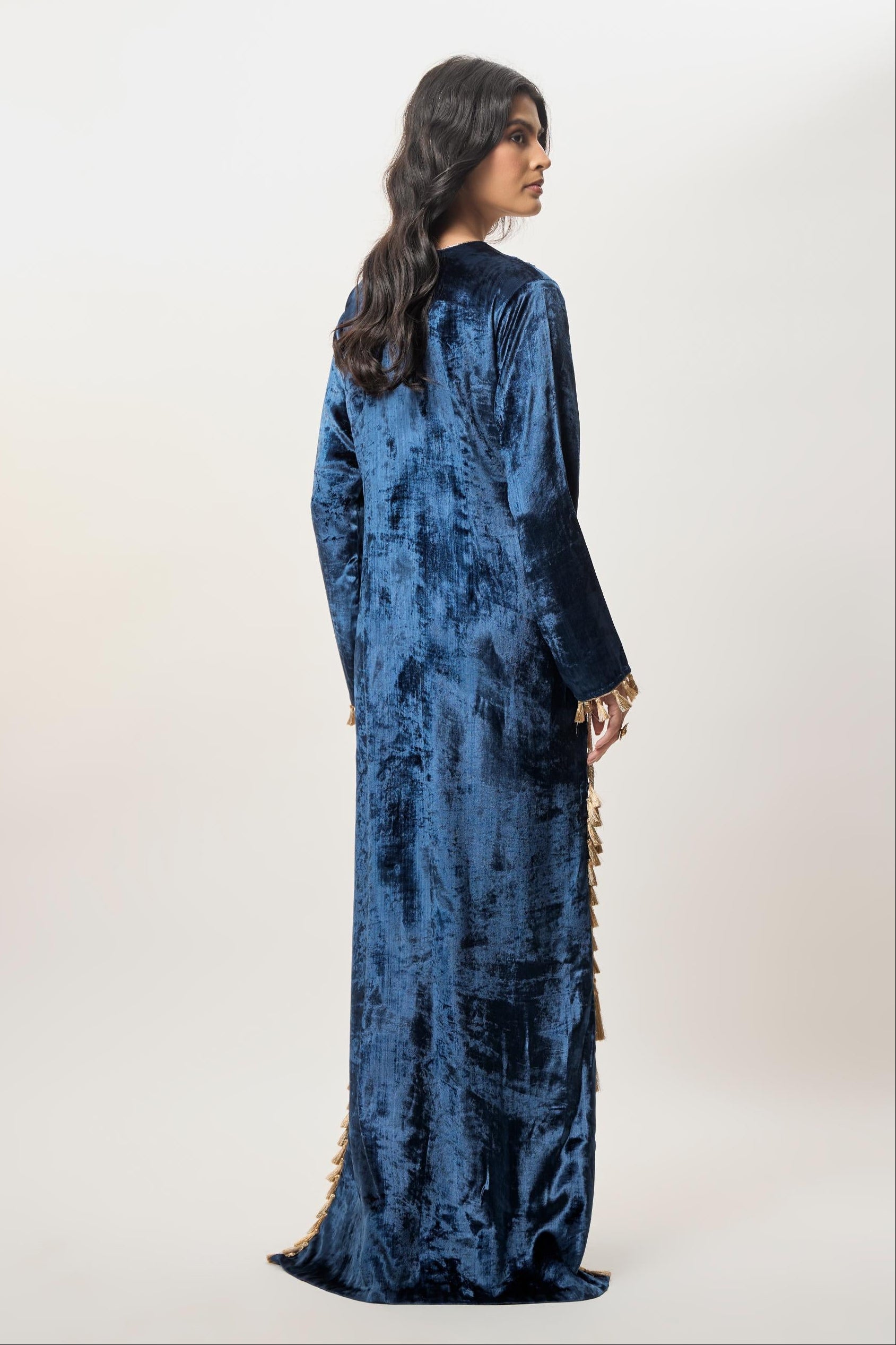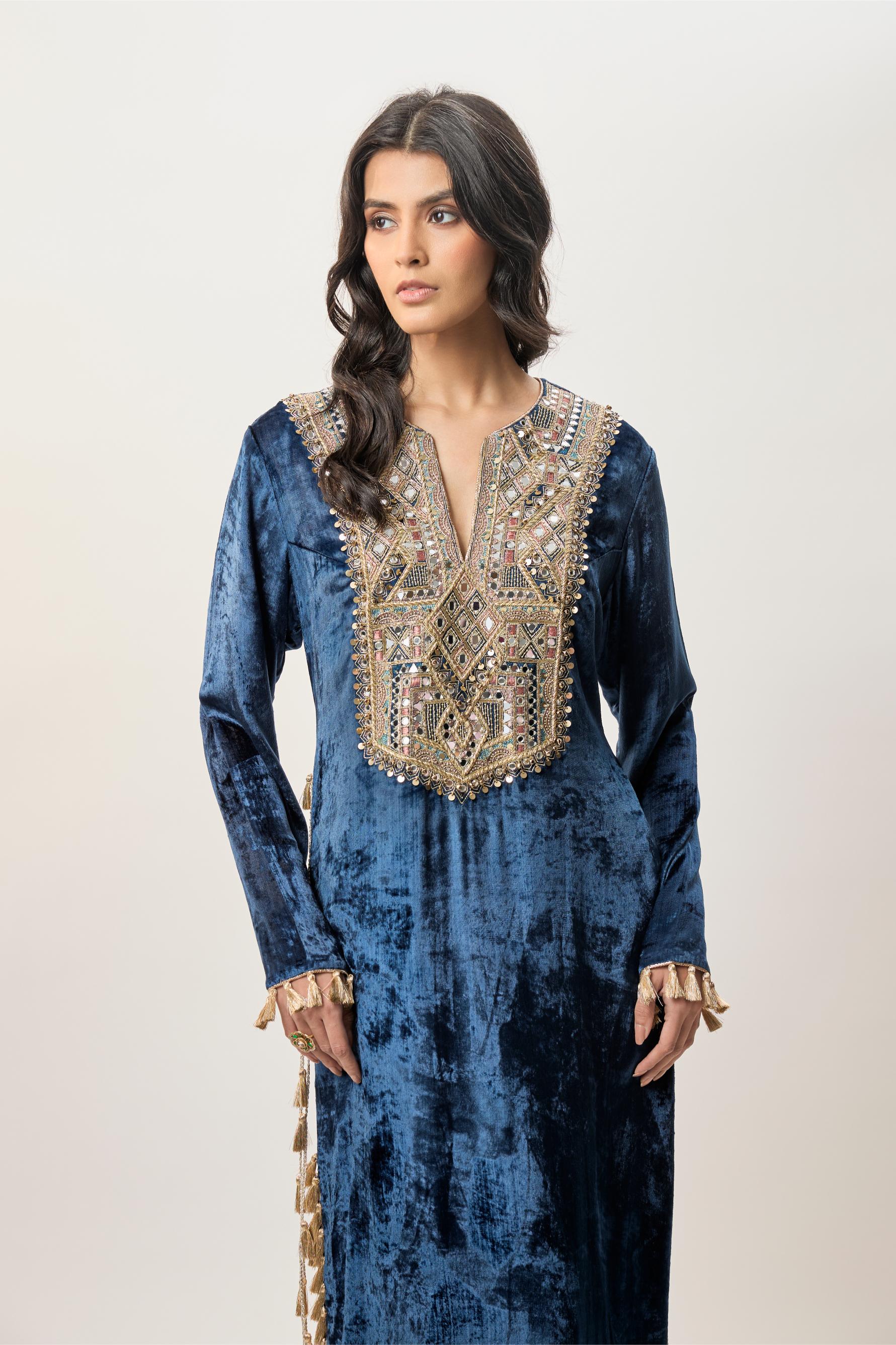 The Tara navy blue embroidered kaftan set is created for modern festive dressing with effortless elegance. Featuring a straight silhouette and rich velvet texture, this kaftan is ideal for cocktail evenings, festive dinners, and destination celebrations. The embroidered yoke adds definition, while tassel detailing along the side slit brings movement and flair. Designed for comfort without compromising style, this kaftan set offers a contemporary yet festive presence.
