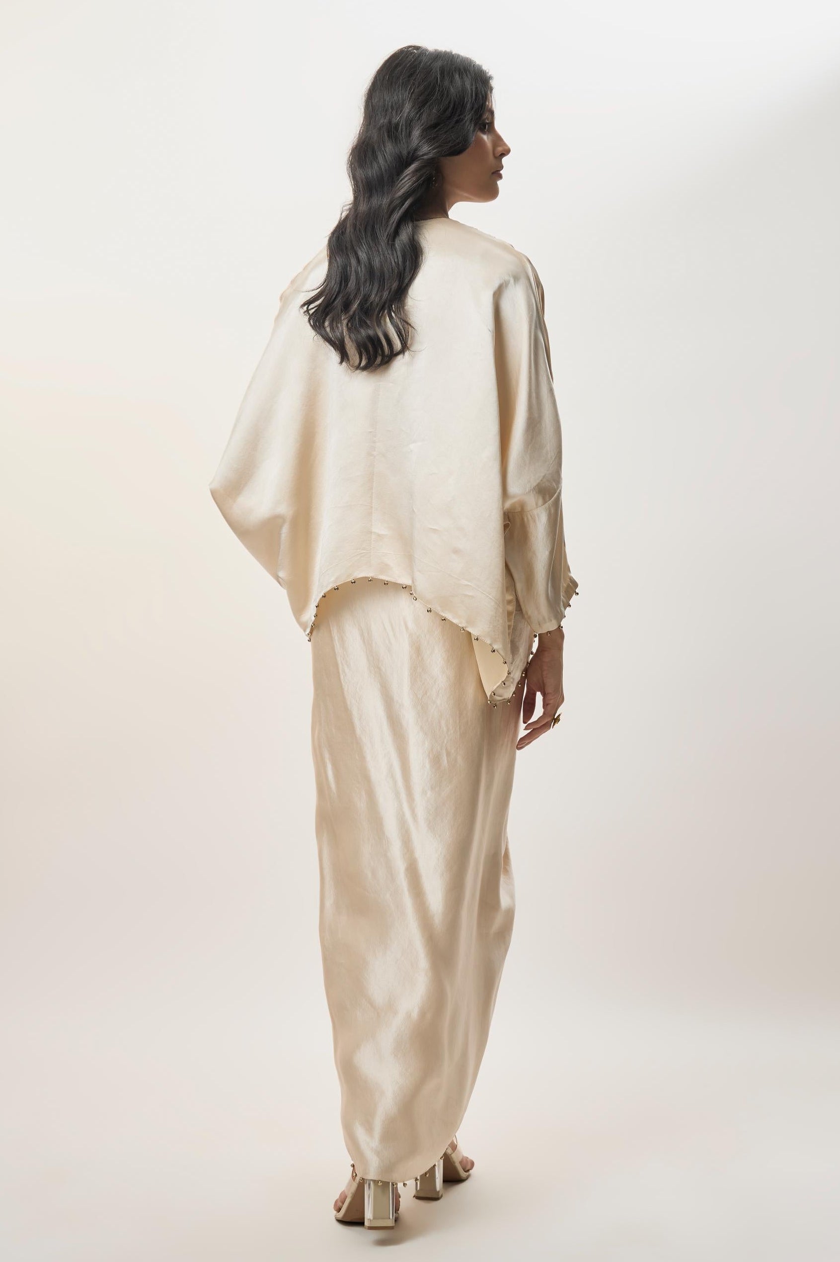 This beige champagne lungi skirt set is curated for contemporary festive dressing with a relaxed yet elevated aesthetic. The embroidered yoke top brings artisanal richness through multicolour detailing, while the lungi-style skirt offers a fluid drape that moves effortlessly. Designed for intimate celebrations, festive lunches, and cultural gatherings, this lungi skirt set blends comfort with visual elegance. The asymmetric hem adds modern character, making it ideal for women seeking statement silhouettes without heaviness. Whether styled for daytime festivities or evening occasions, this lungi skirt set reflects Payal Singhal’s signature balance of ease and craftsmanship.