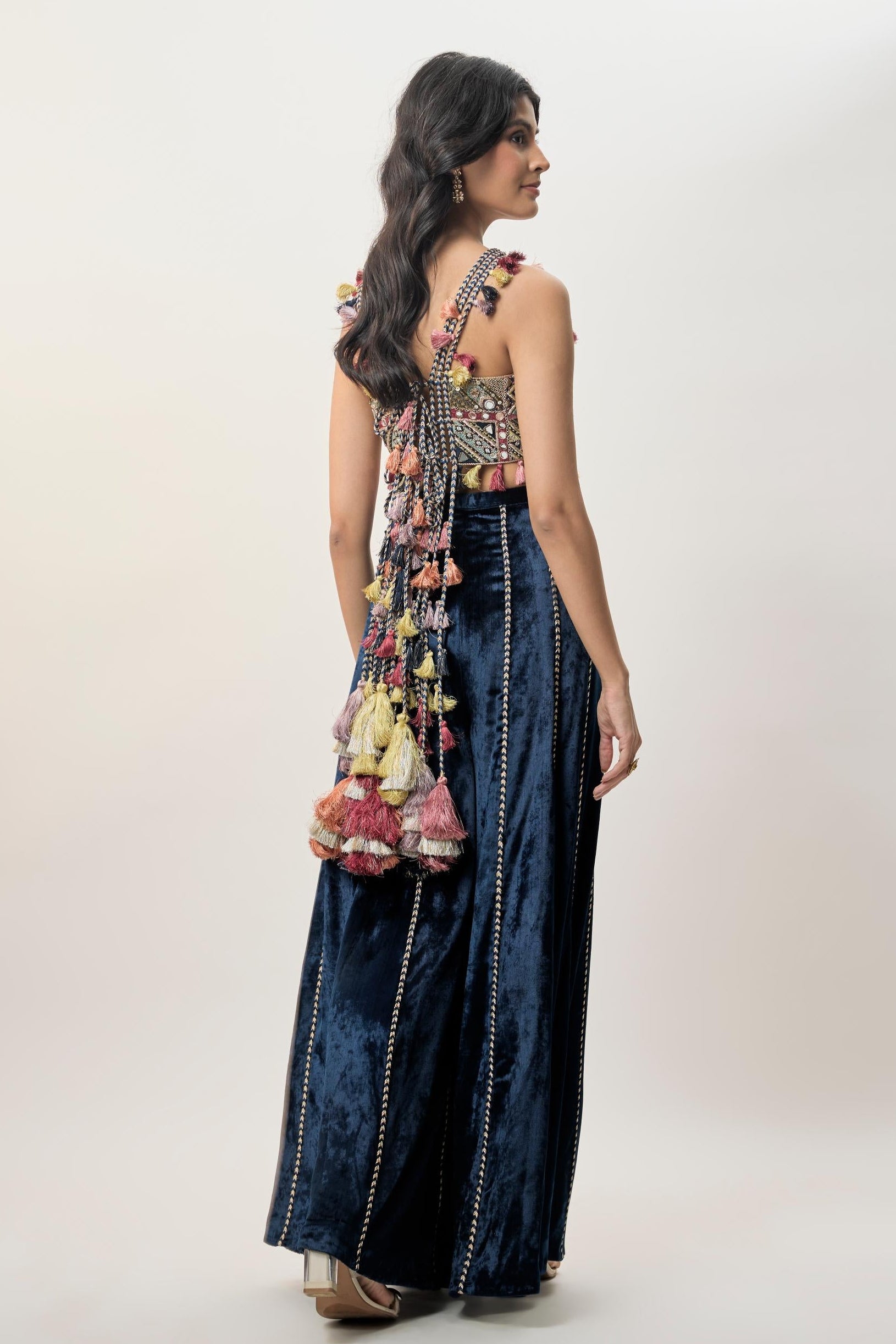 The Yasmin navy blue embroidered sharara set is designed for elegant evening celebrations and wedding festivities where refined glamour is key. The mirror-embroidered choli adds depth and sparkle, while the tassel detailing at the waist introduces graceful movement. Paired with a plush velvet sharara, this ensemble balances structure with fluidity, making it ideal for sangeet nights, cocktail functions, or festive receptions. The rich navy hue enhances the detailing, ensuring the look remains timeless yet striking. This sharara set is perfect for those who appreciate classic silhouettes elevated through thoughtful craftsmanship.