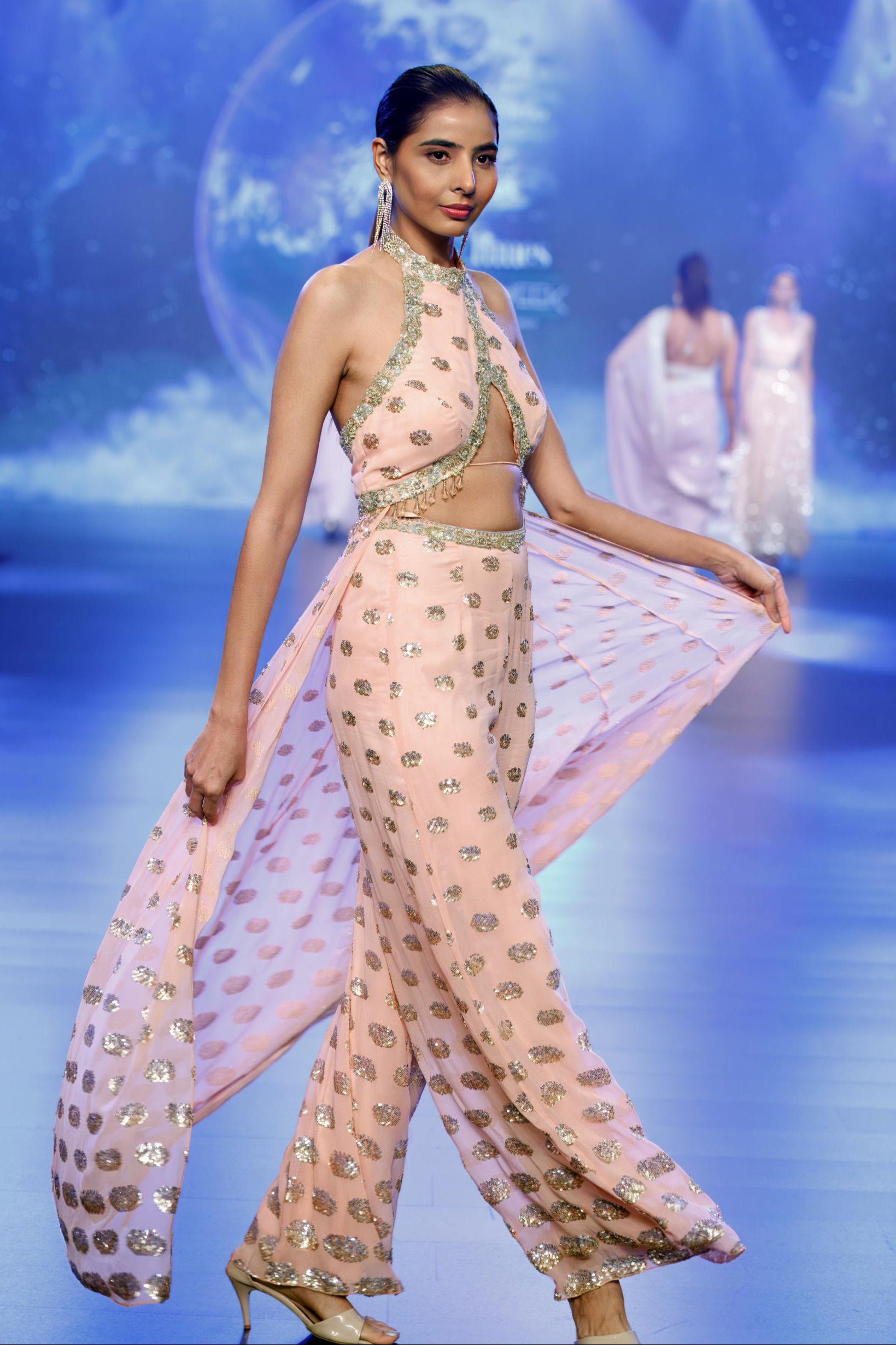 The Peach Georgette Gold/Silver Sequin Burst Top and Palazzo set is a dazzling combination of elegance and contemporary style. The top features a striking sequin burst design in gold and silver, creating a radiant, eye-catching effect. Paired with matching georgette palazzo pants, this ensemble offers a comfortable yet chic silhouette. Ideal for festive occasions, parties, or evening events, it effortlessly blends glamour and sophistication, making you the center of attention at any celebration.