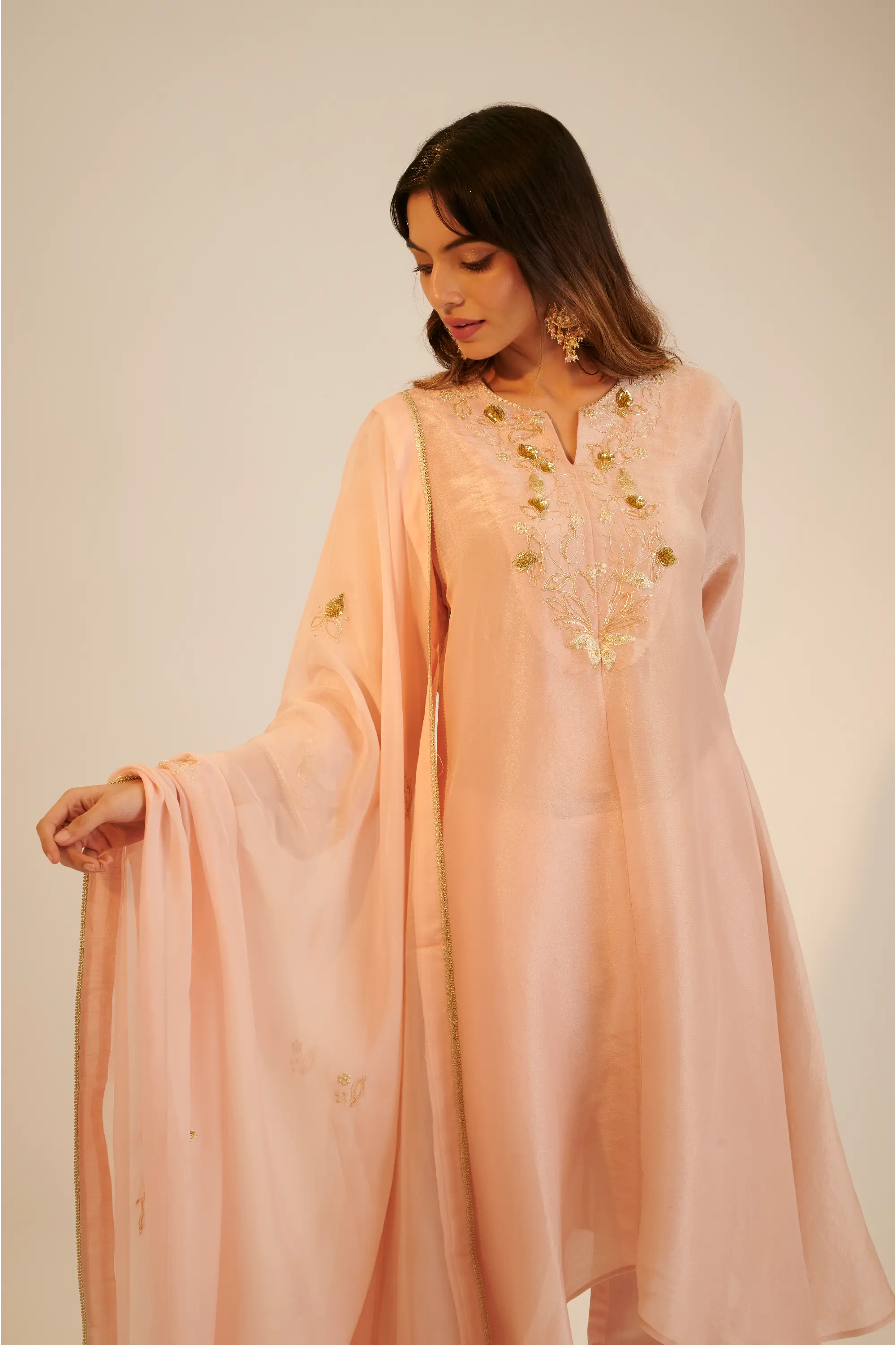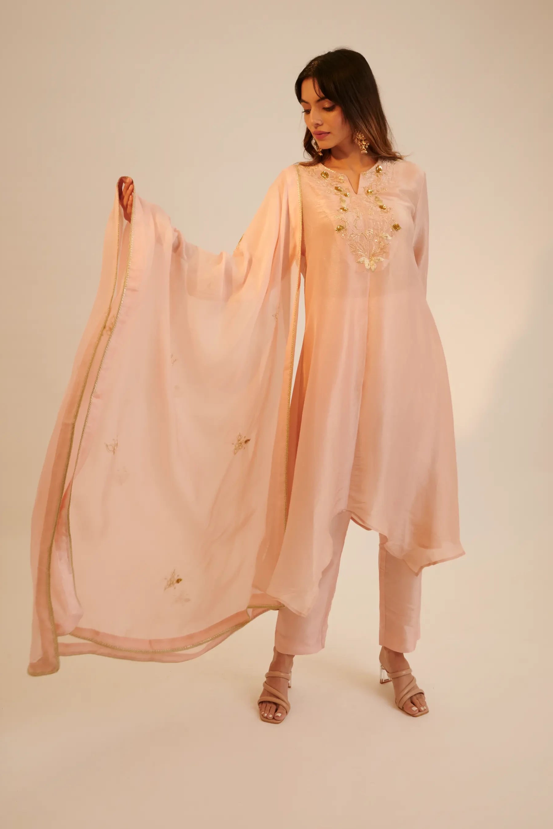 Peach embroidered asymmetric kurta paired with pants and dupatta