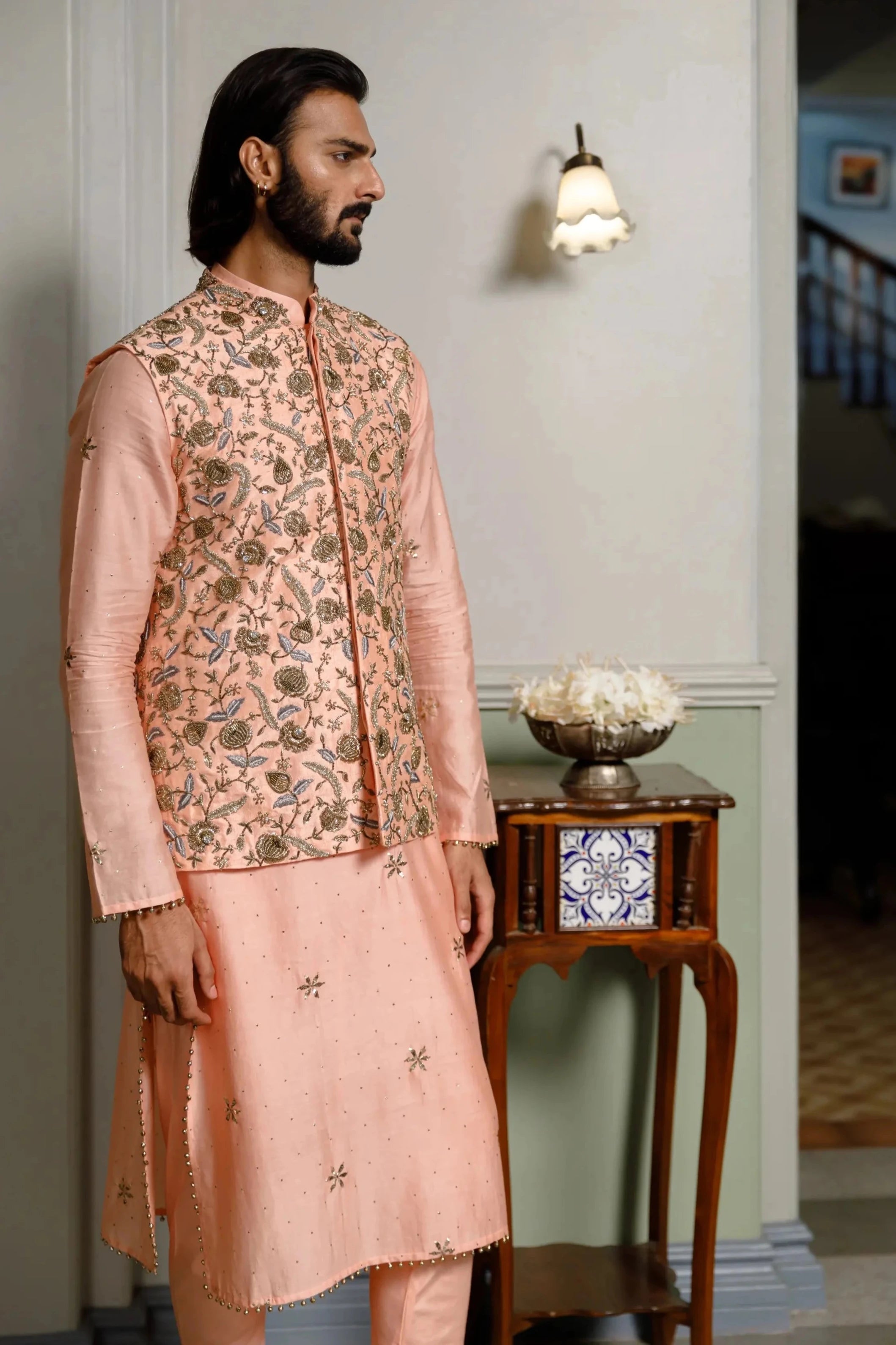 The Peach Embroidered Bandi paired with a classic kurta and comfortable cotton silk churidar creates an effortlessly stylish ensemble. The intricate embroidery on the bandi adds a touch of luxury, while the soft cotton silk churidar ensures a perfect fit and comfort. Ideal for weddings, festivals, or formal occasions, this set combines traditional elegance with modern sophistication.
