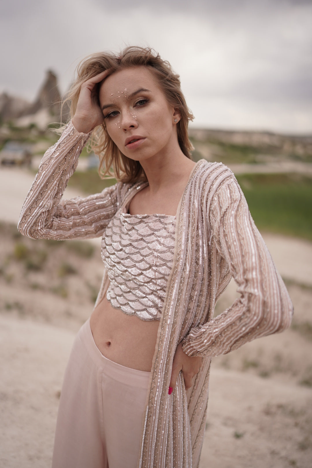 This chic ensemble features a scallop blouse with delicate sequin embroidery, offering a refined and elegant look. The jacket and pant are both adorned with vertical sequin detailing, adding a touch of sparkle and sophistication to the outfit. Perfect for formal events, this combination blends intricate craftsmanship with modern style for a glamorous and polished appearance.